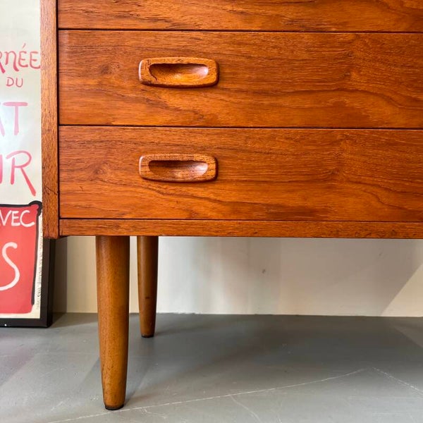 Mooi vintage ladekastje, uitgevoerd in teak (fineer) met vakkundig gevormde handgrepen en slanke conische pootjes.