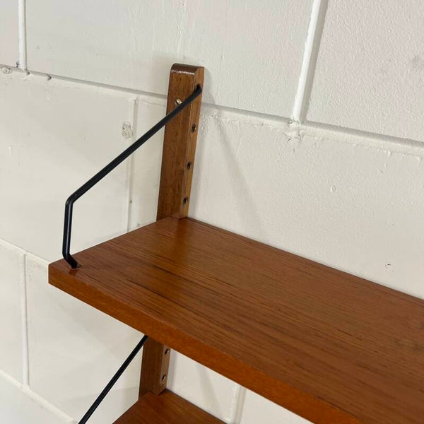 Uitgevoerd in teak (fineer) met houten wandlatten en zwart metalen beugels.