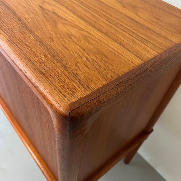 Hoge kwaliteit en schitterend vakmanschap, uitgevoerd in teakhout (massief / fineer) met mooi gevormde handgrepen en slanke conische poten.