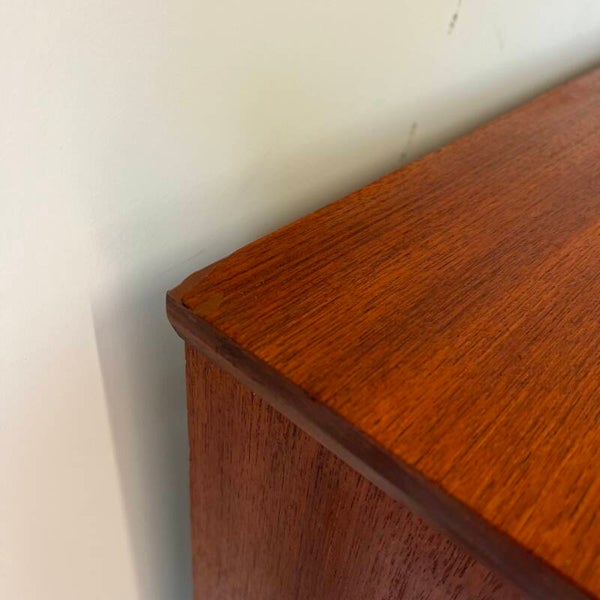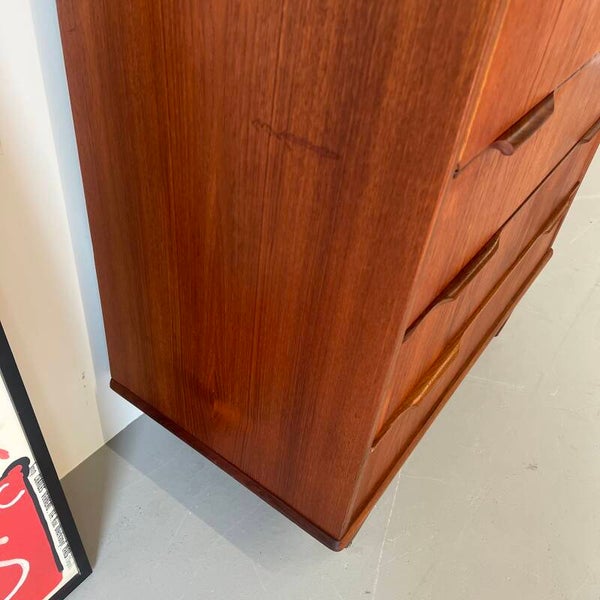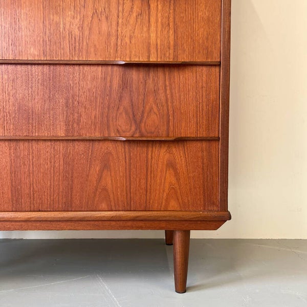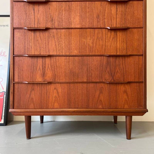 Hoge vintage ladekast, uitgevoerd in teak (fineer) met mooi gevormde grepen en slanke conische poten.