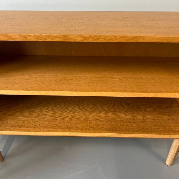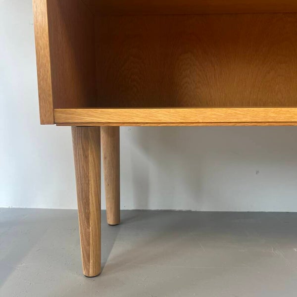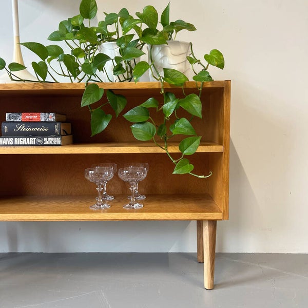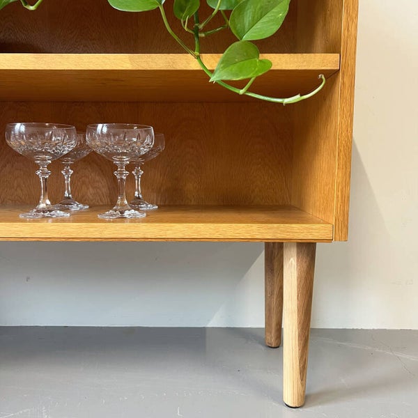 Leuk open boekenkastje, uitgevoerd in eiken (fineer) en op slanke conische pootjes (later toegevoegd).