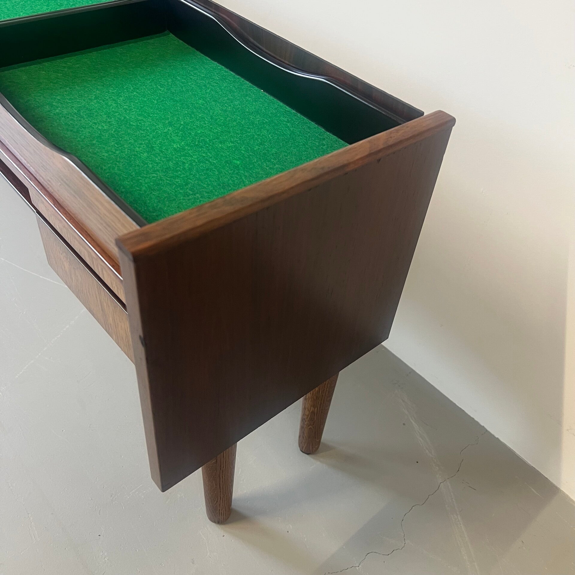 Bovenop liggen 3 bakjes met groen vilten inleg, handig voor sleutels, kleingeld etc.
