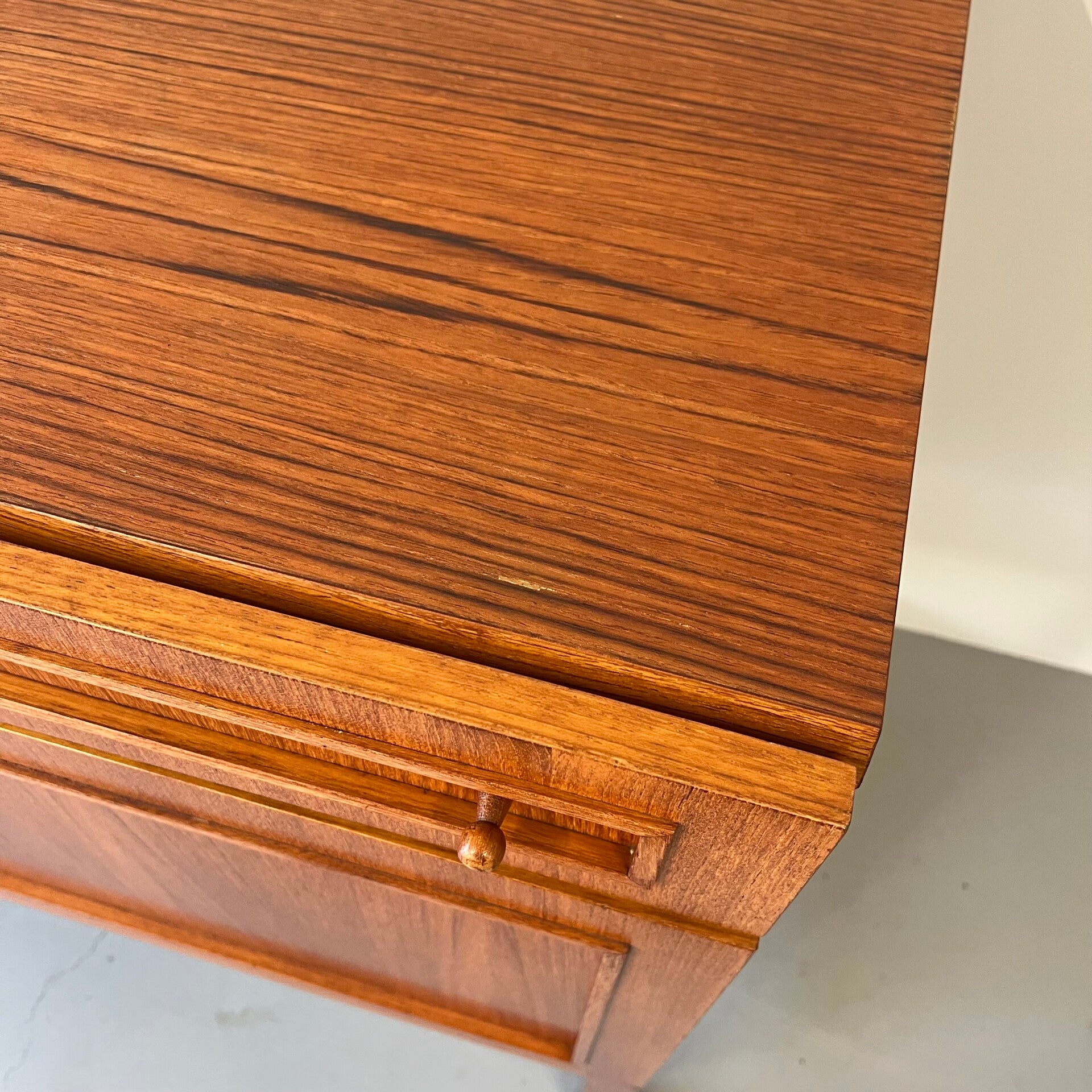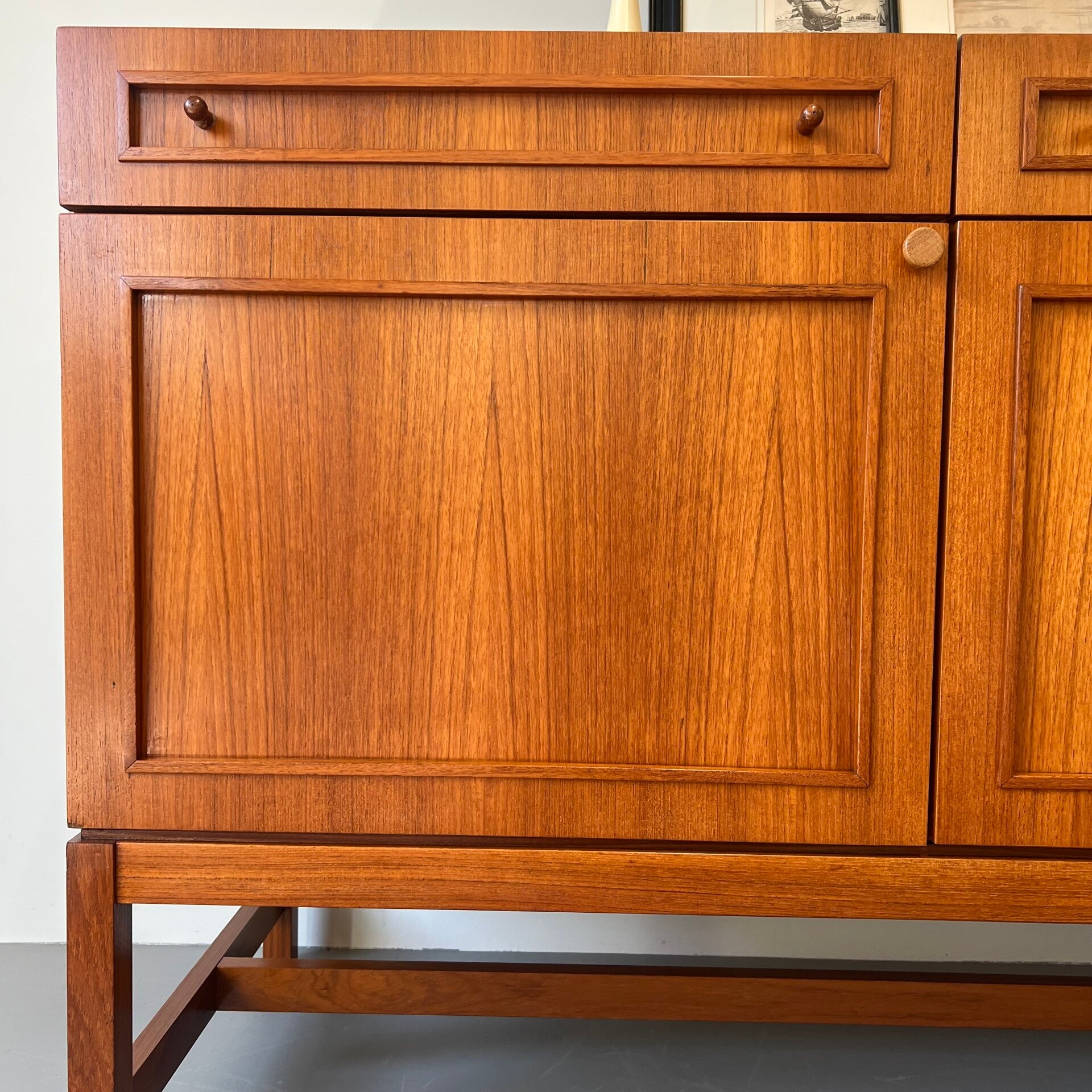 Uitgevoerd in hoogwaardig fineerhout (teak) van natuurlijke oorsprong met mooie paneeldeuren en luchtig onderstel.
