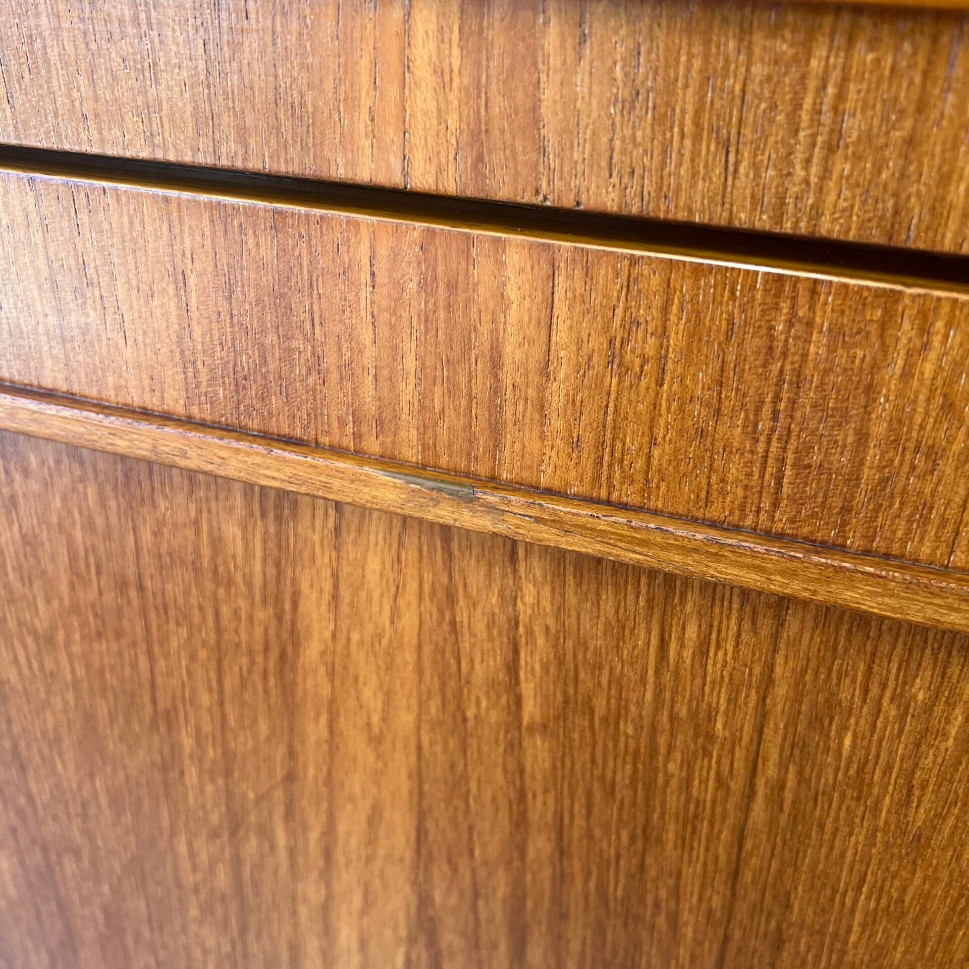 Het blad is geschuurd en voorzien van meerdere lagen beschermende olie. Het dressoir is verder gereinigd en opnieuw in de olie gezet.