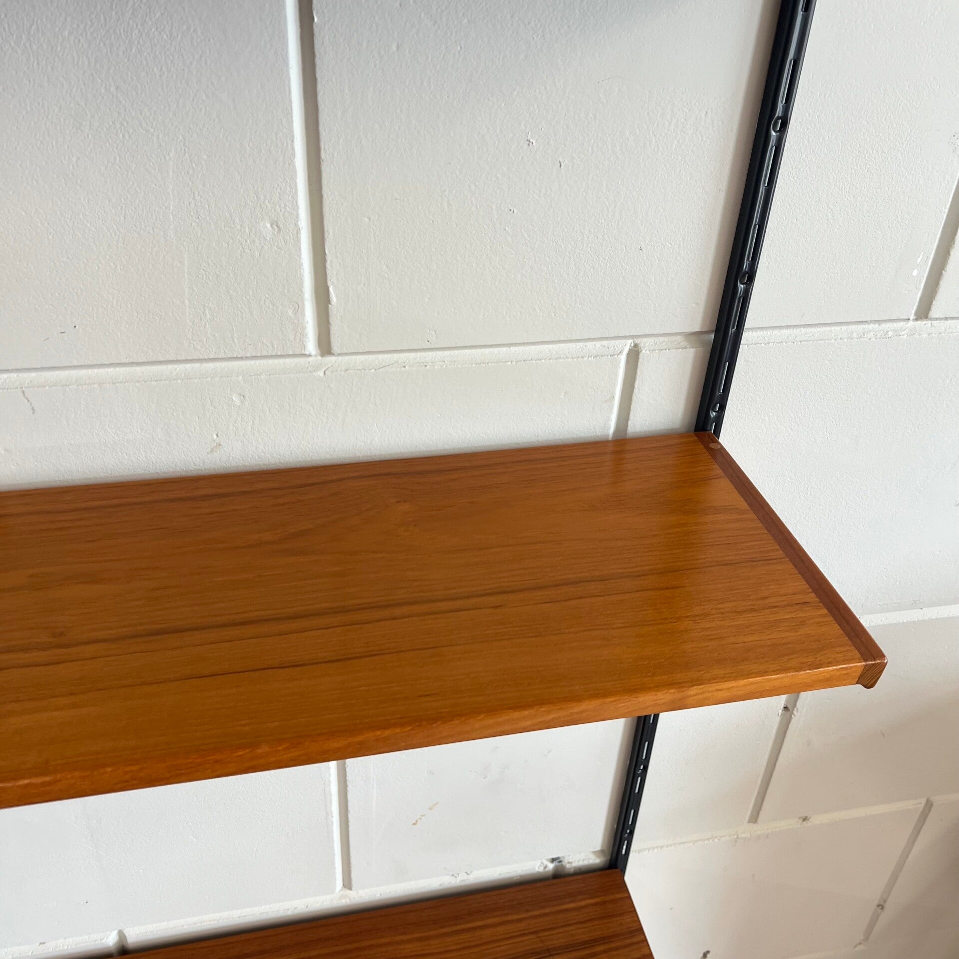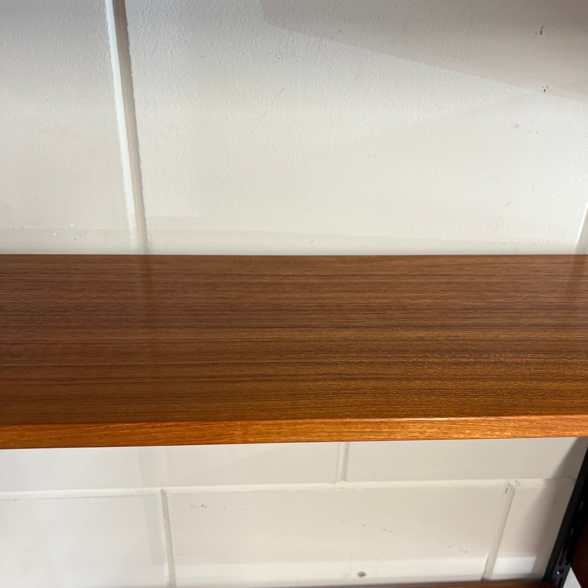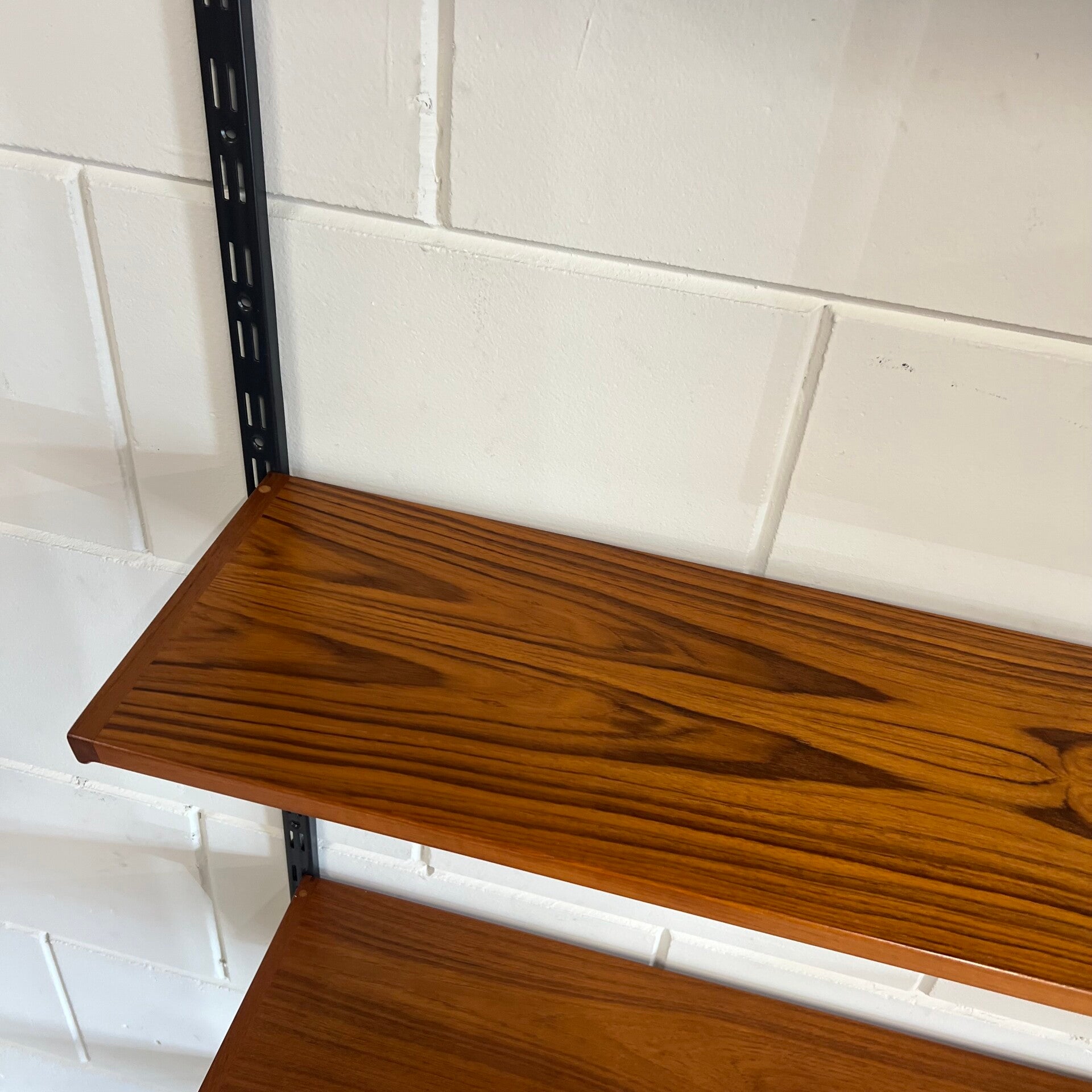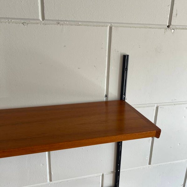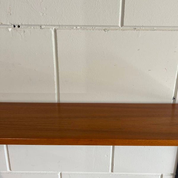 Uitgevoerd in teak met zwart metalen wandlatten.