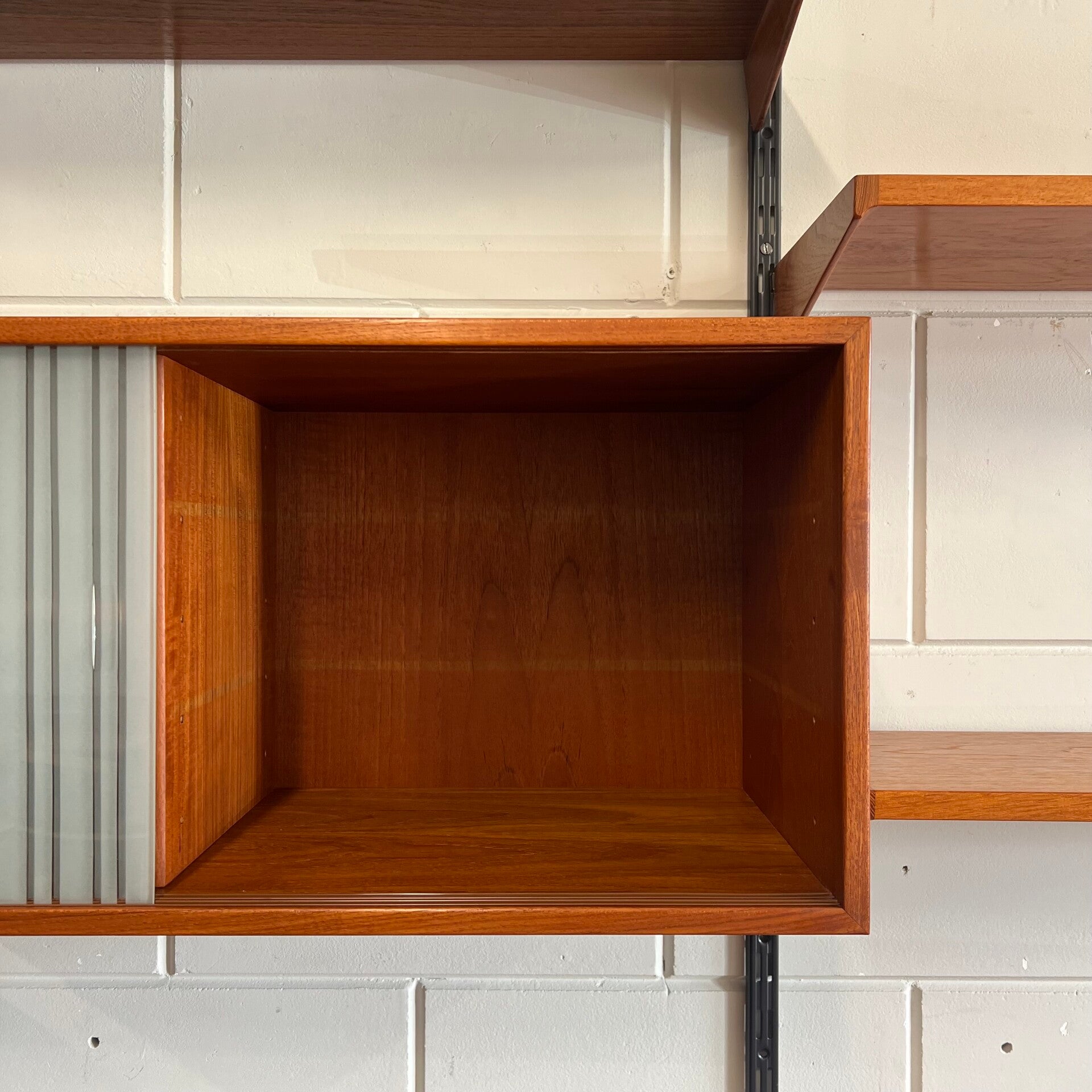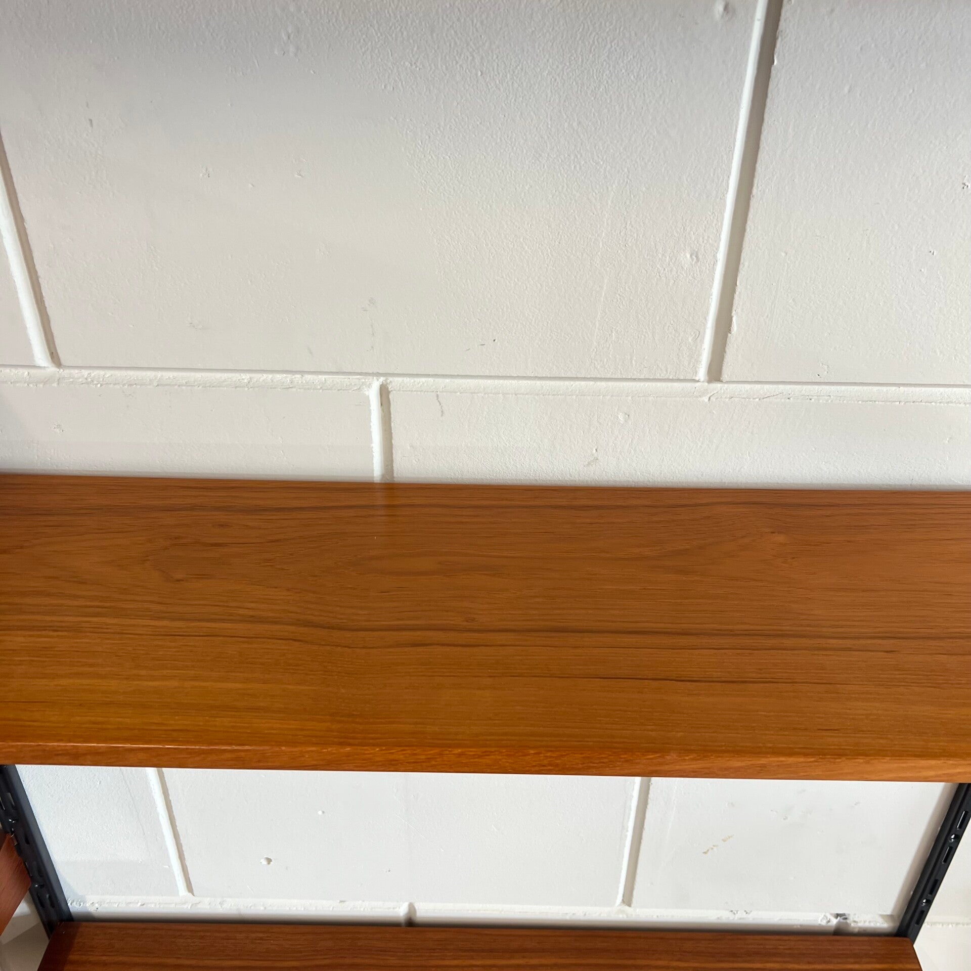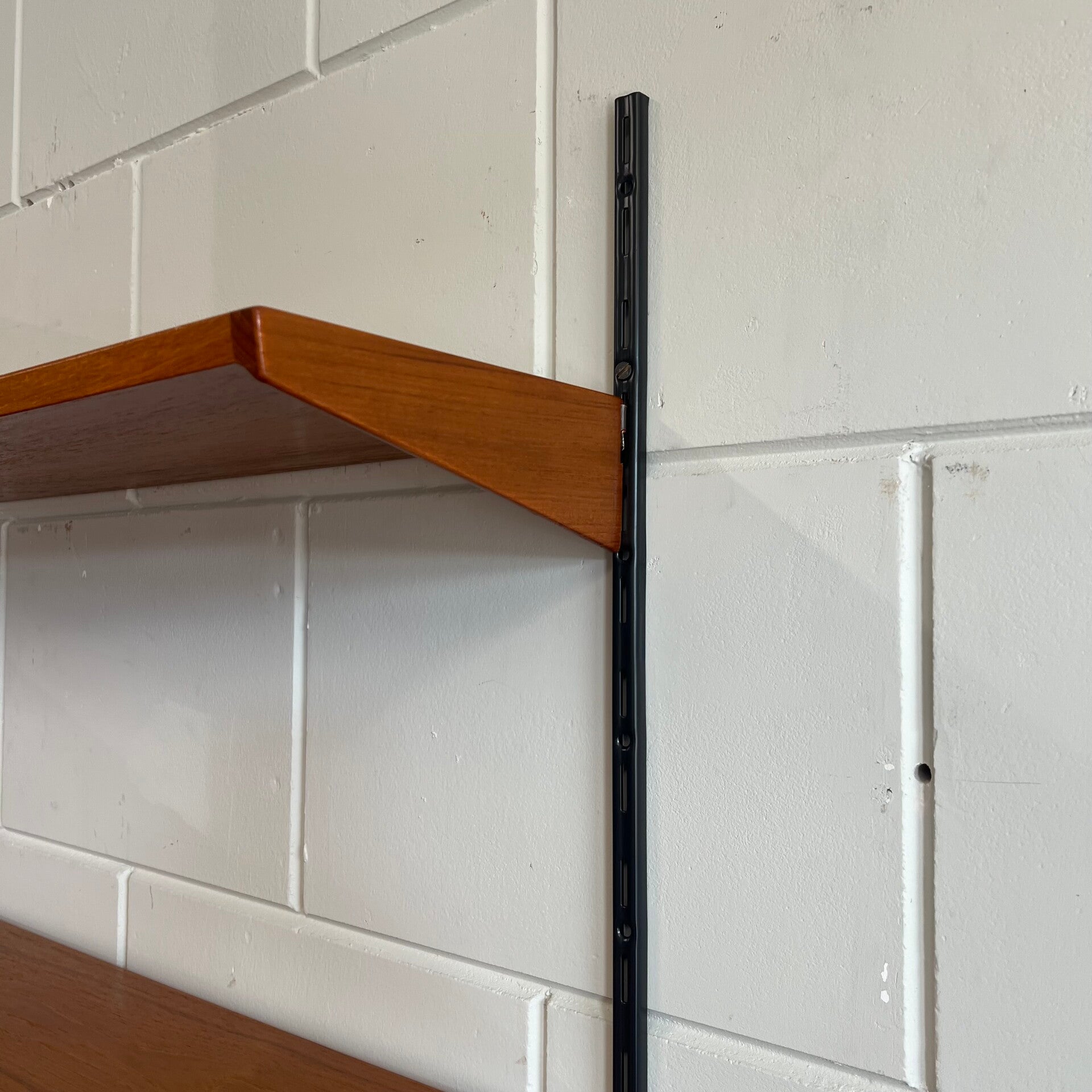 Uitgevoerd in teak met zwart metalen wandlatten.