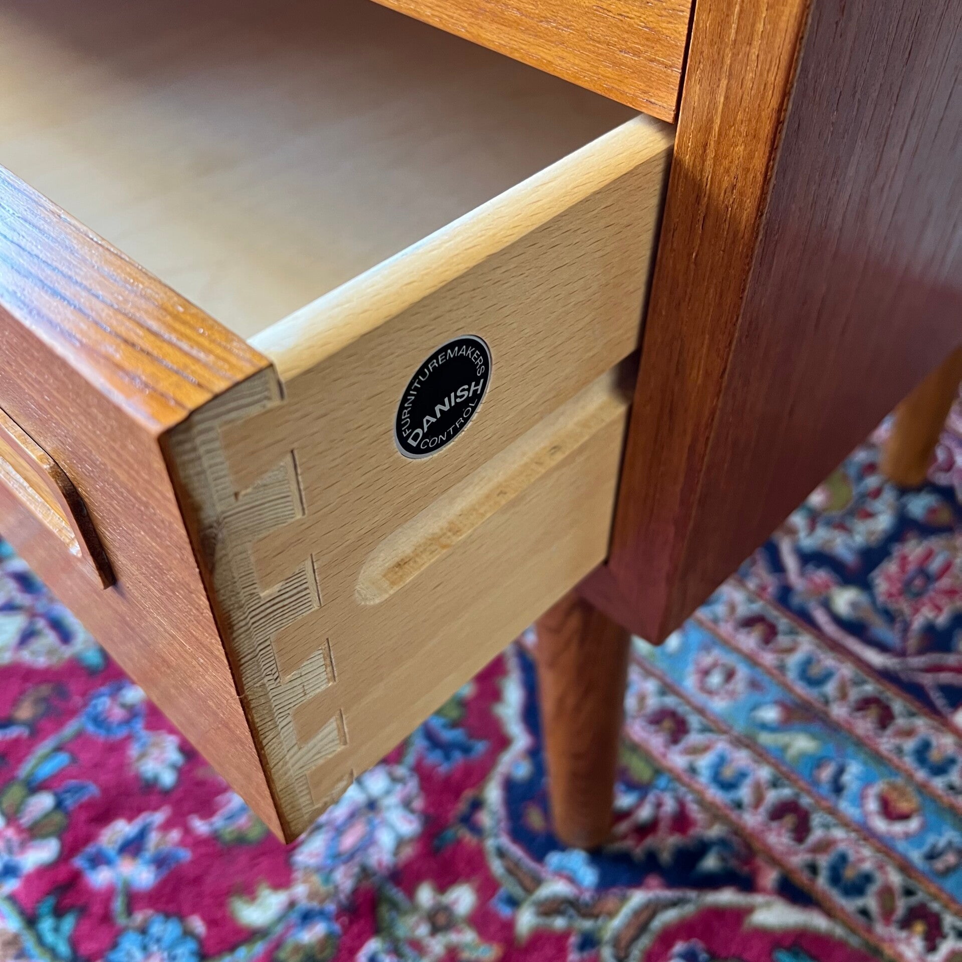 Uitgevoerd in teak (fineer) en op slanke conische poten (later toegevoegd).