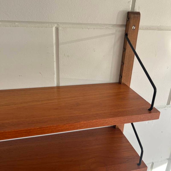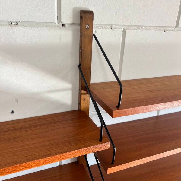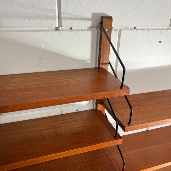 Uitgevoerd in teak (fineer) met houten wandlatten en zwart metalen beugels.