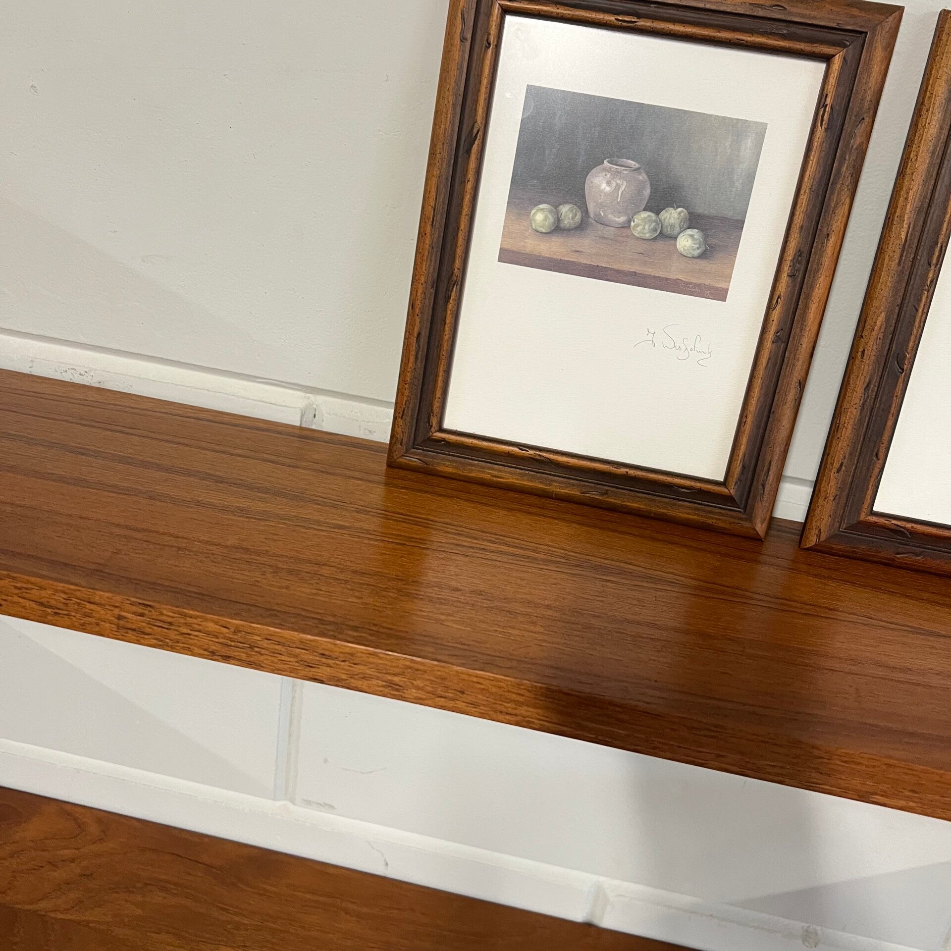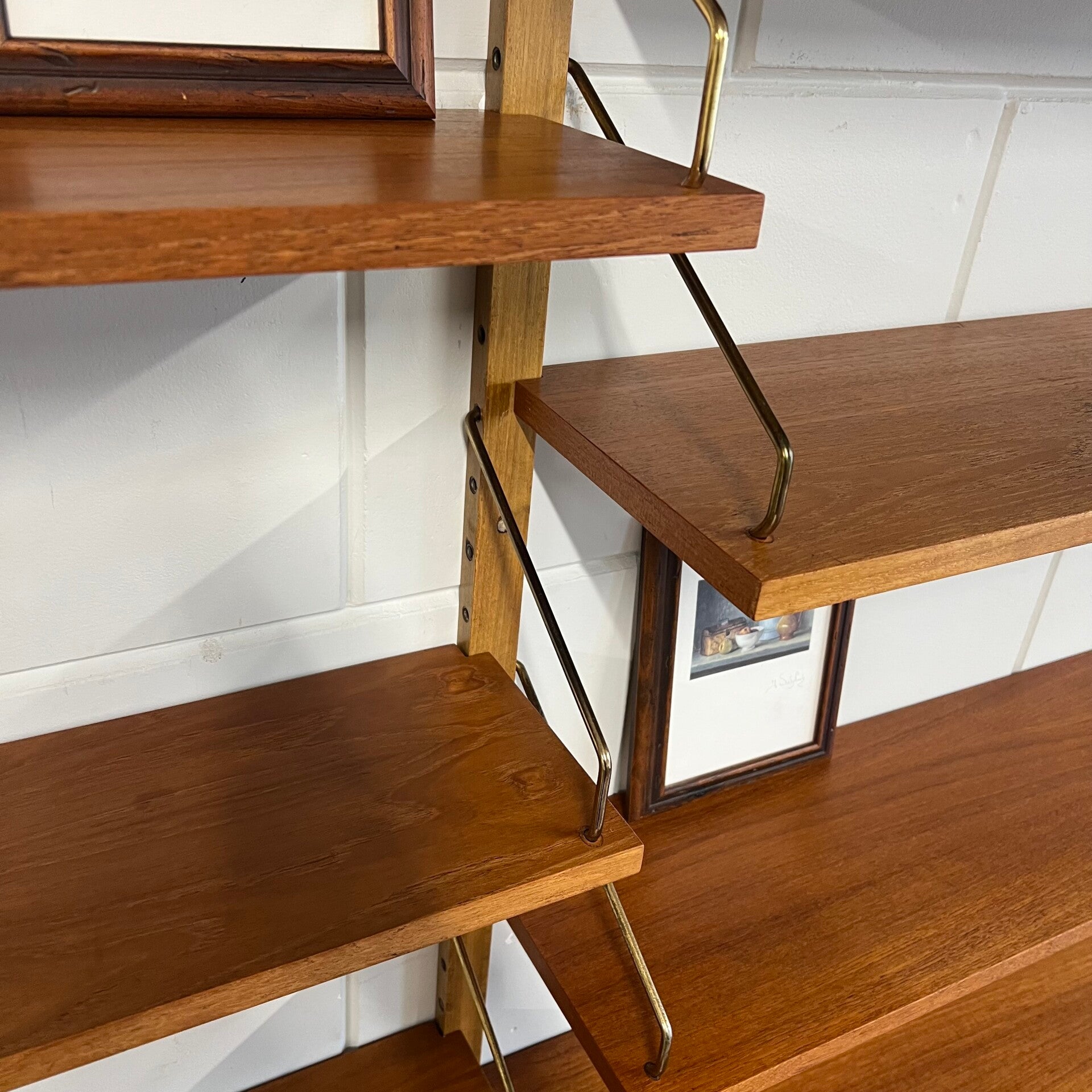 Uitgevoerd in teak (fineer) met houten wandlatten en bijzondere messing beugels.