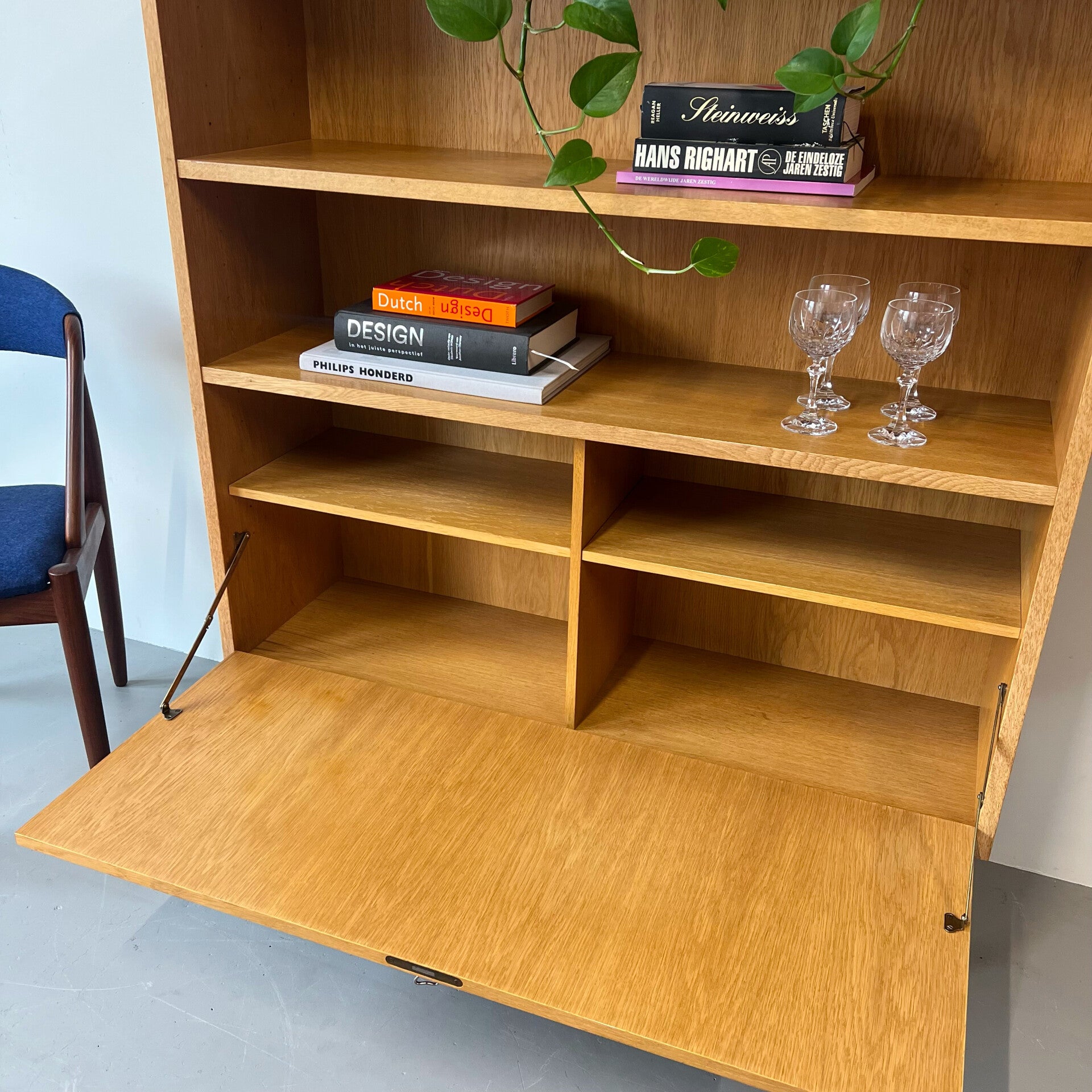 Leuk open boekenkastje of klepkast, uitgevoerd in eiken (fineer) en op slanke conische pootjes (later toegevoegd).