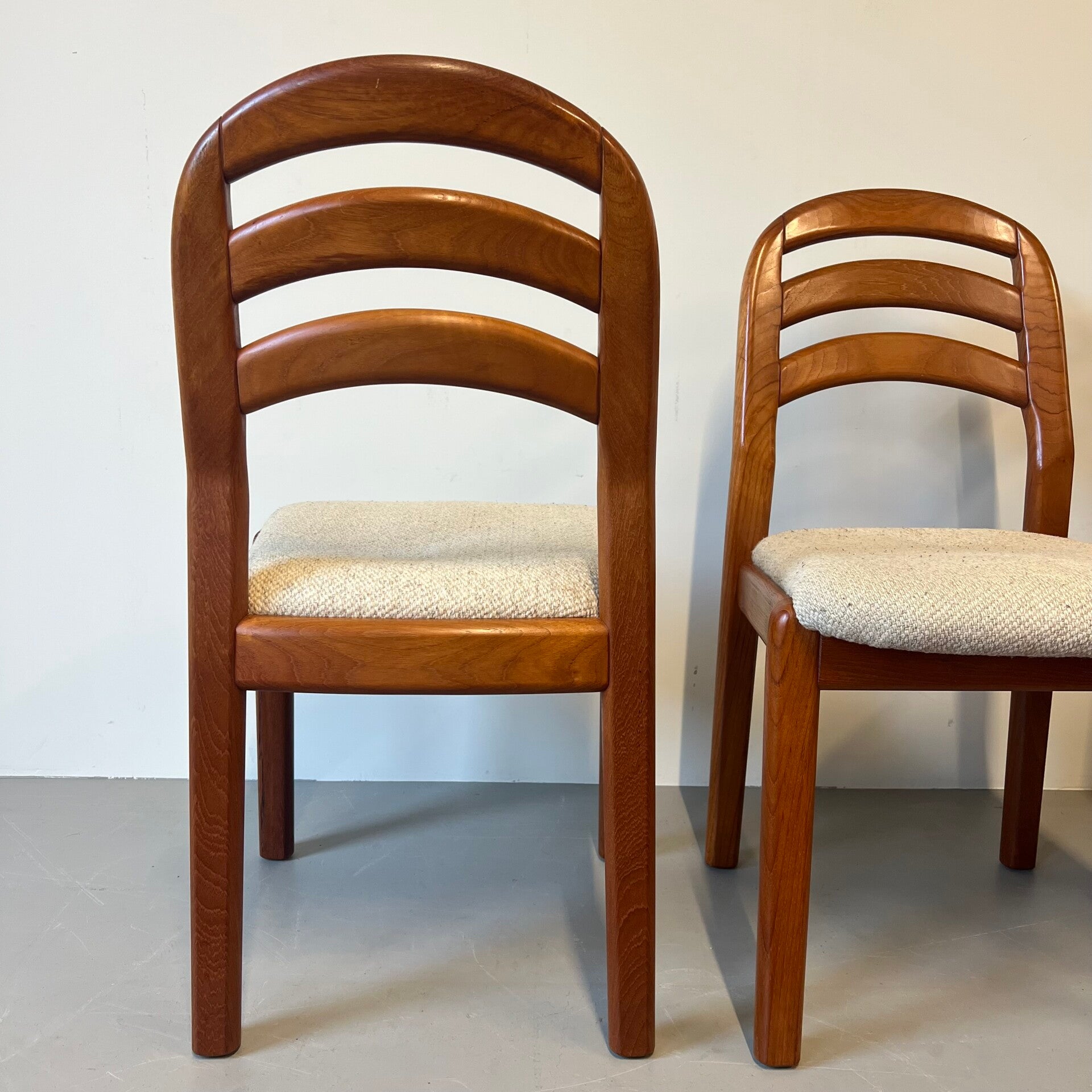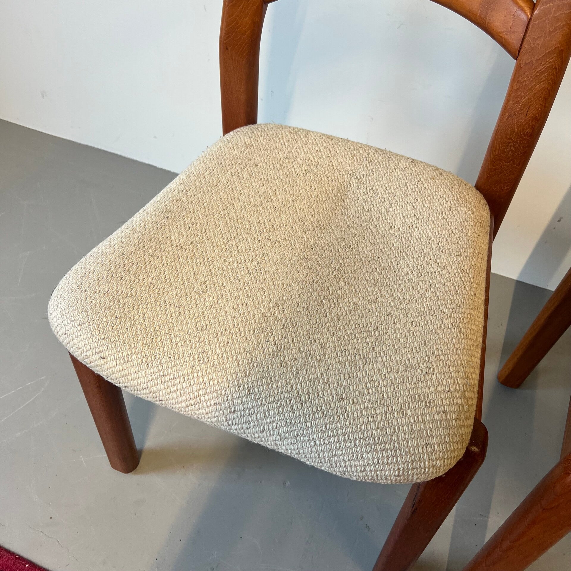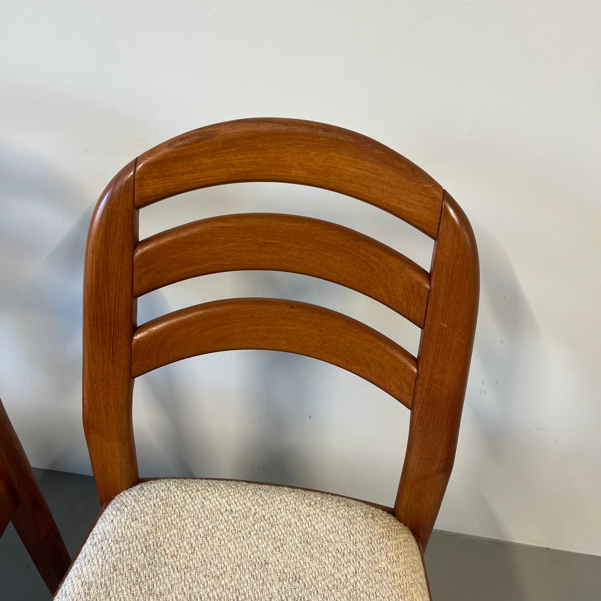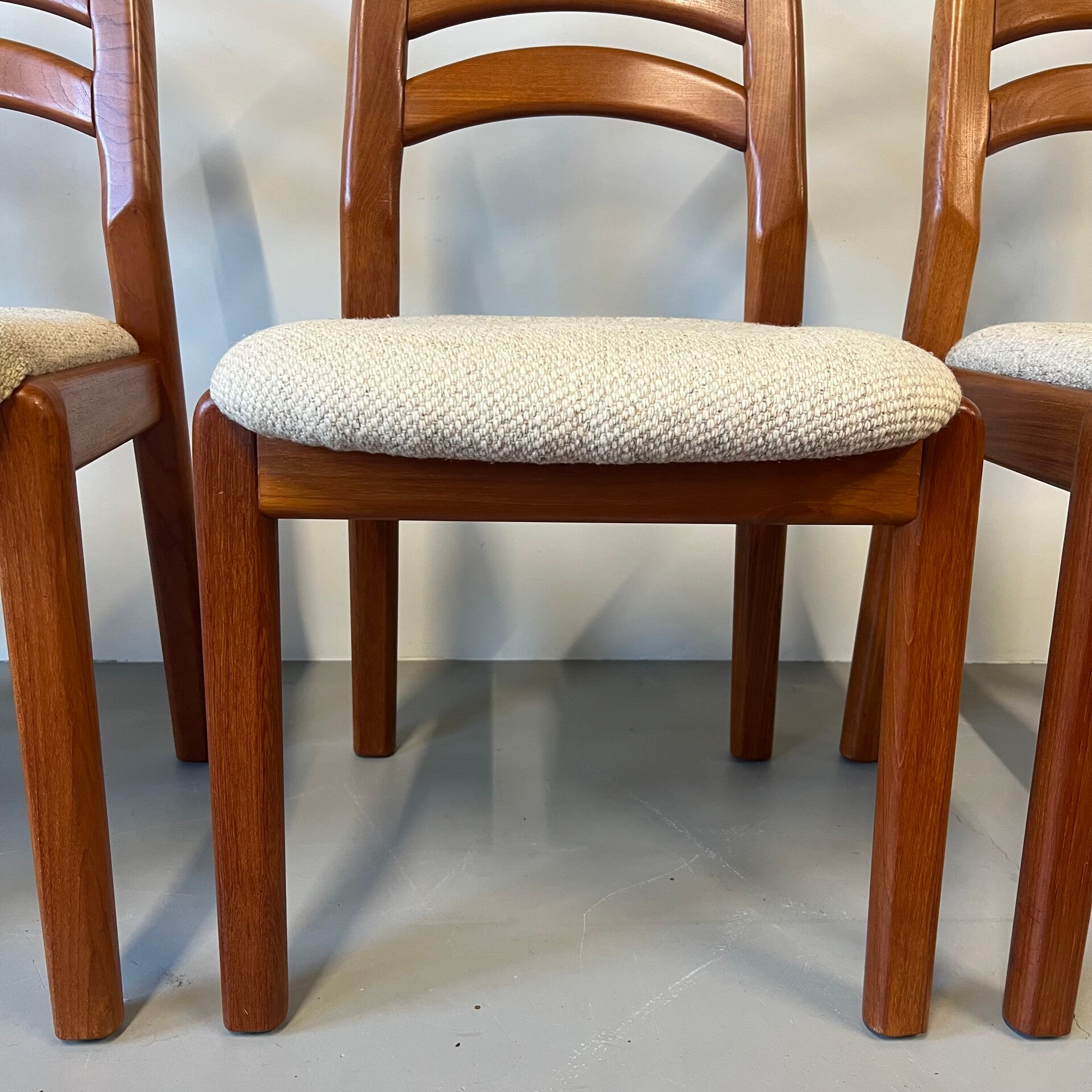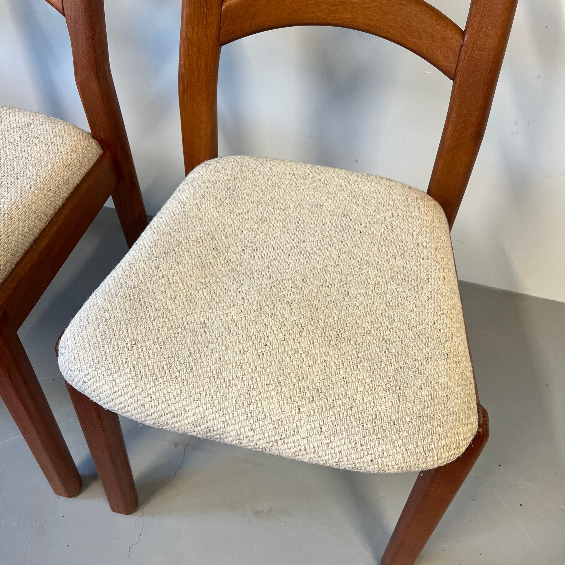 Set van 4 vintage eetkamerstoelen in massief teakhout met stoffen bekleding.