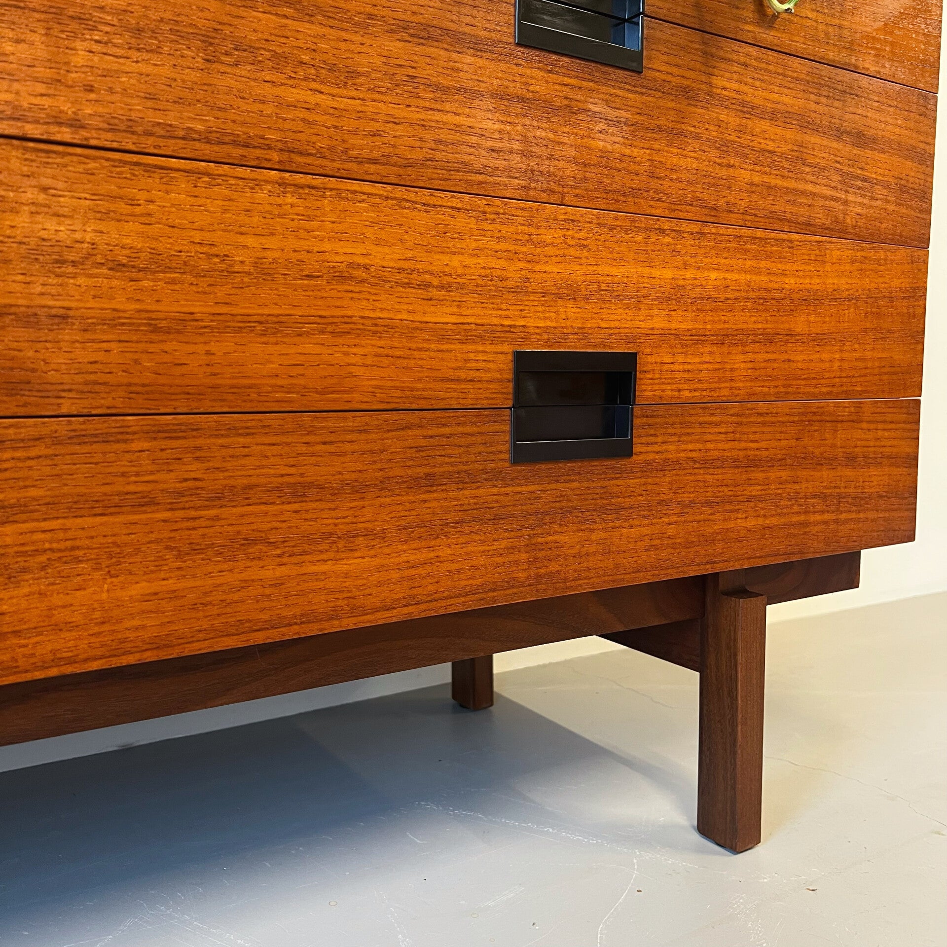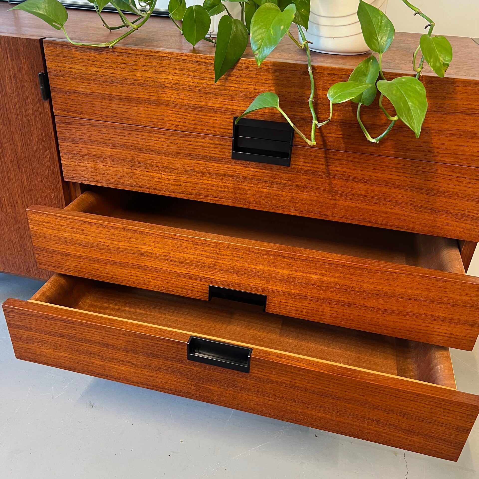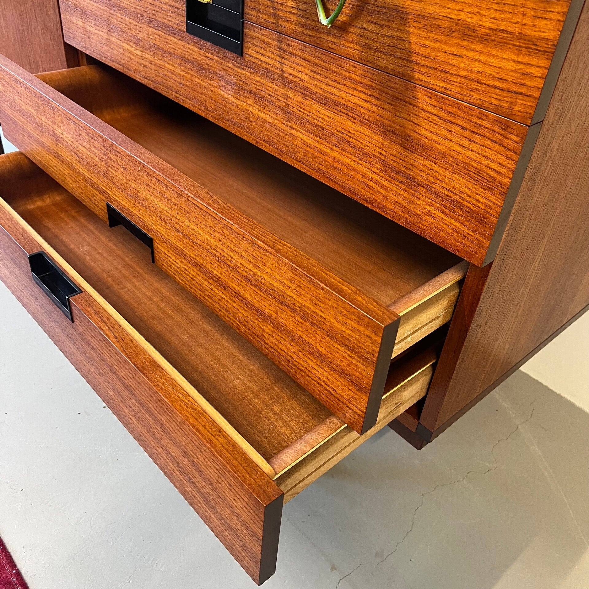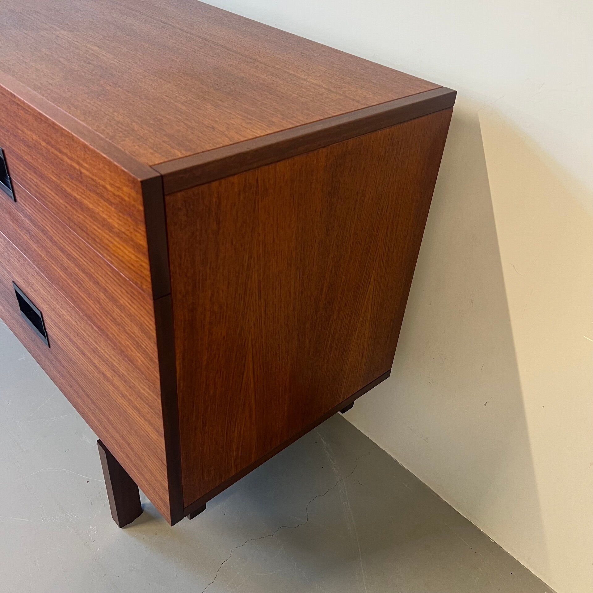 Uitgevoerd in teak (fineer) met de kenmerkende geïntegreerde zwart kunststof handgrepen en minimalistisch onderstel.