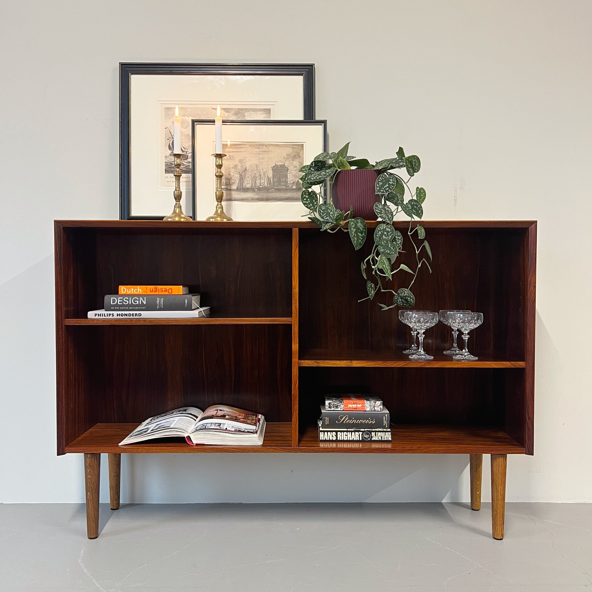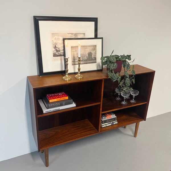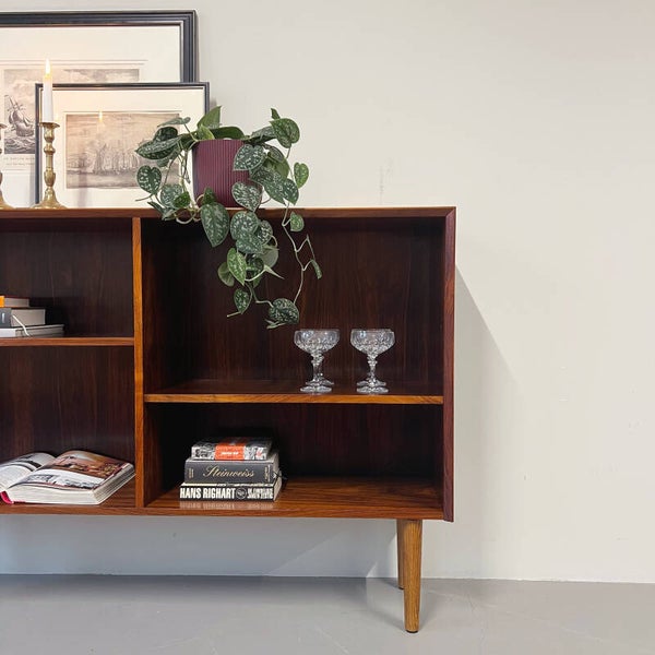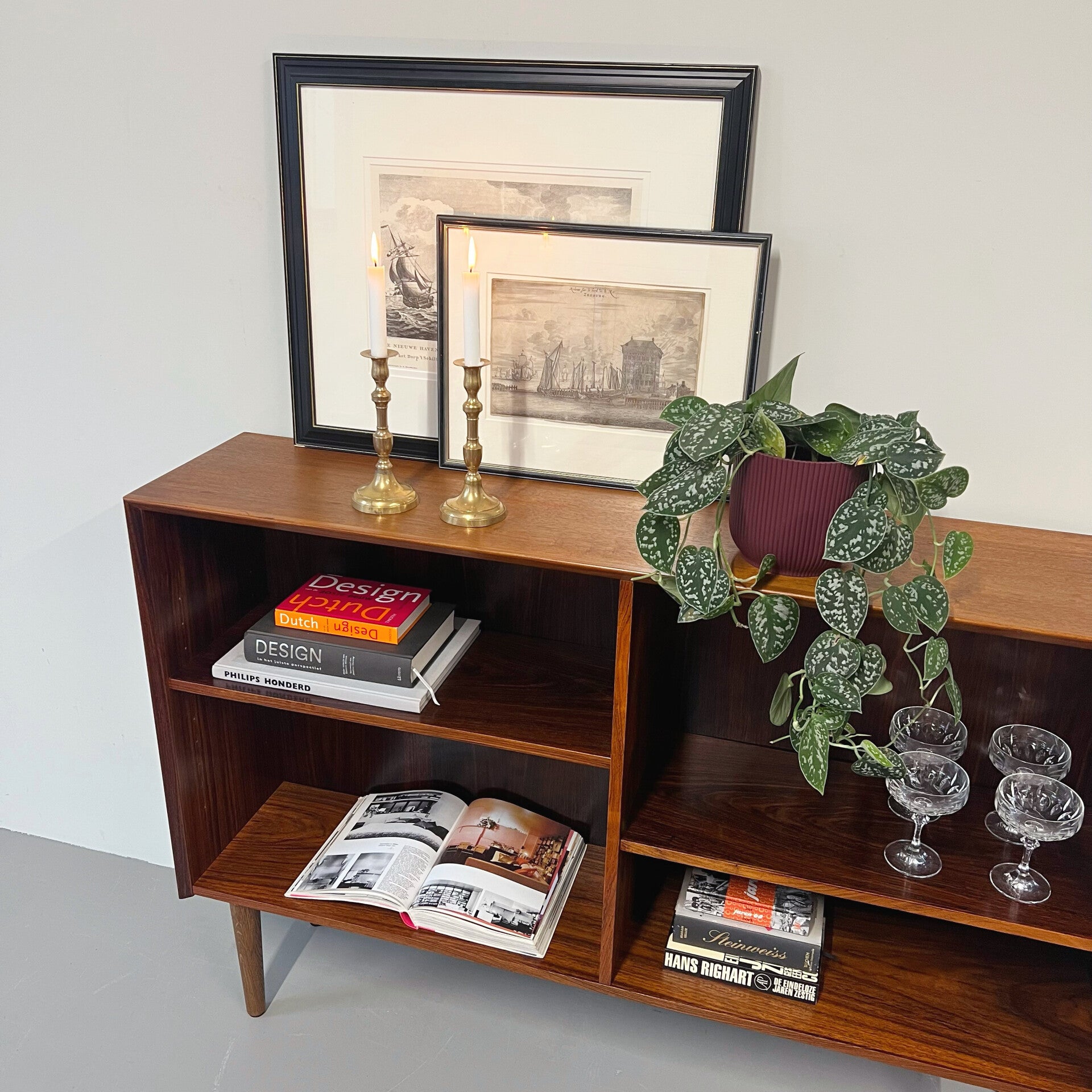 Mooie vintage open boekenkast, uitgevoerd in warm palissander (rosewood).