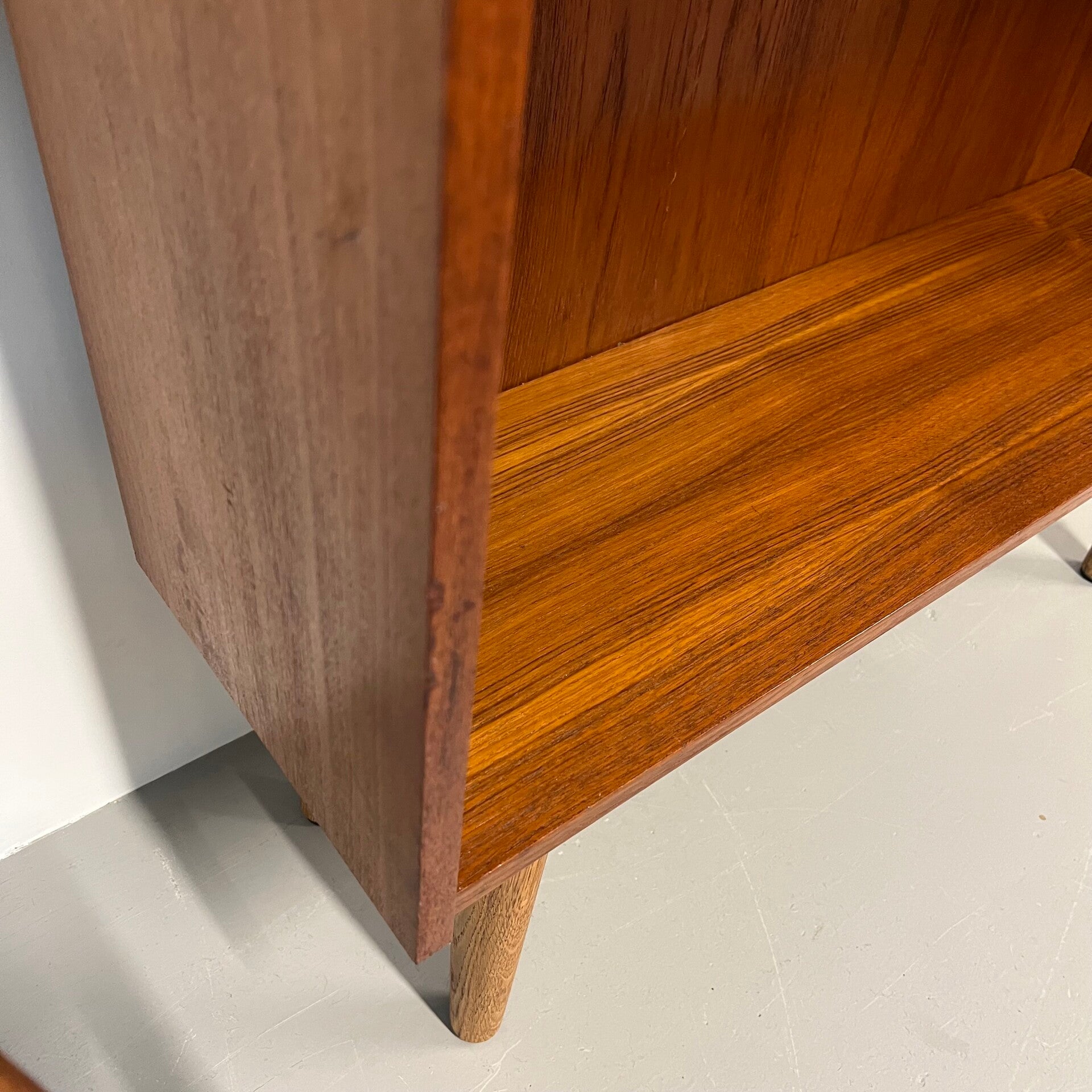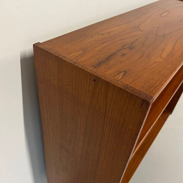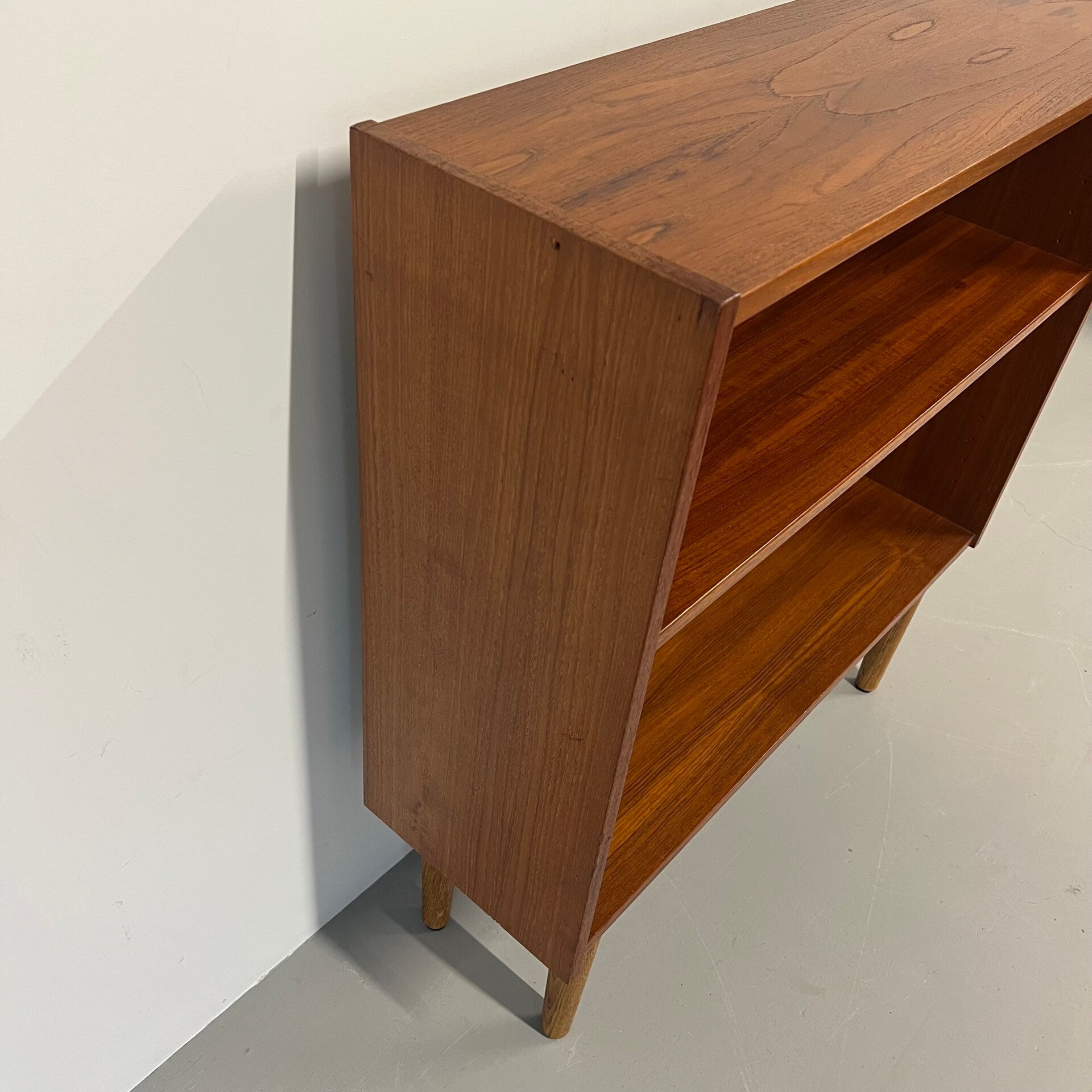 Leuk open boekenkastje, uitgevoerd in teak (fineer) en op slanke conische pootjes (later toegevoegd).