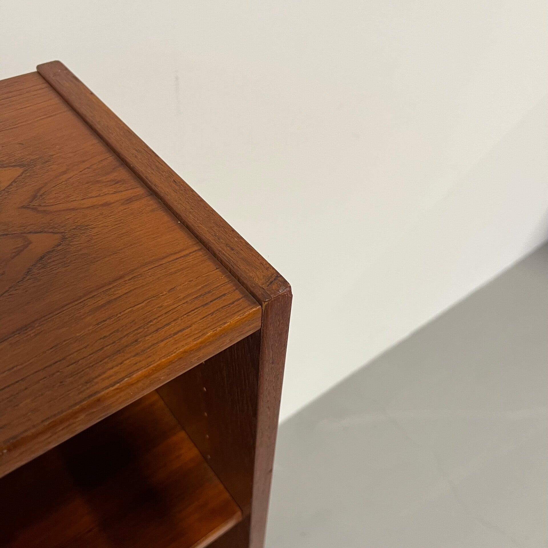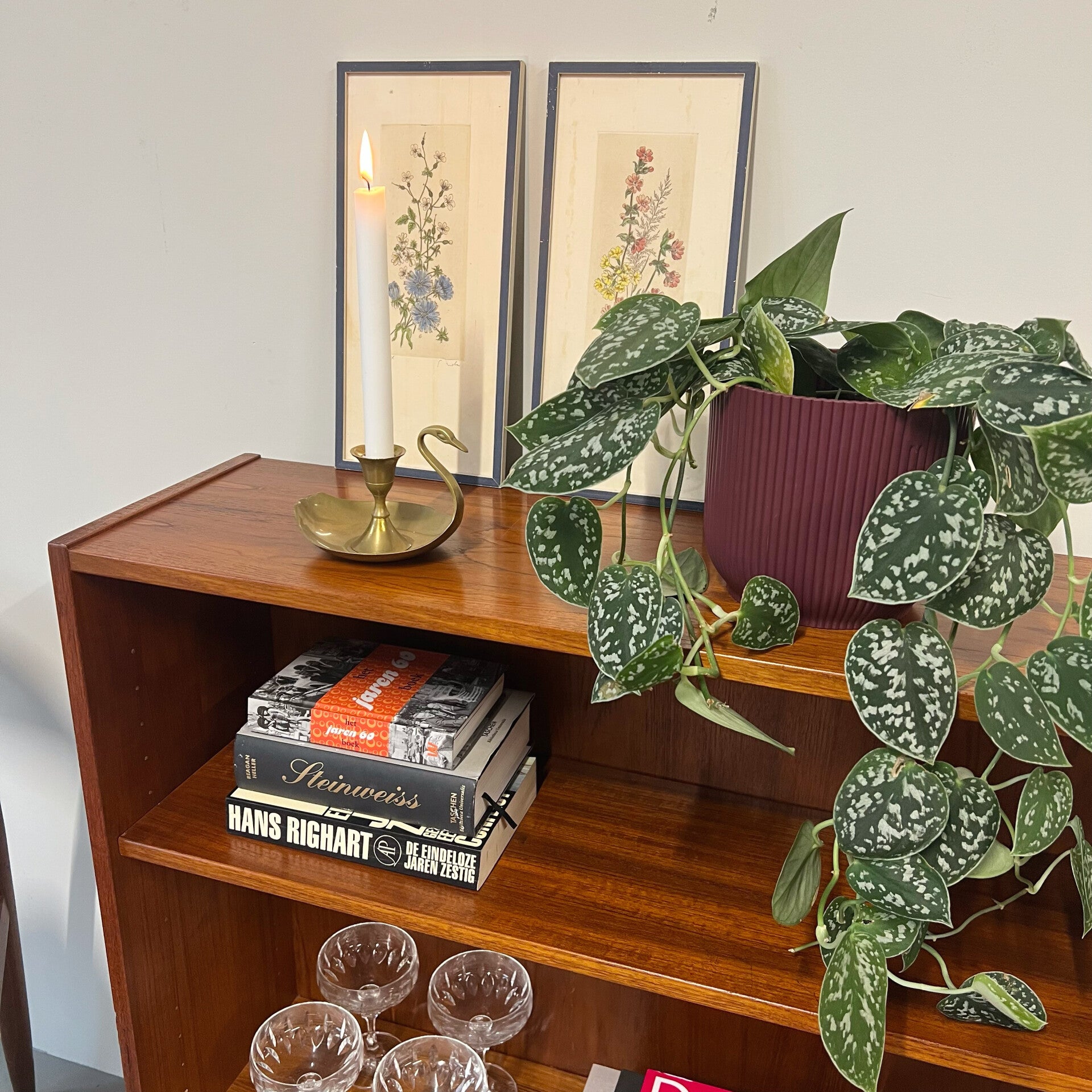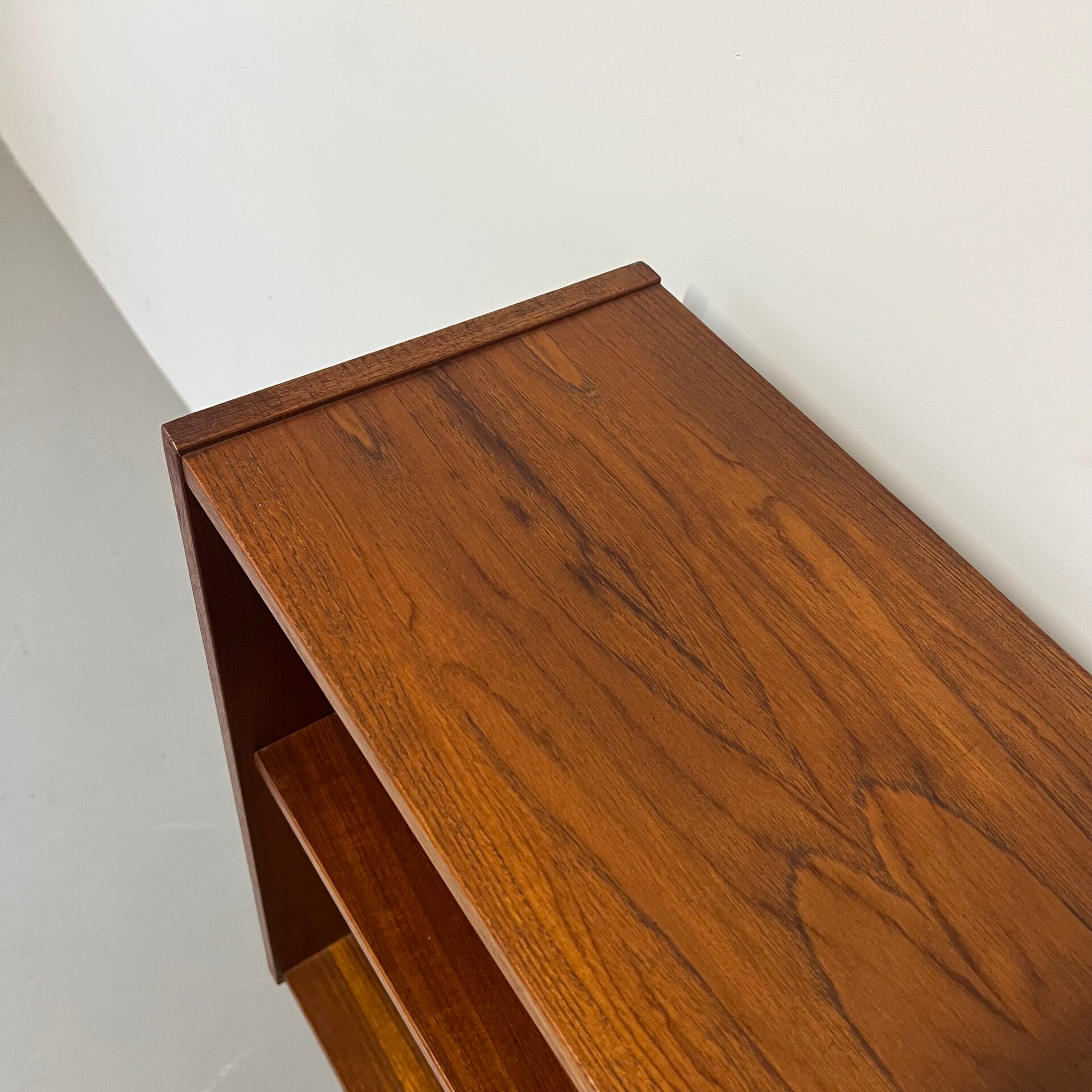 Leuk open boekenkastje, uitgevoerd in teak (fineer) en op slanke conische pootjes (later toegevoegd).