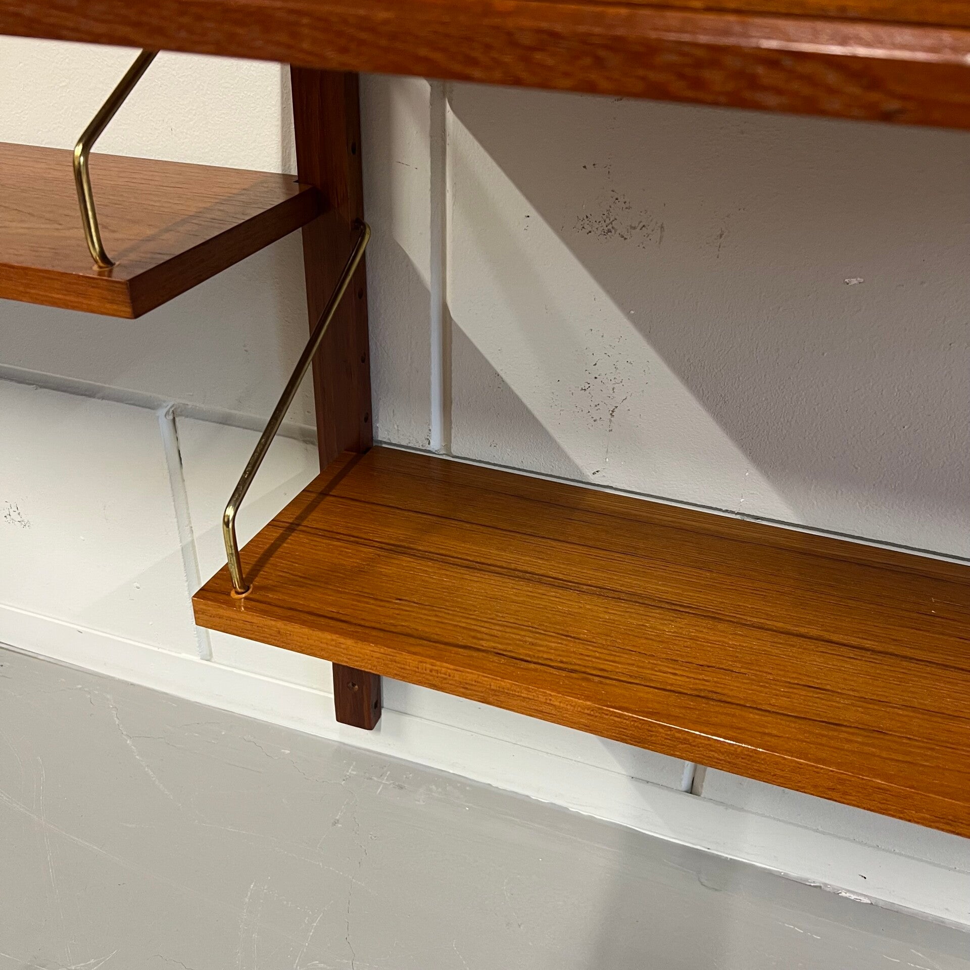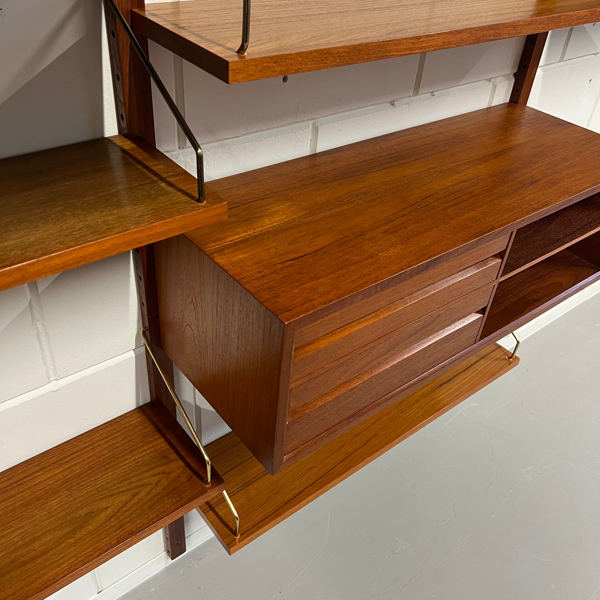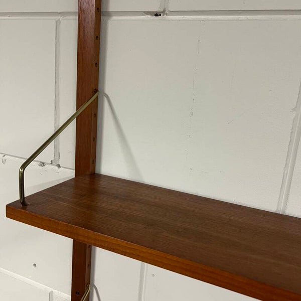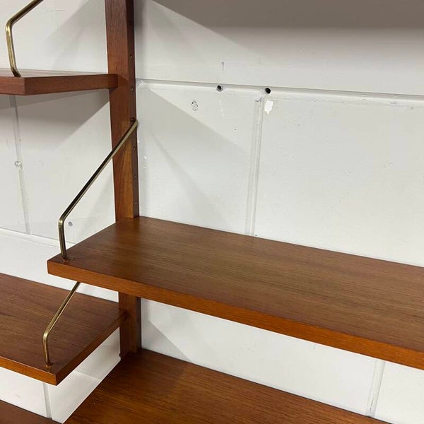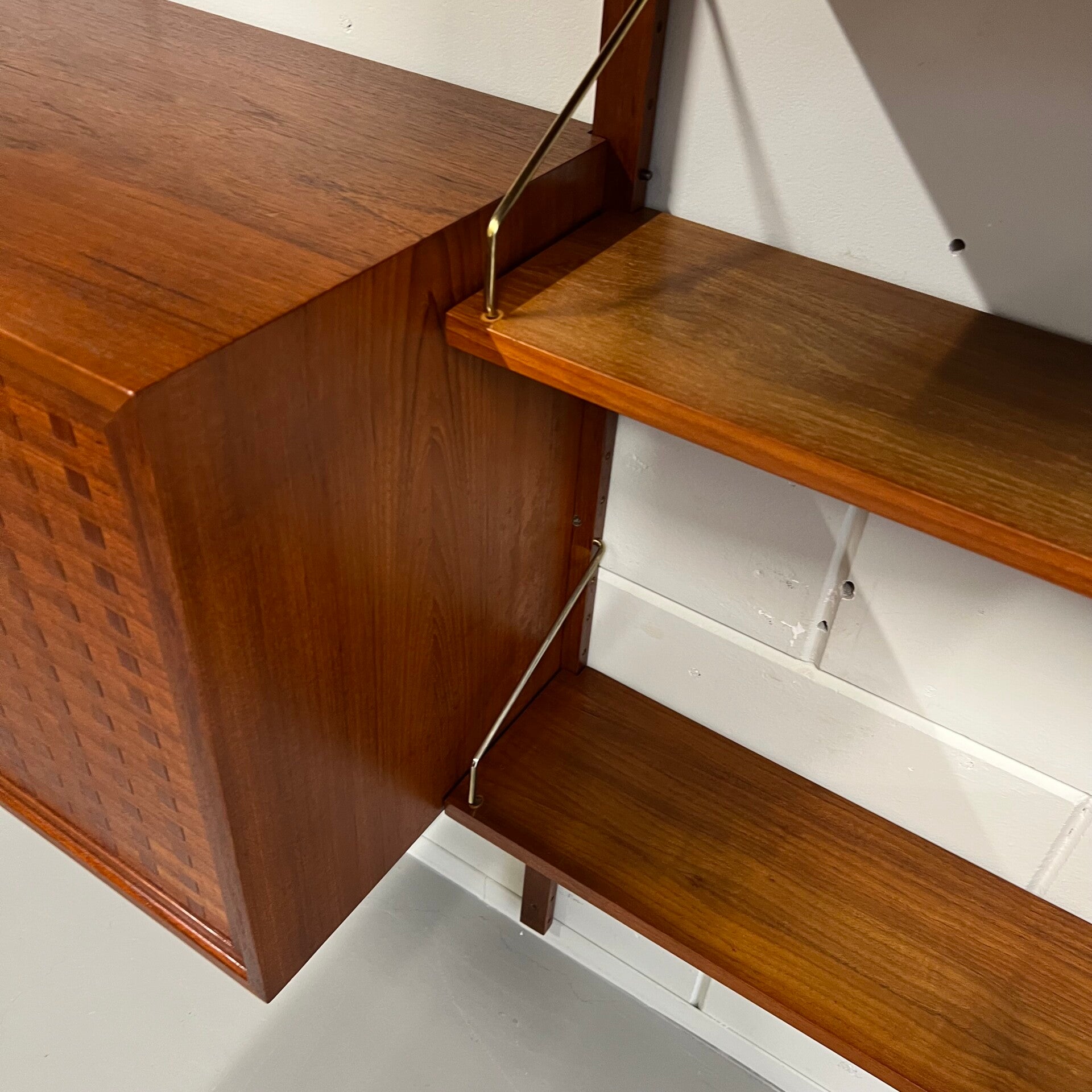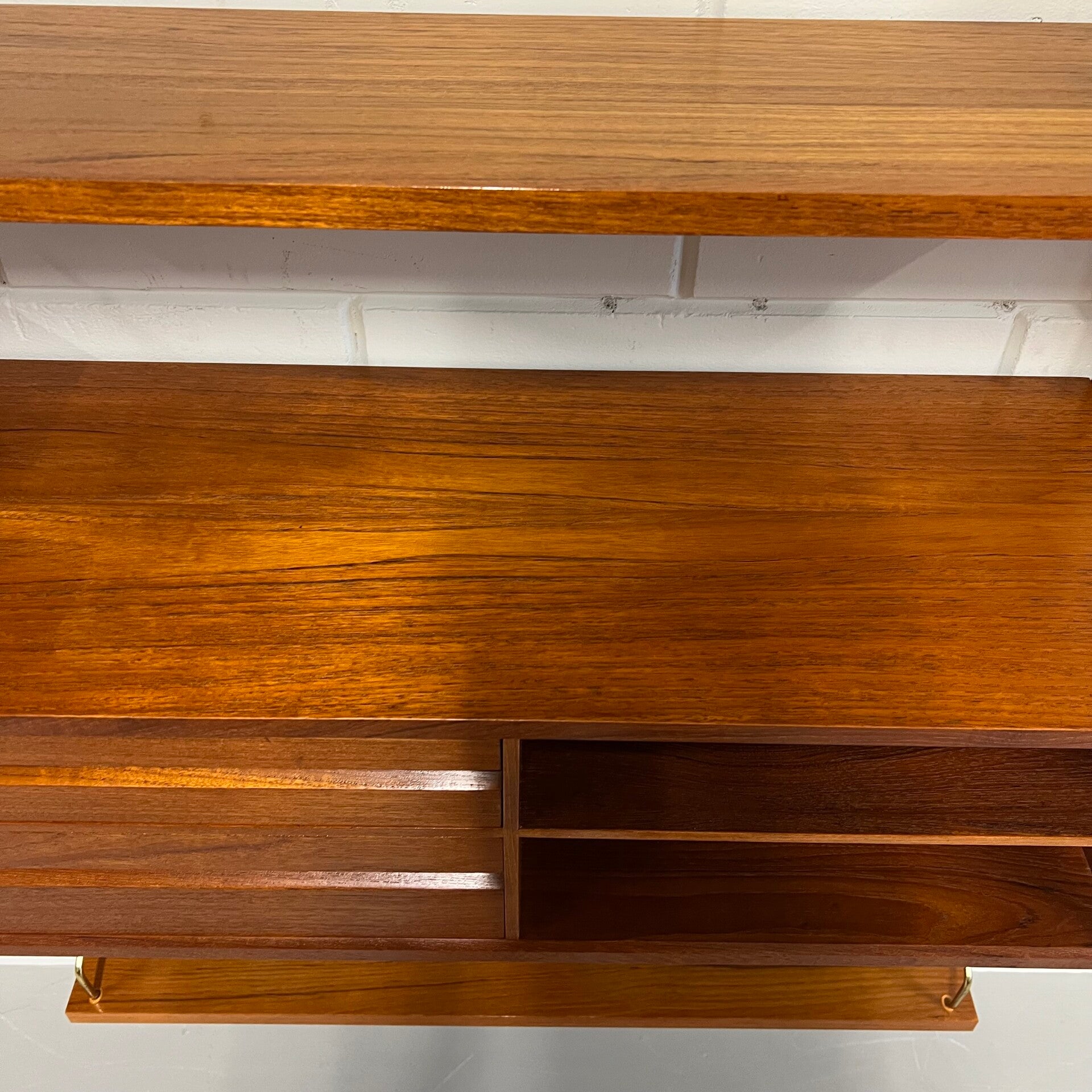 Geweldig vintage wandmeubel, wall unit uitgevoerd in teakhout met messing beugels.