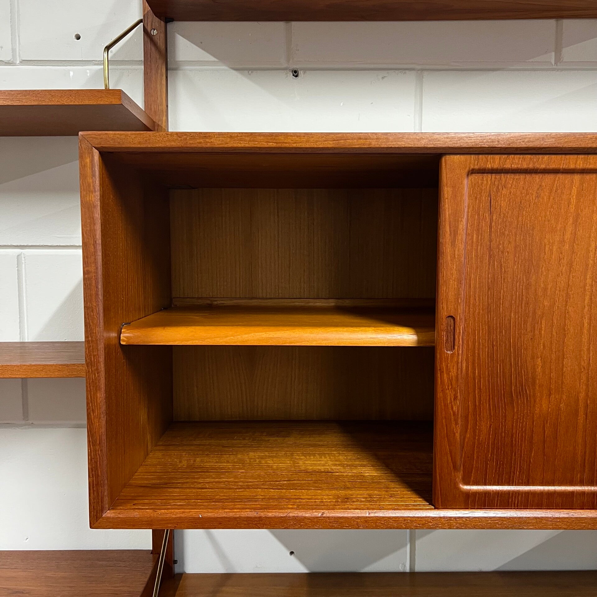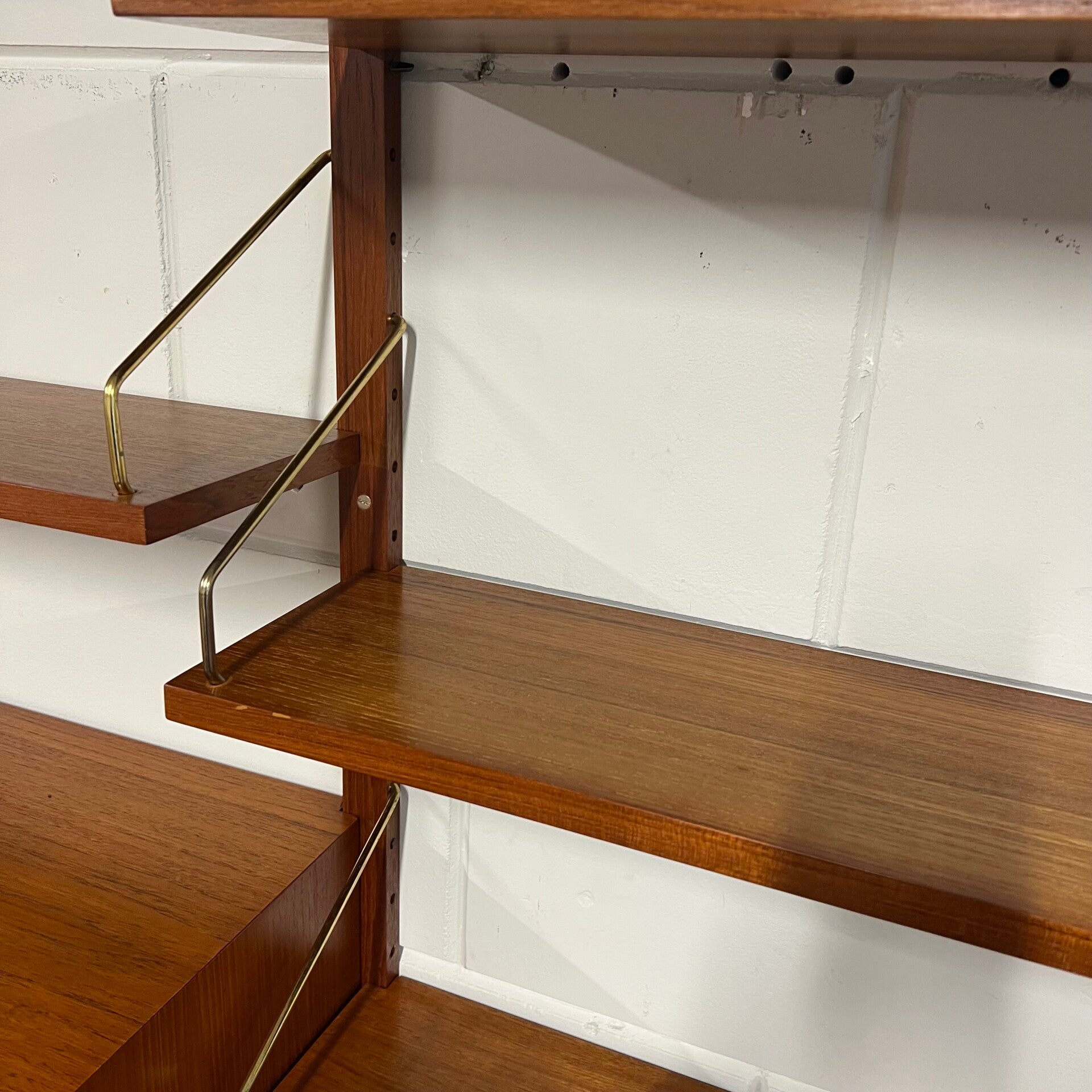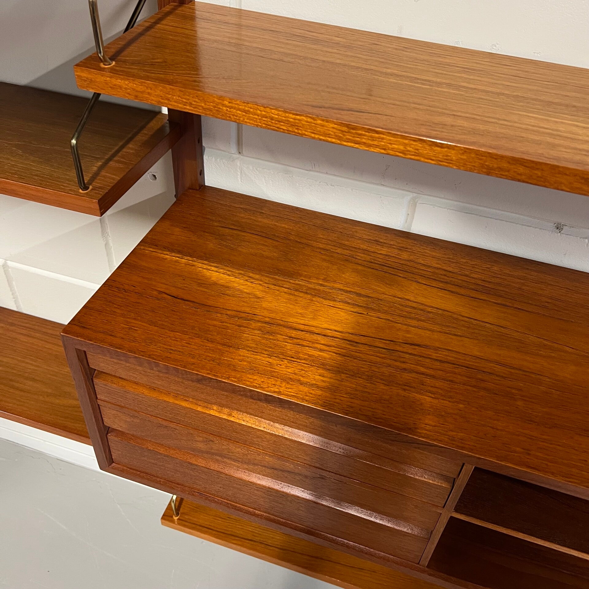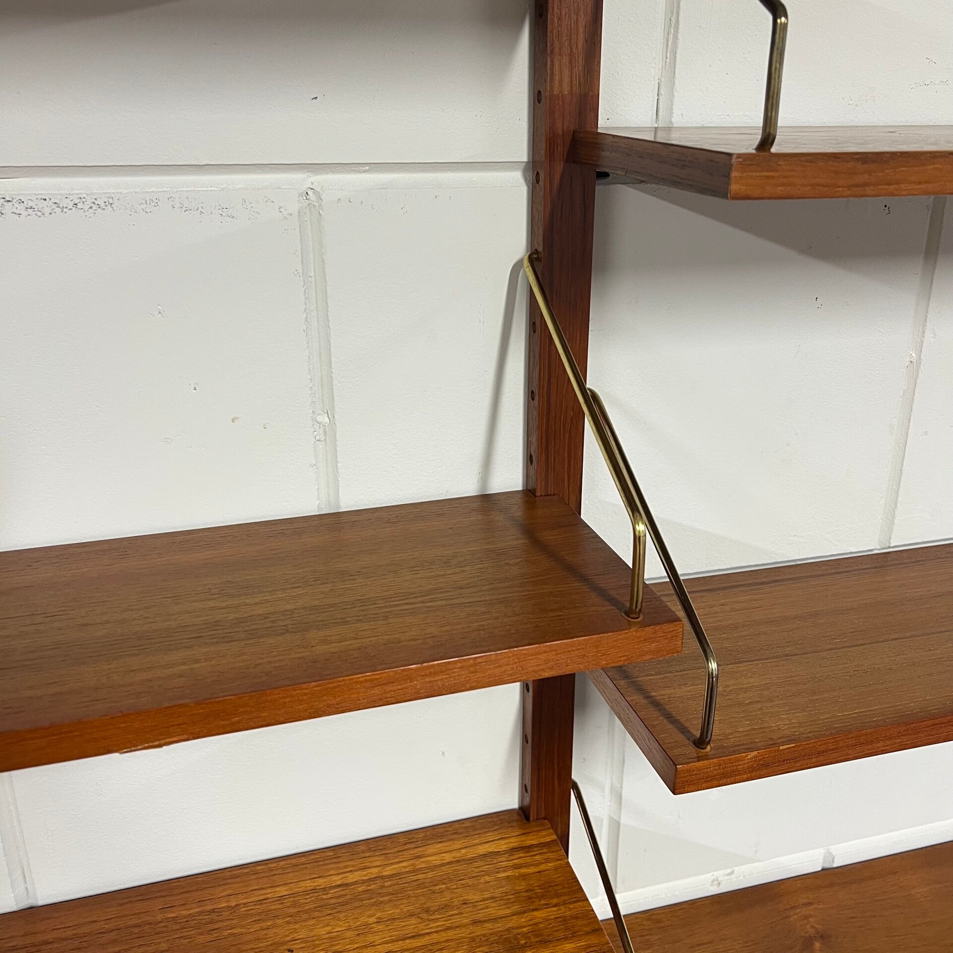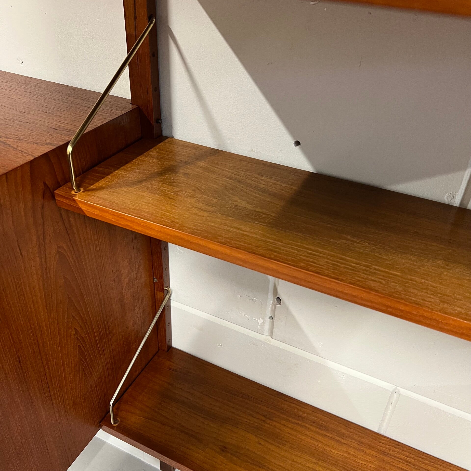 Geweldig vintage wandmeubel, wall unit uitgevoerd in teakhout met messing beugels.
