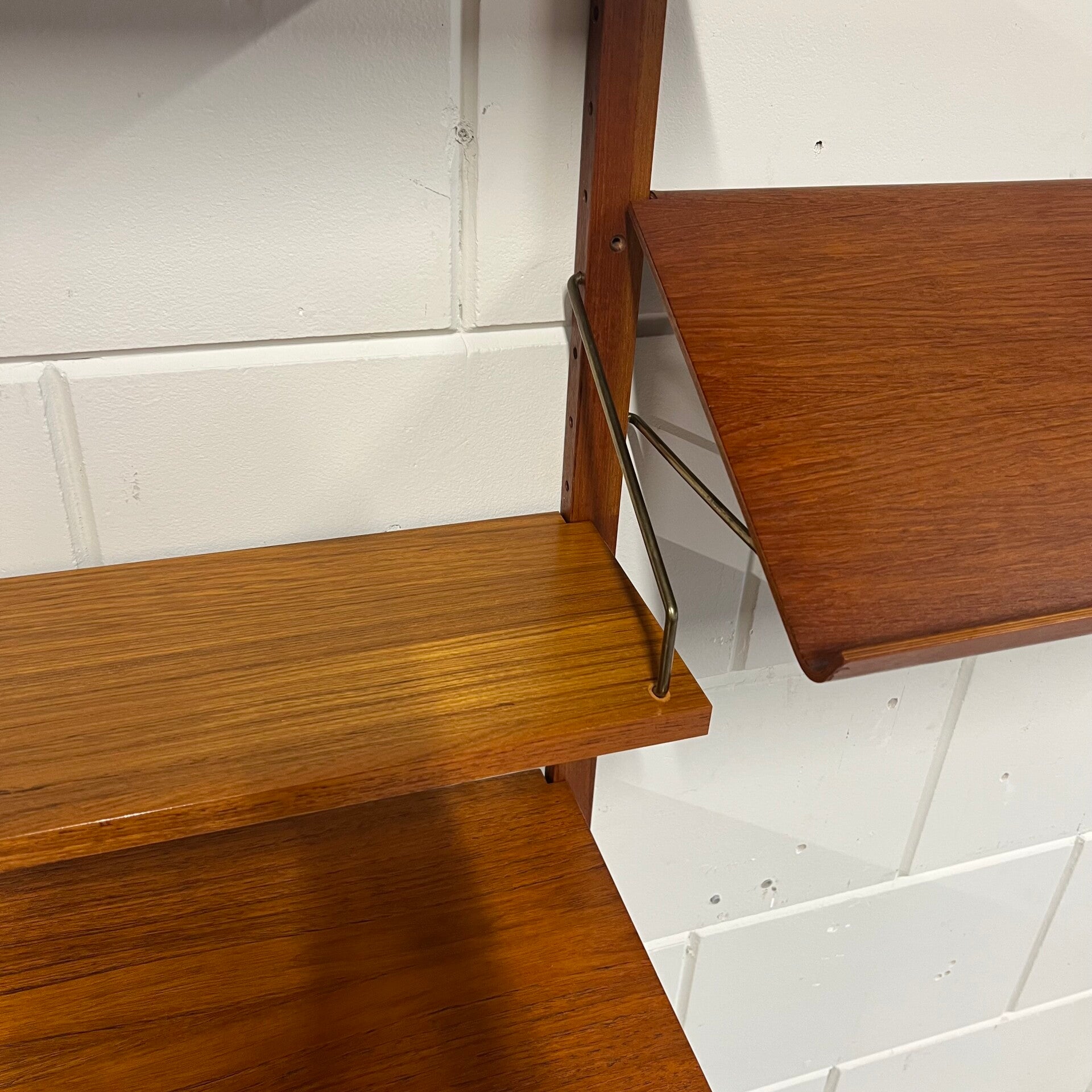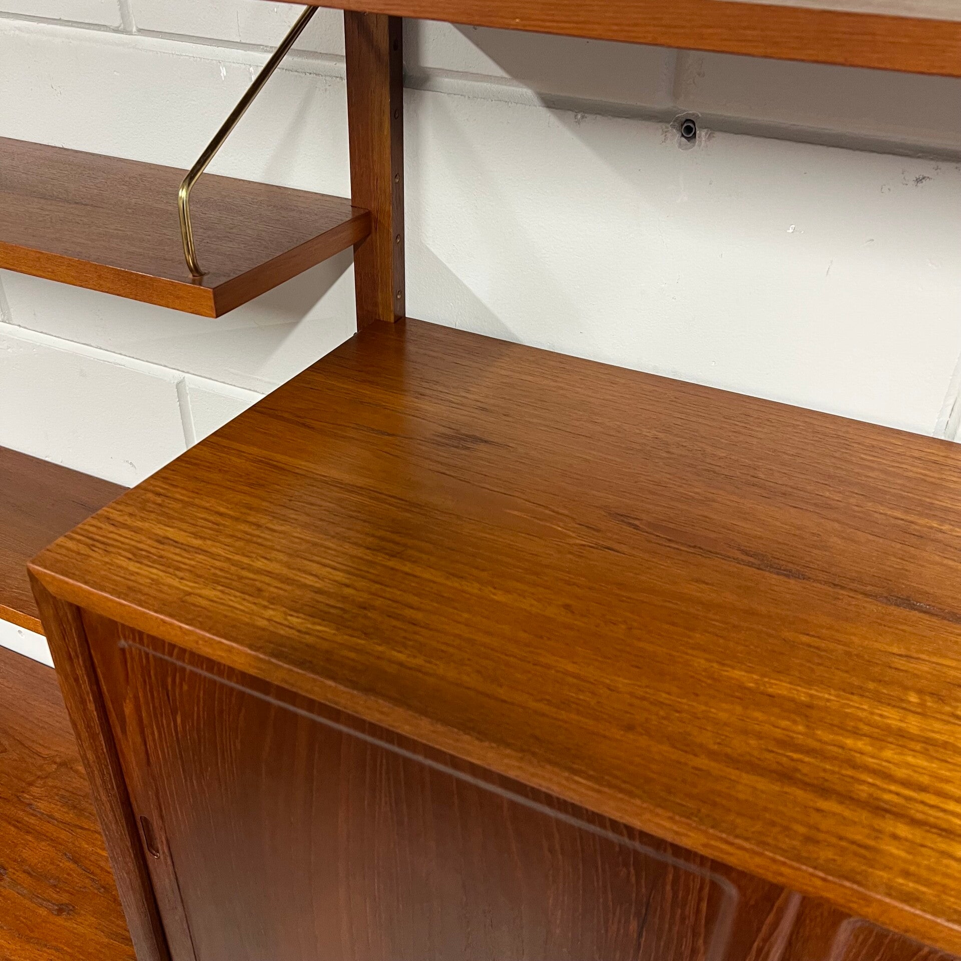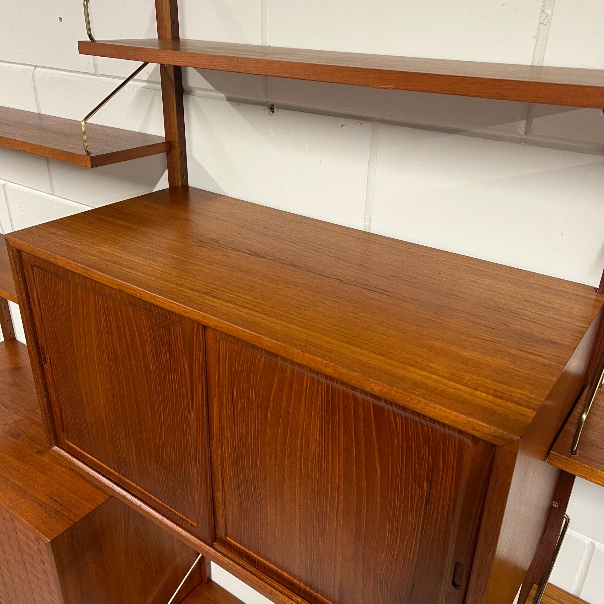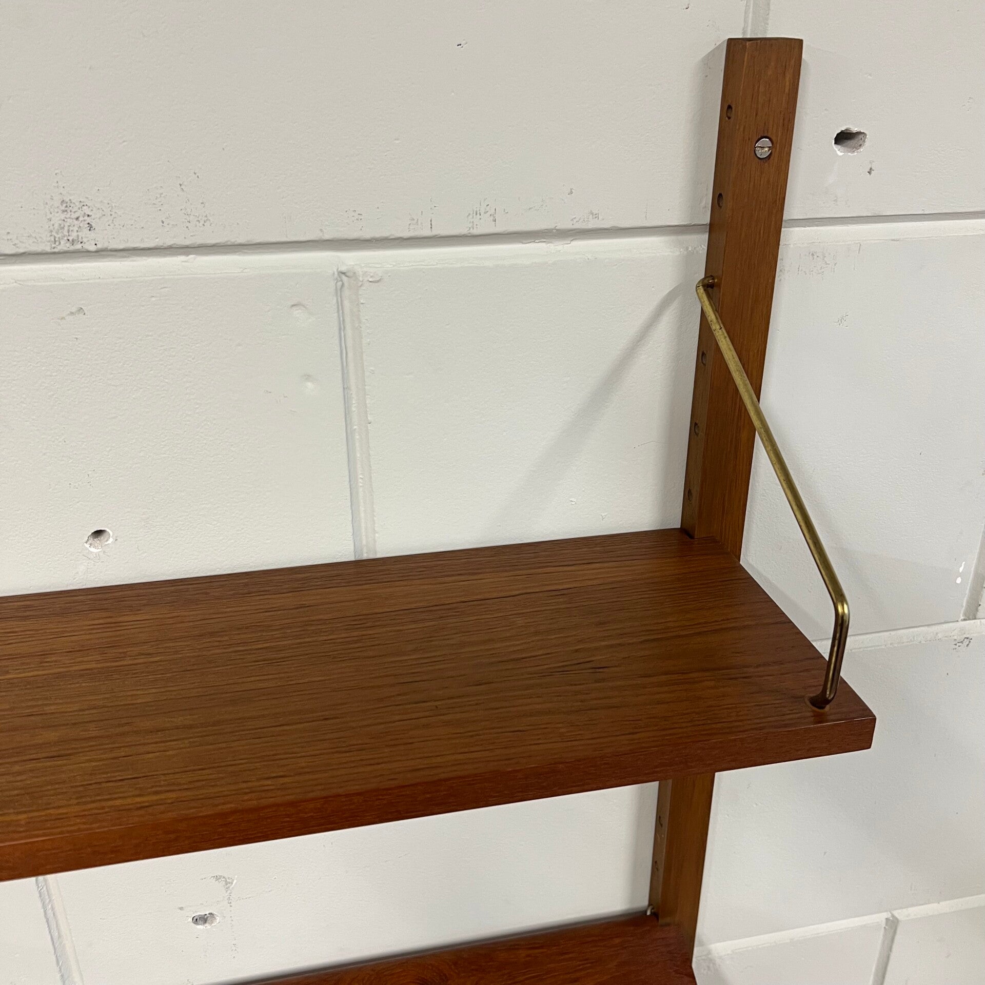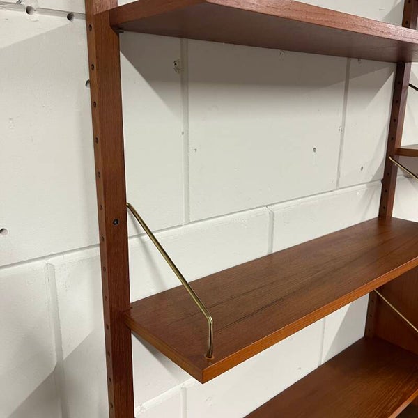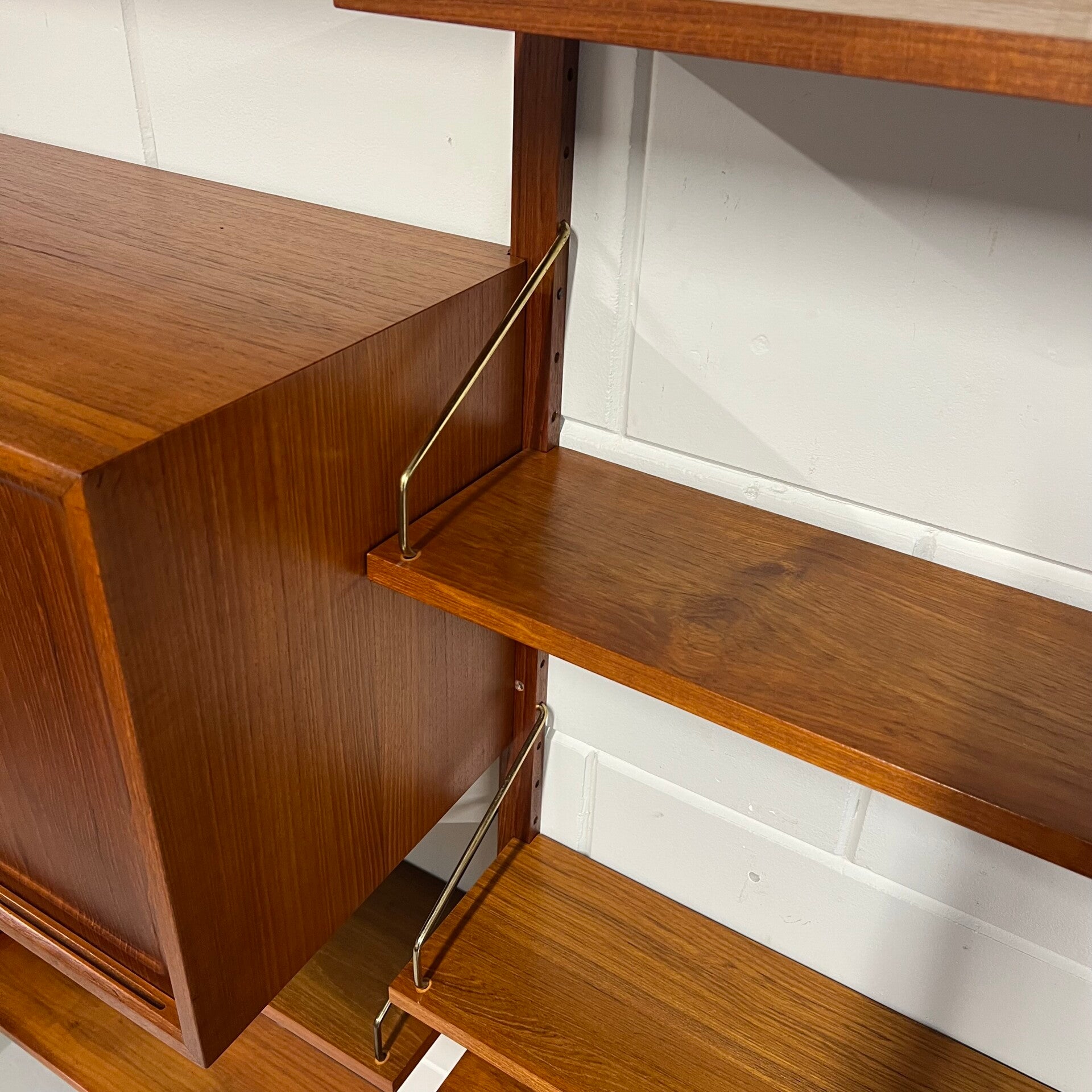 Geweldig vintage wandmeubel, wall unit uitgevoerd in teakhout met messing beugels.
