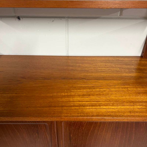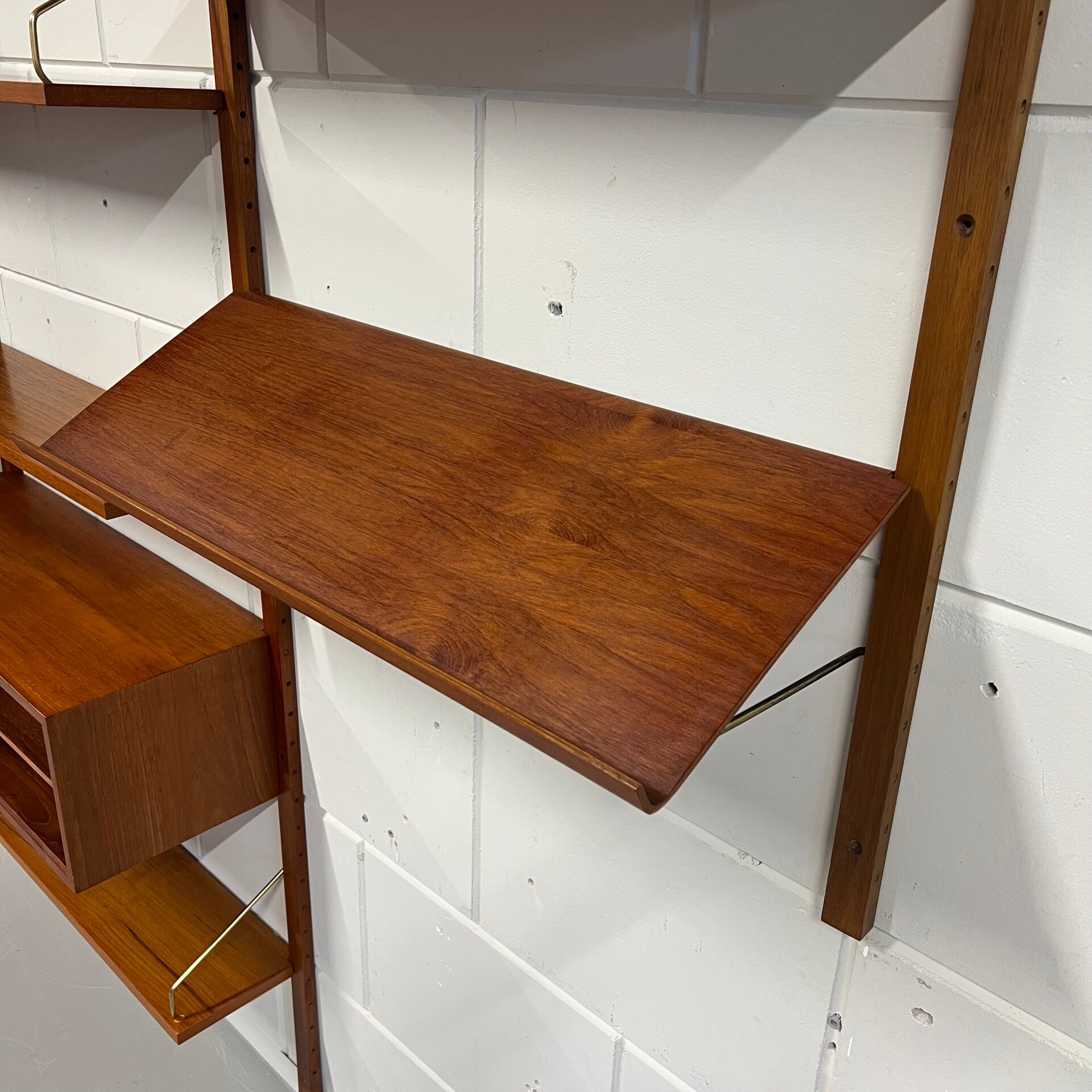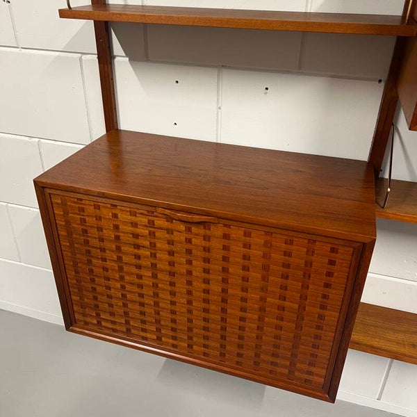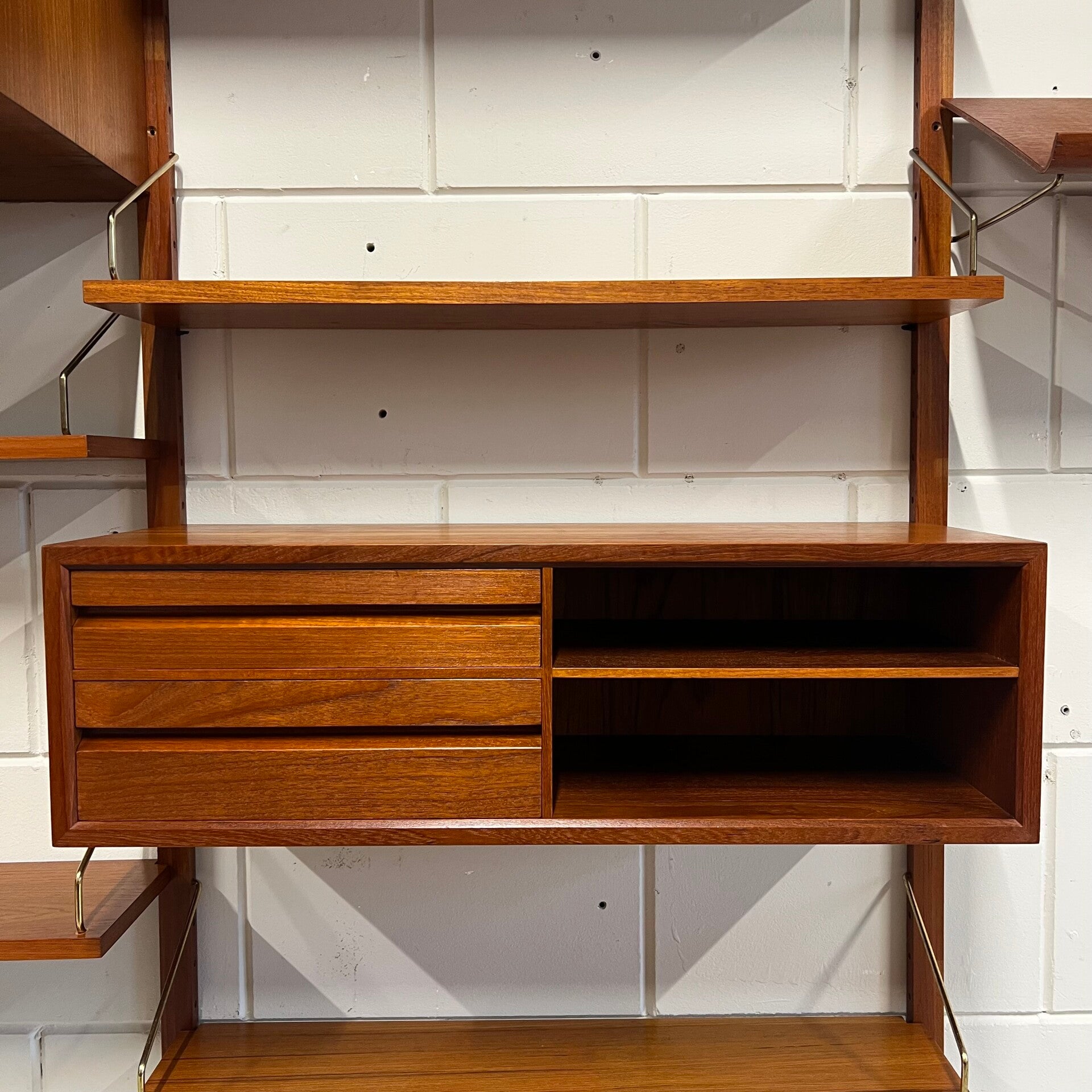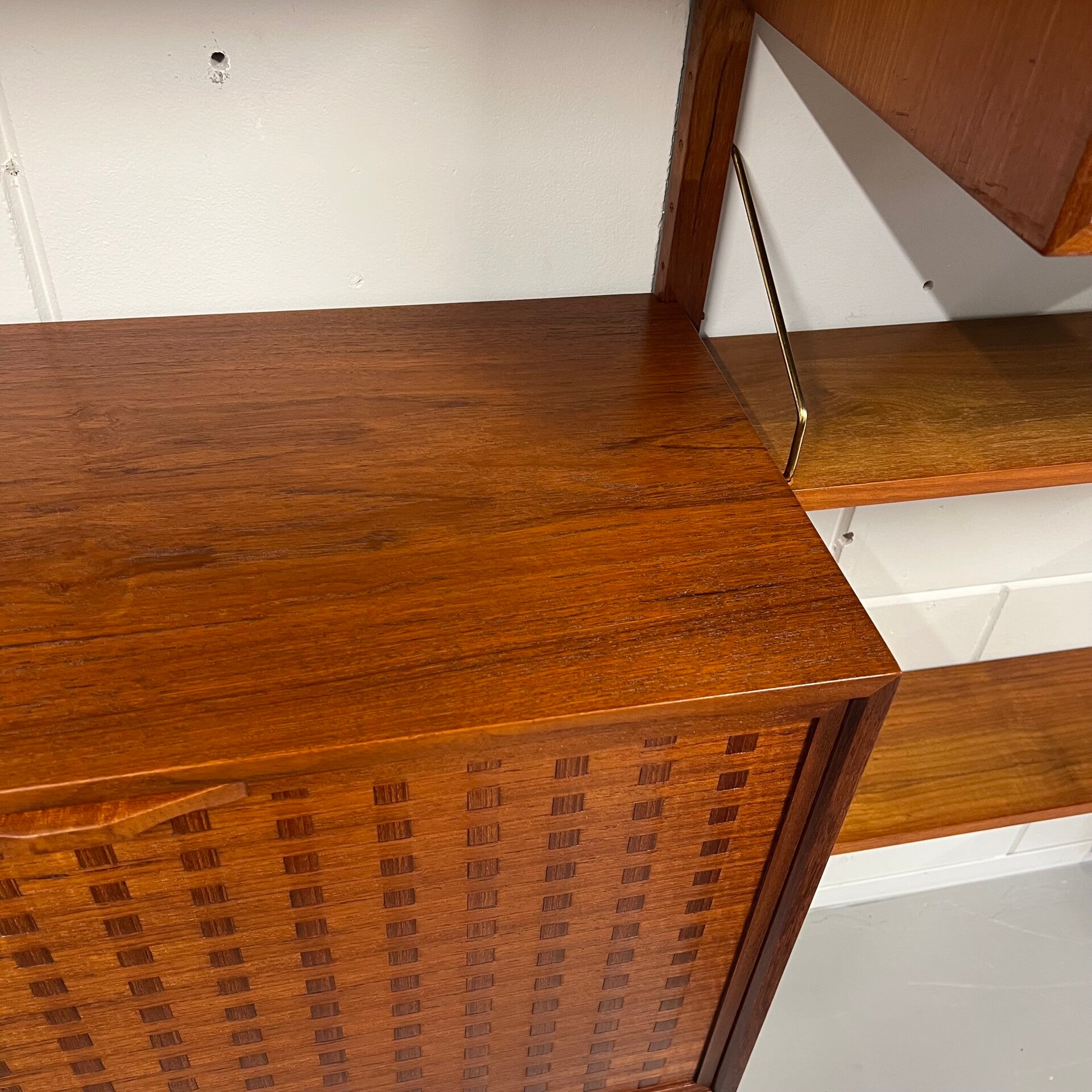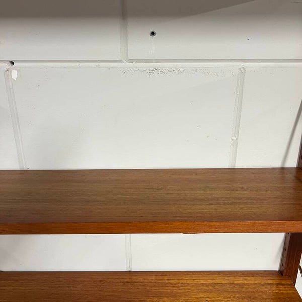 Geweldig vintage wandmeubel, wall unit uitgevoerd in teakhout met messing beugels.