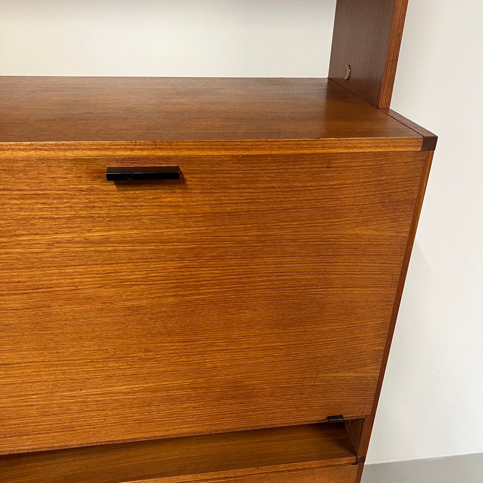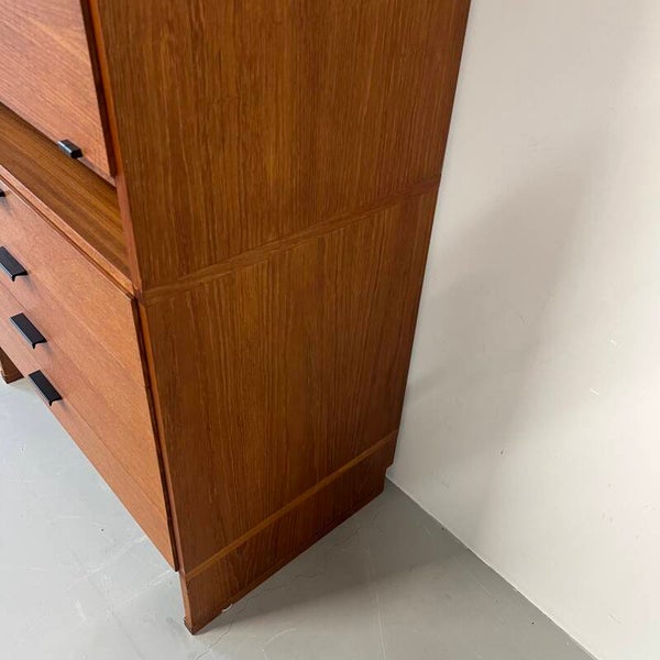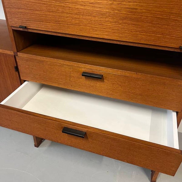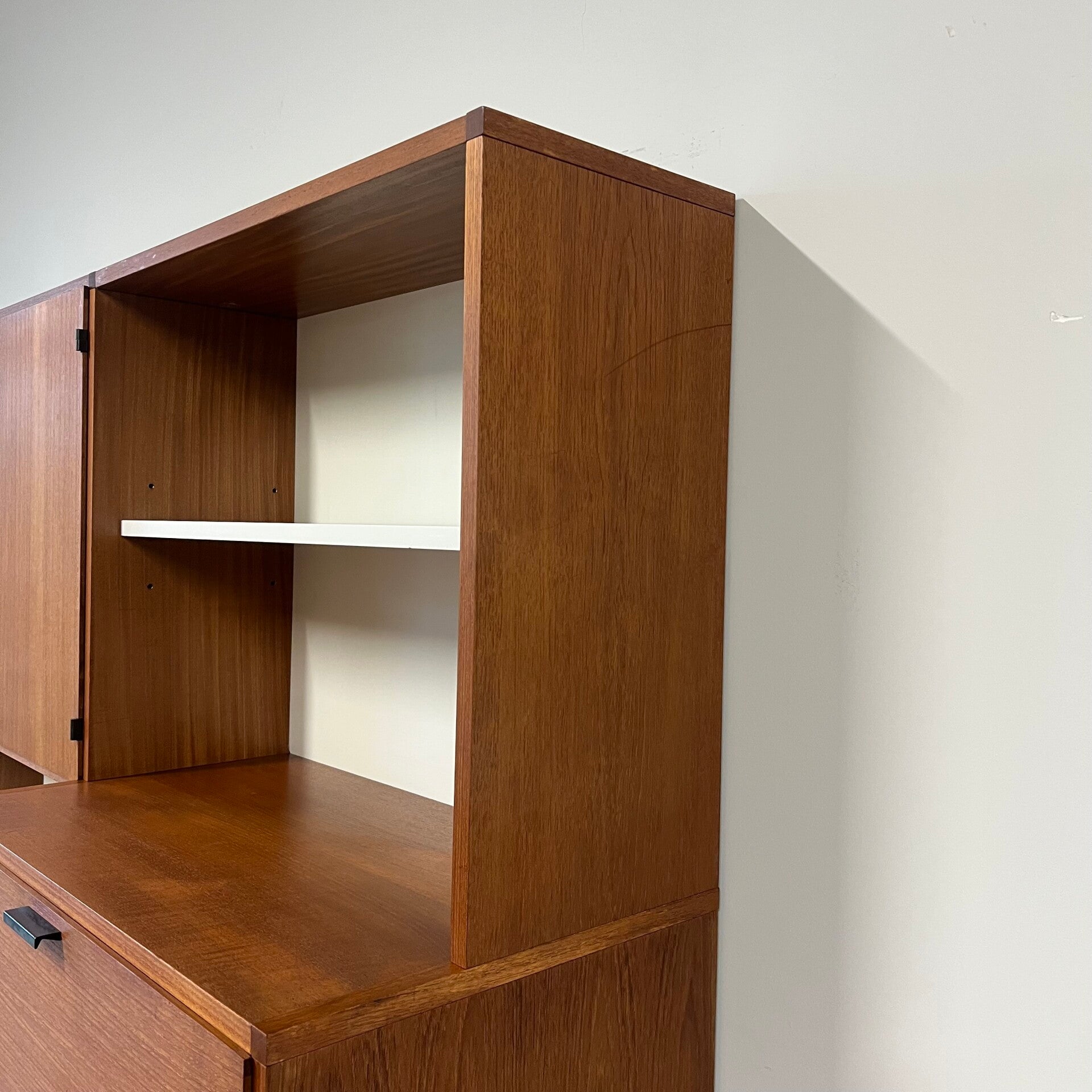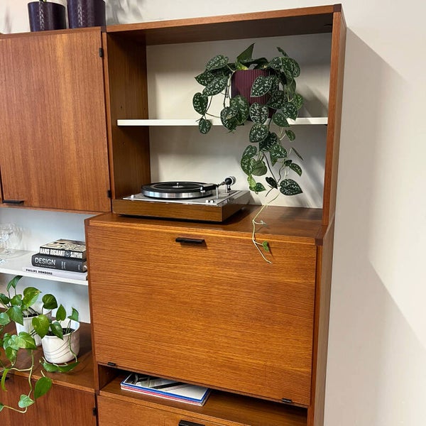 Vintage wandmeubel, uitgevoerd in teak (fineer) met zwart beslag en witte elementen.