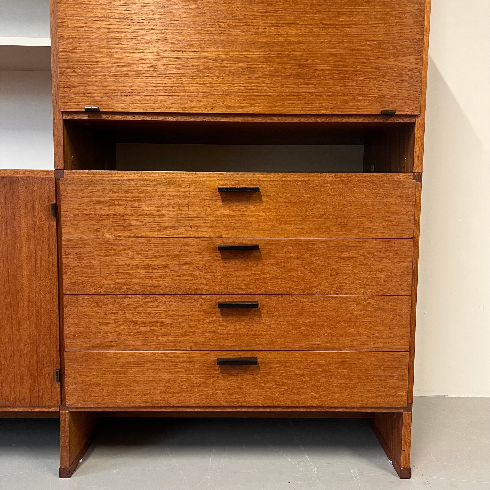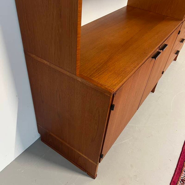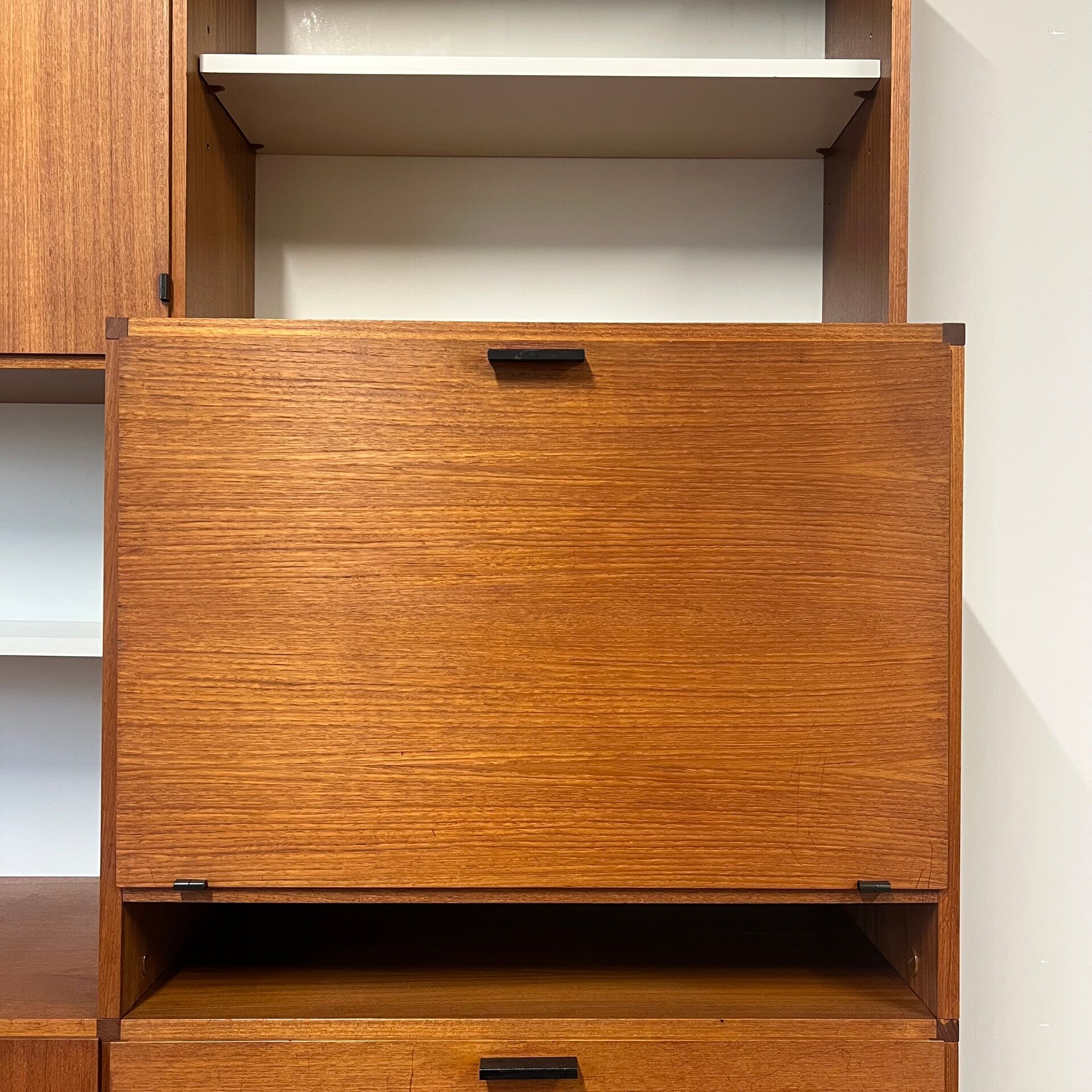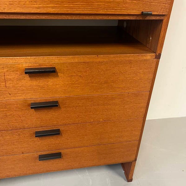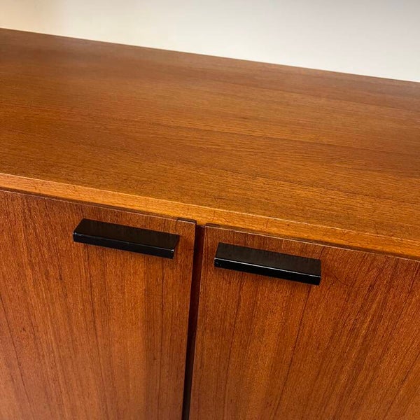 Vintage wandmeubel, uitgevoerd in teak (fineer) met zwart beslag en witte elementen.