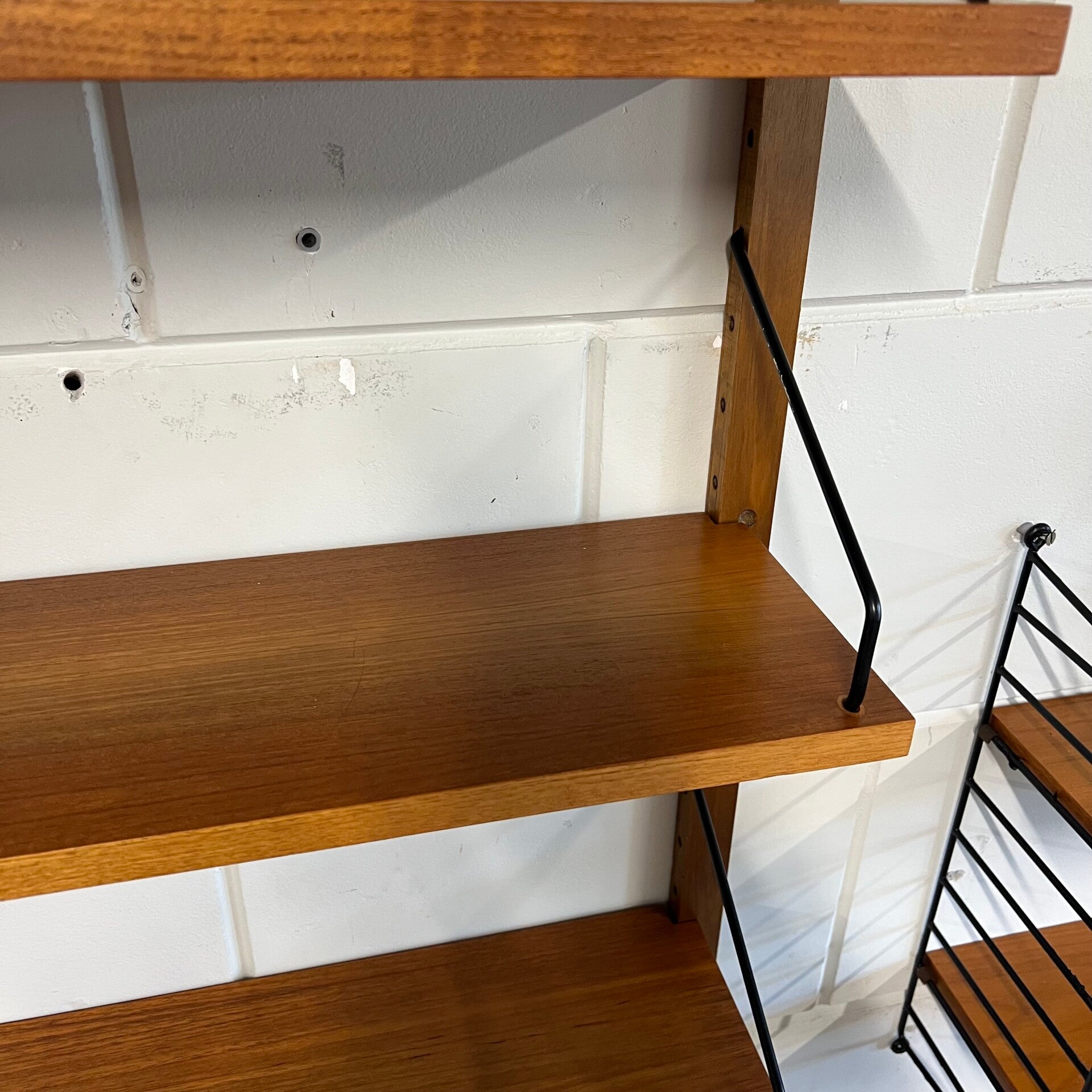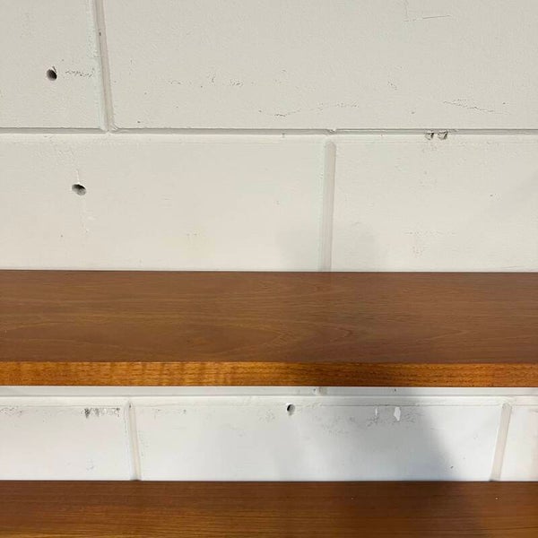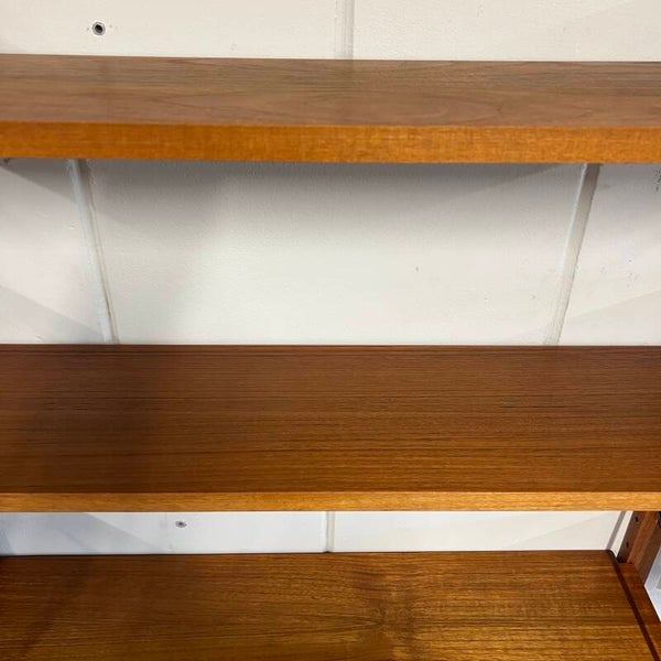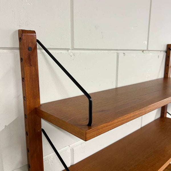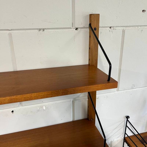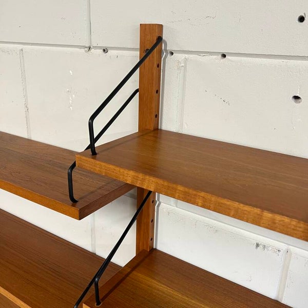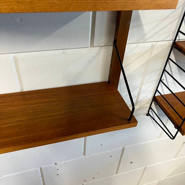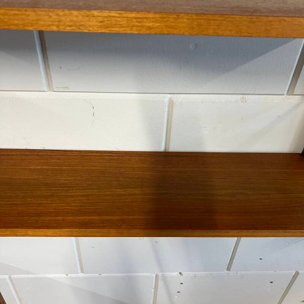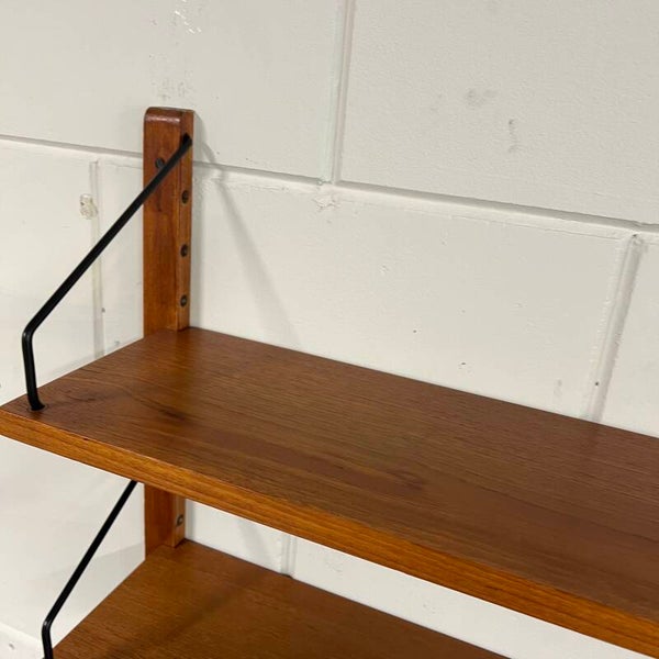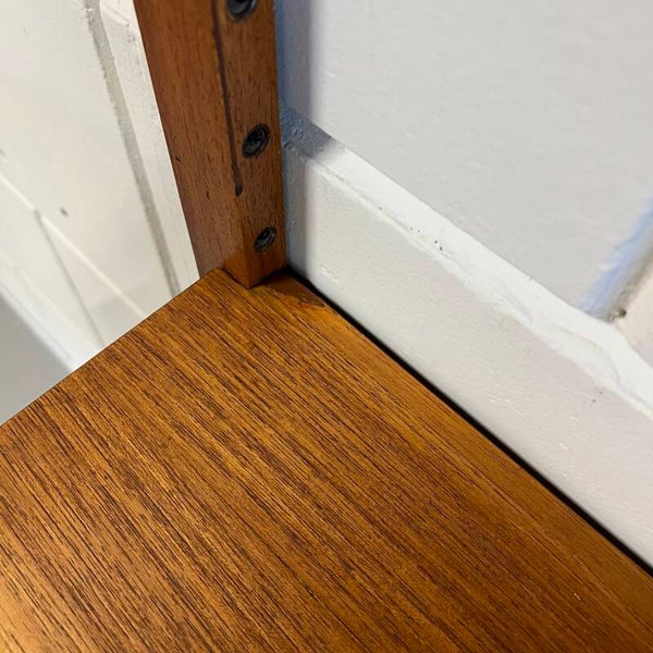 Uitgevoerd in teak (fineer) met houten wandlatten en zwarte beugels.