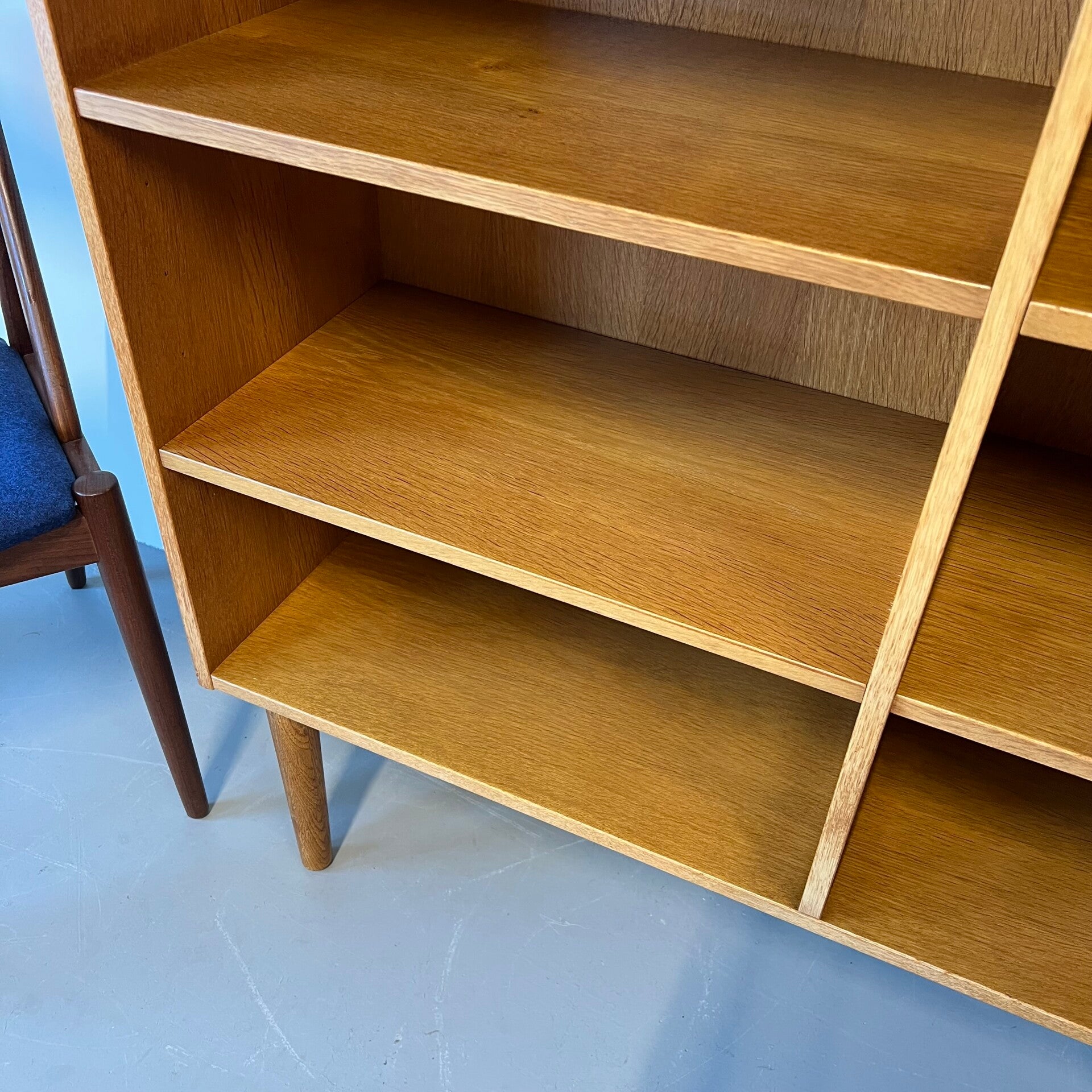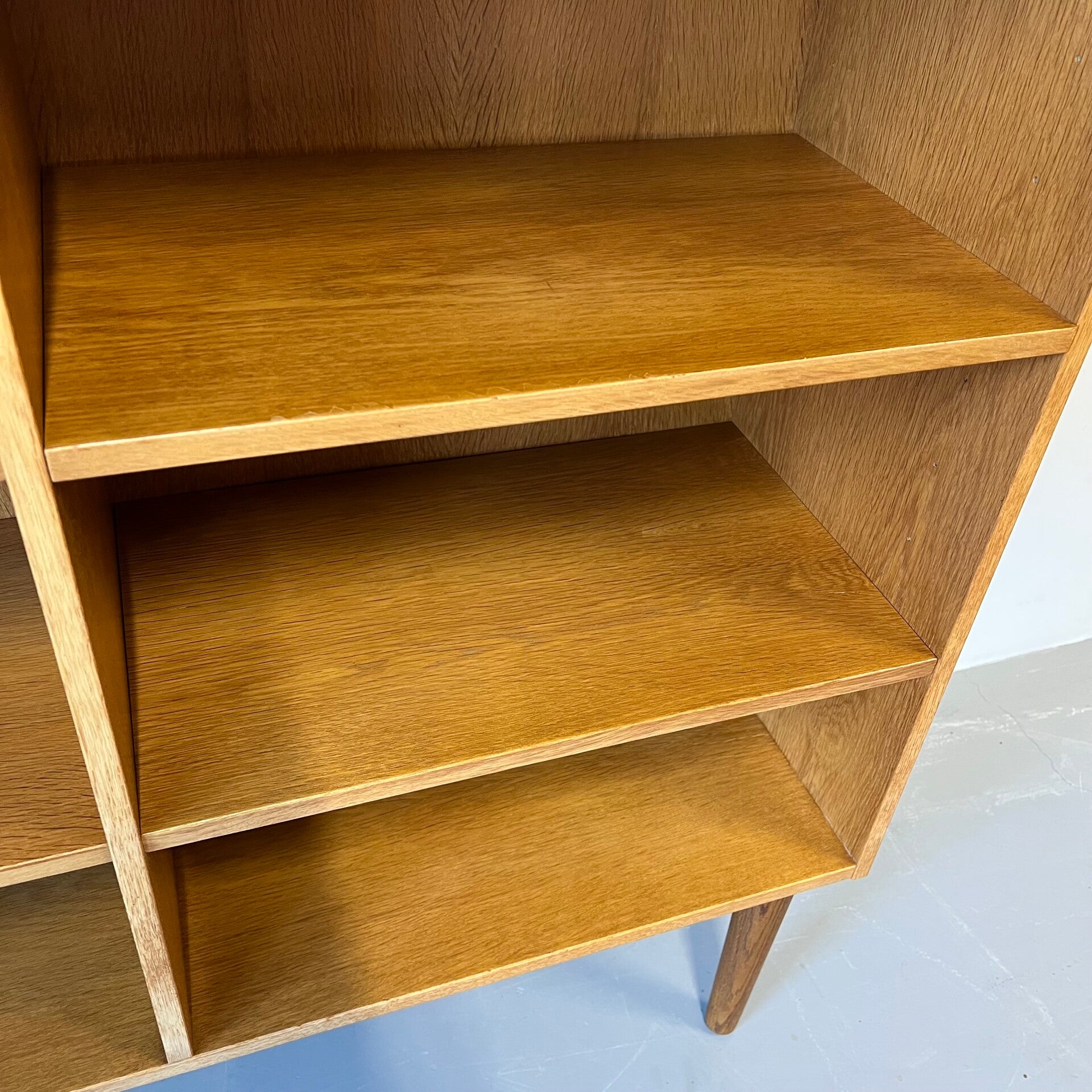 Leuk open boekenkastje, uitgevoerd in eiken (fineer) en op slanke conische pootjes (later toegevoegd).