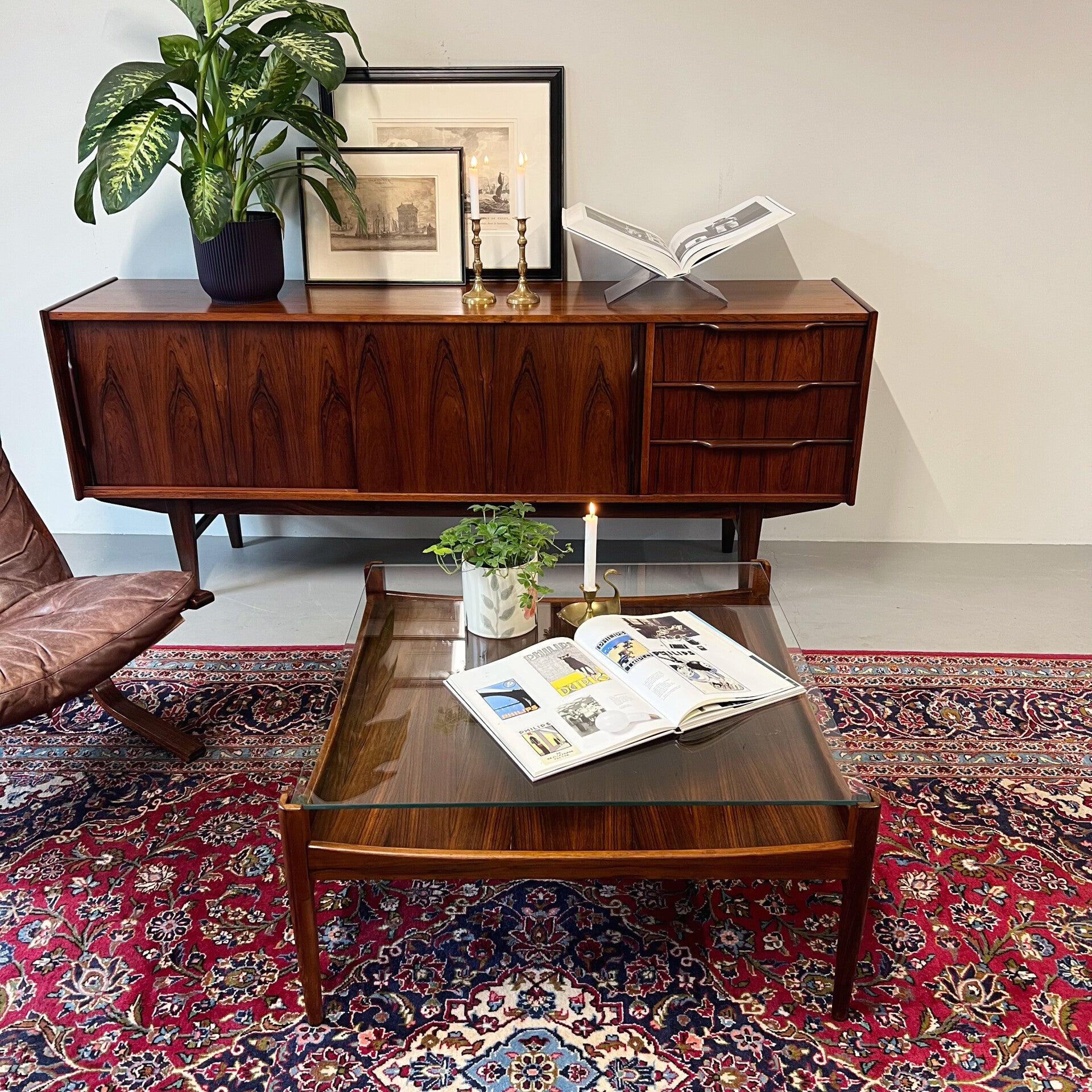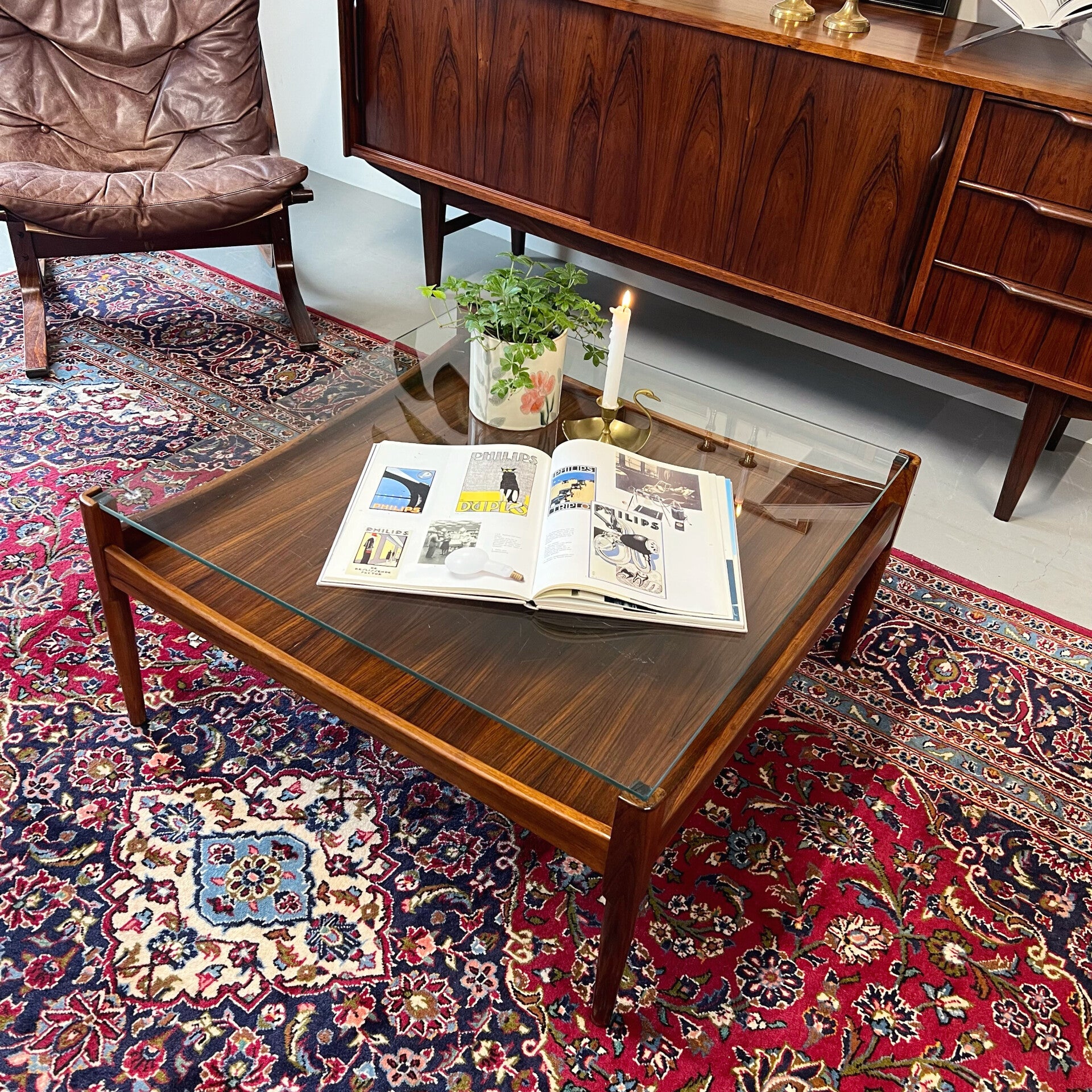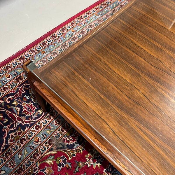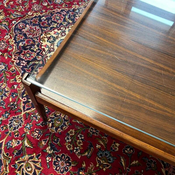 Mooie elegante vintage salontafel met afneembaar glazen blad in rosewood (palissander) fineer.