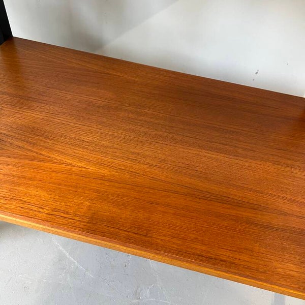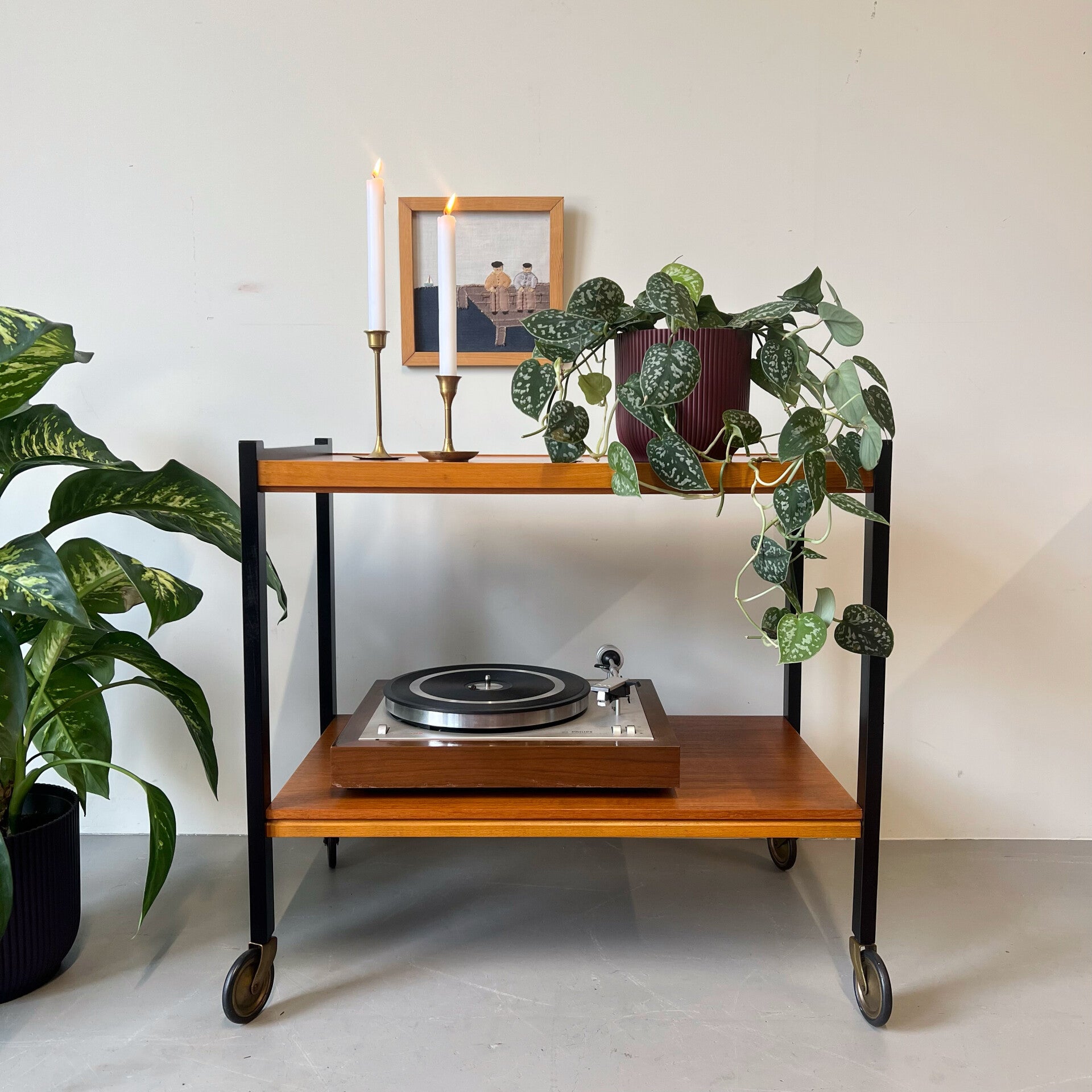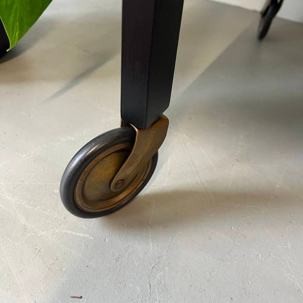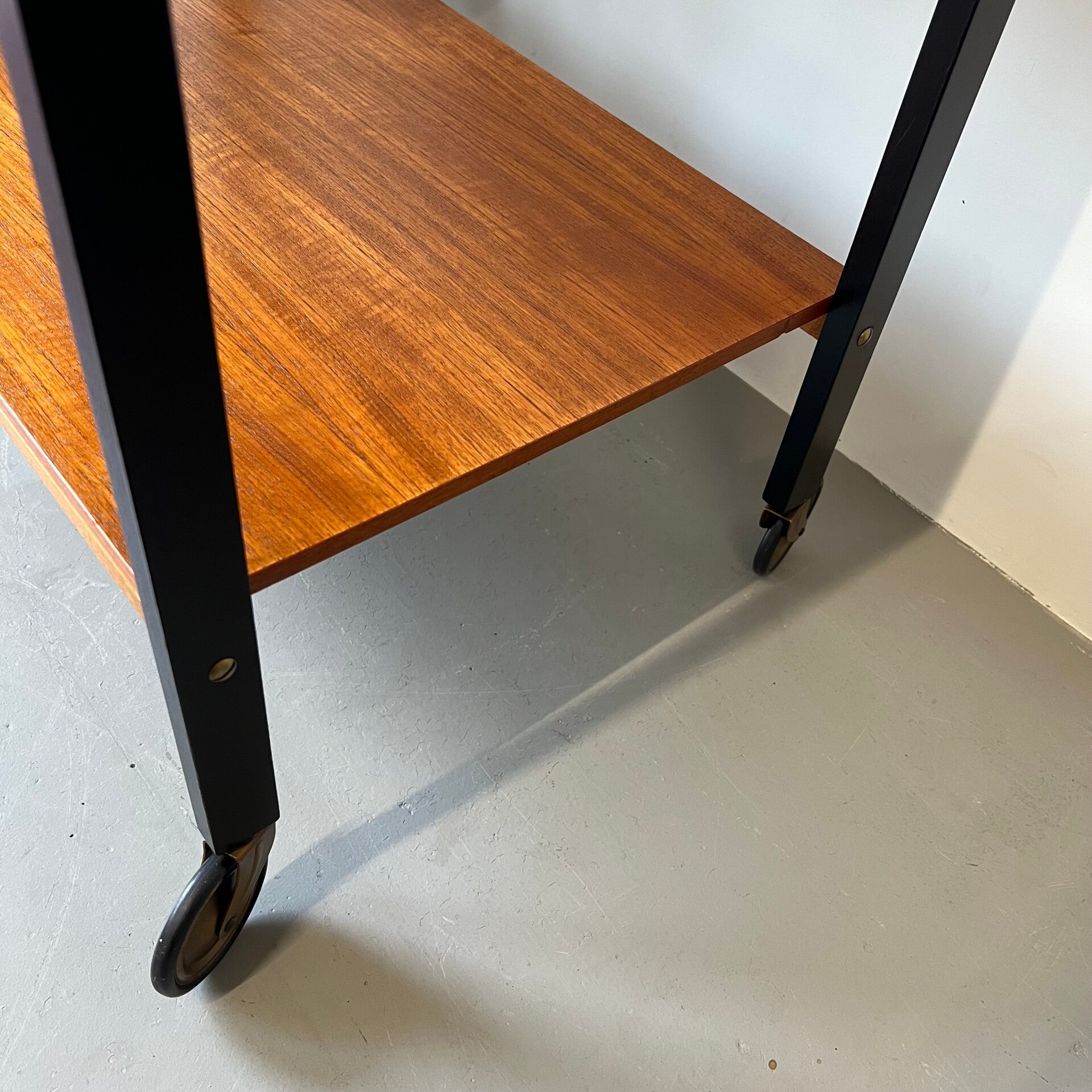 Leuke vintage trolley of serveerwagen, uitgevoerd in teak (fineer) met zwart houten frame en zwenkwielen.