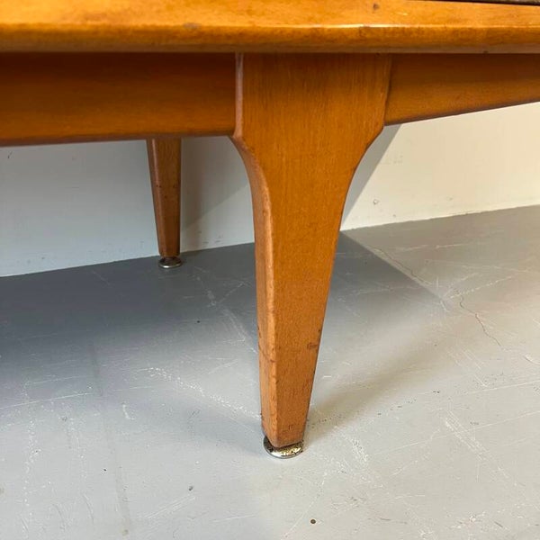 In het midden 3 ruime lades, waarvan de bovenste voorzien van vakverdeling en groen vilt.