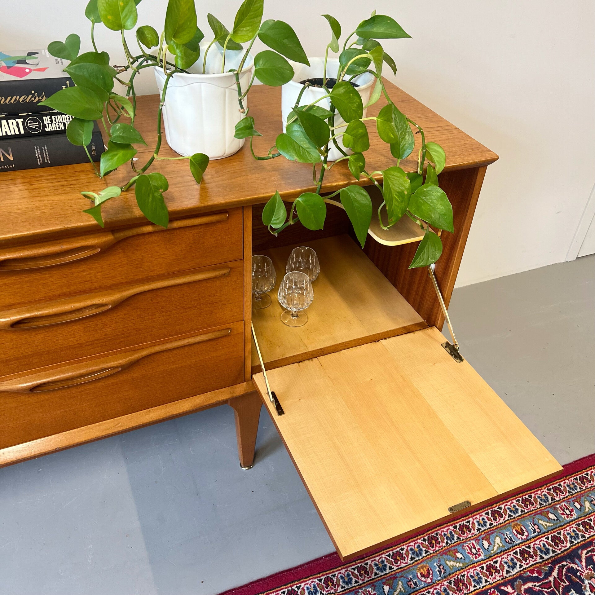 Rechts een barkast met klep en plank.