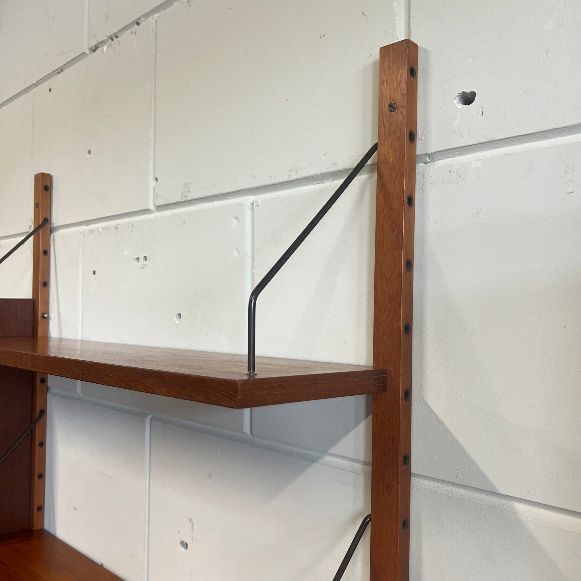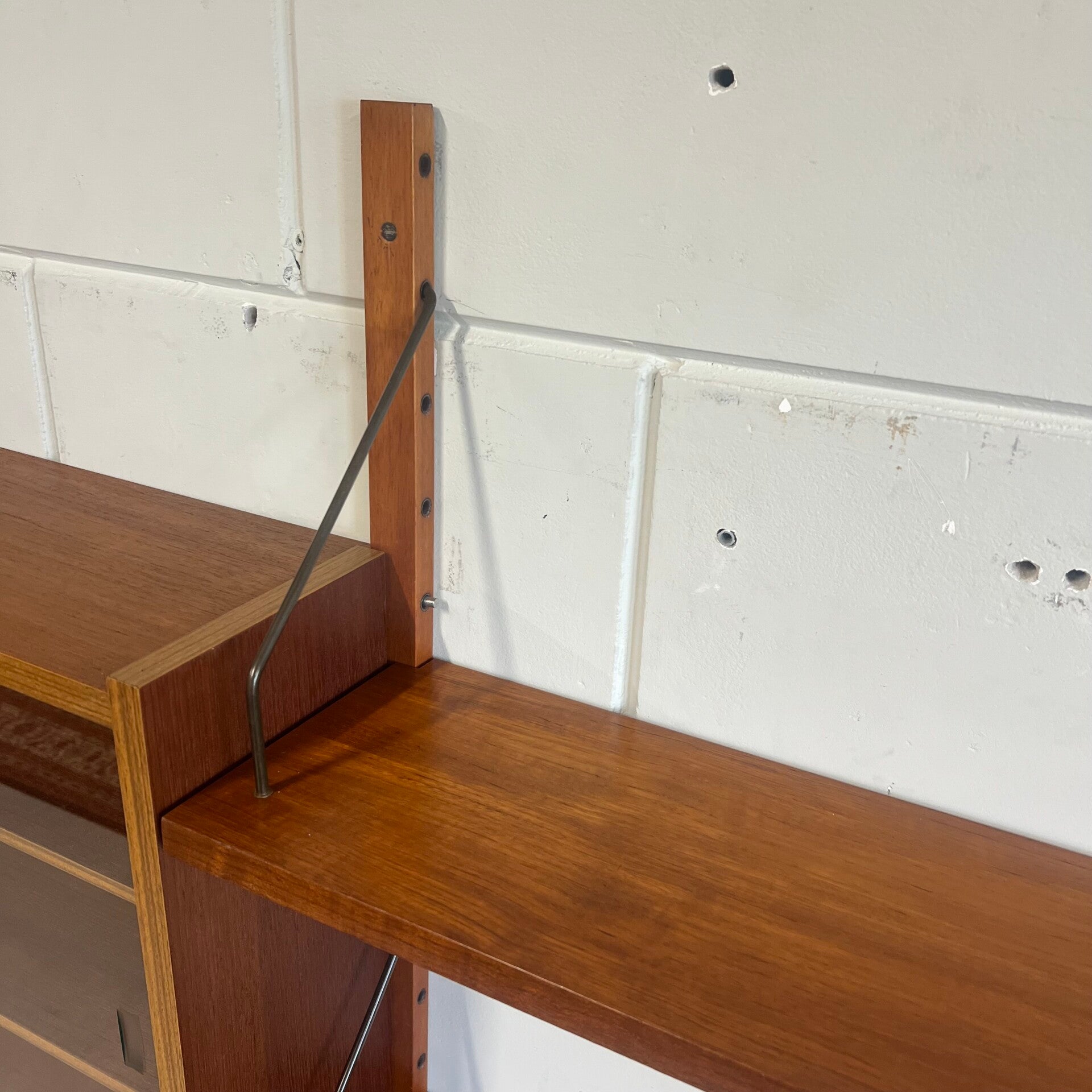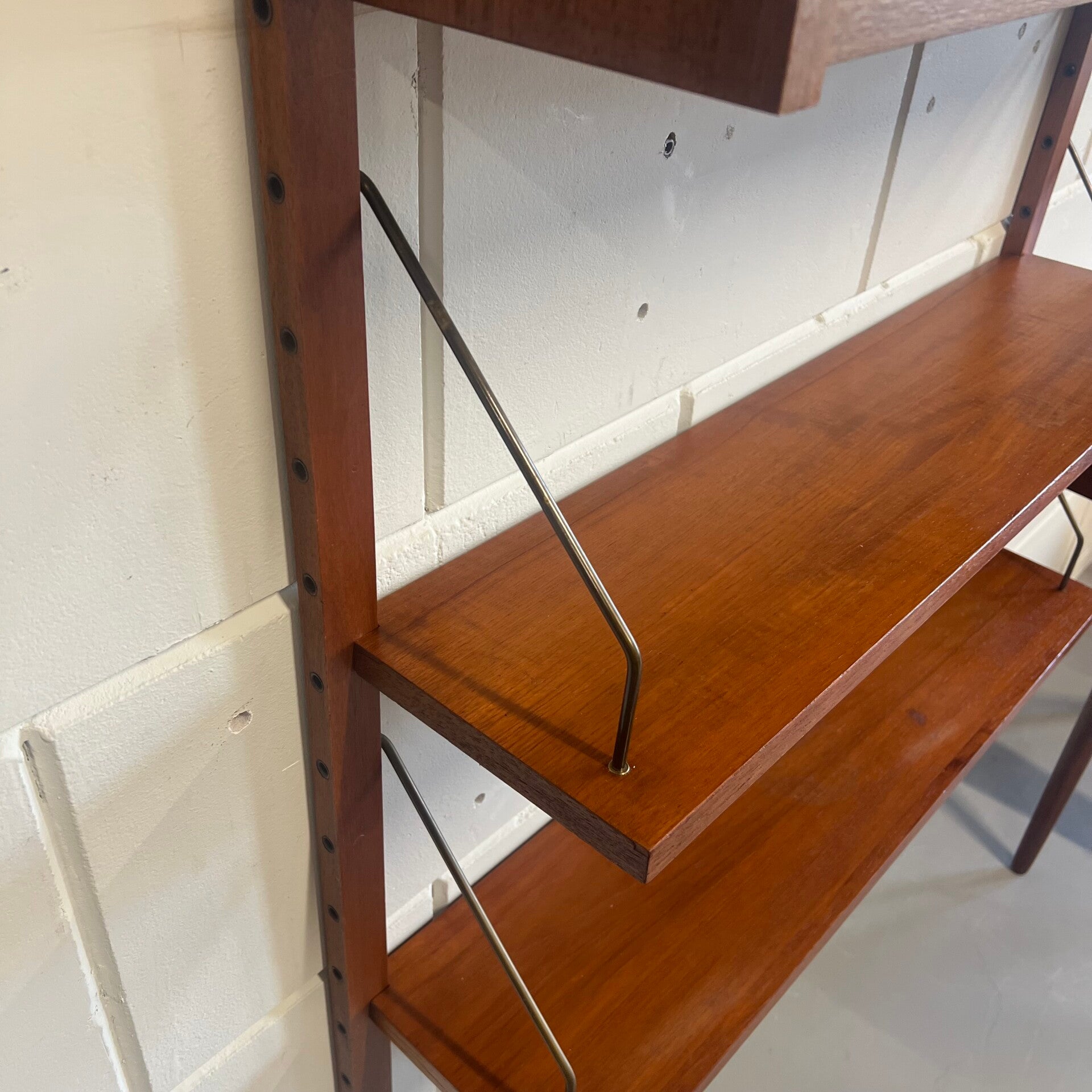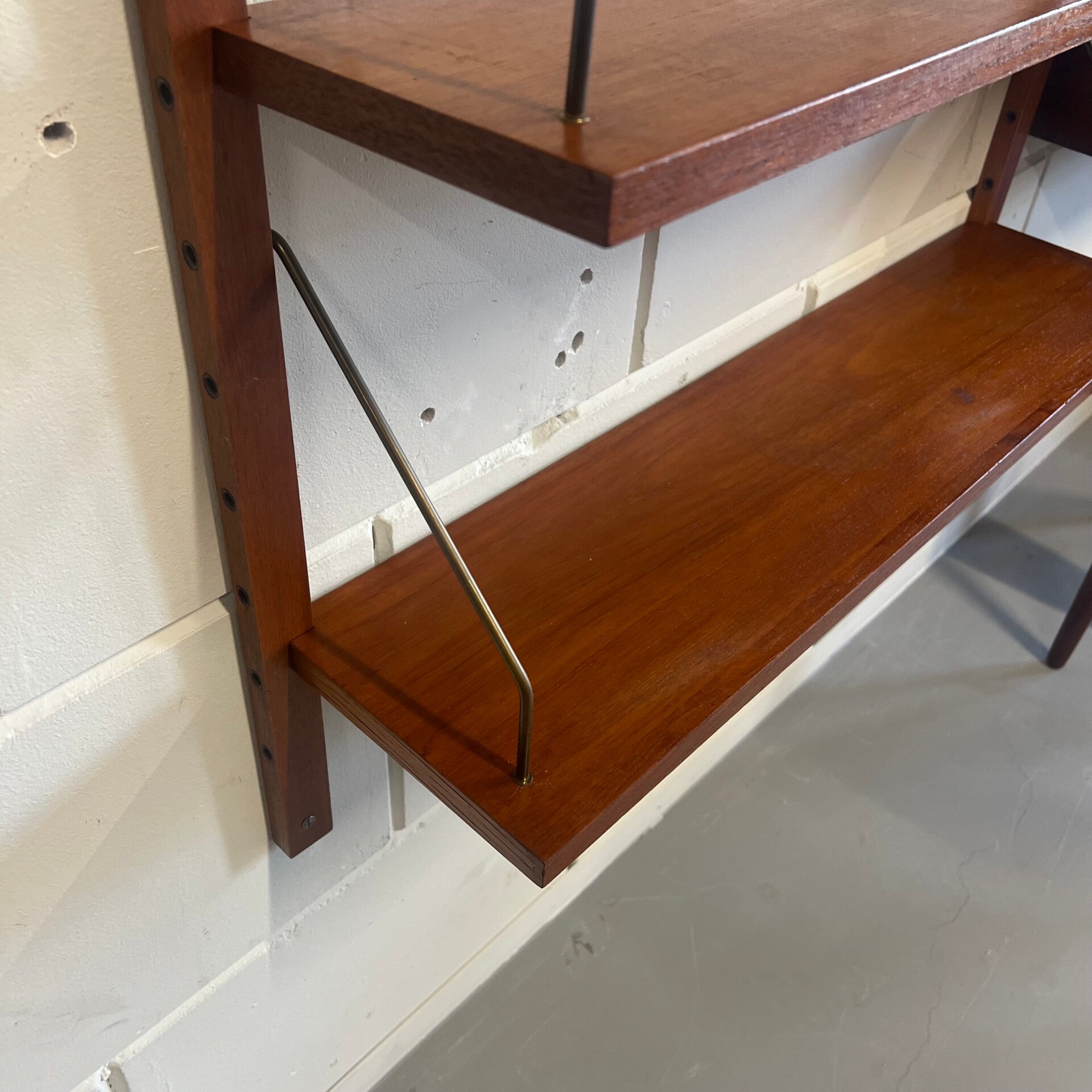 Prachtig vintage teakhouten wandsysteem, PS system, met messing beugels (patina).