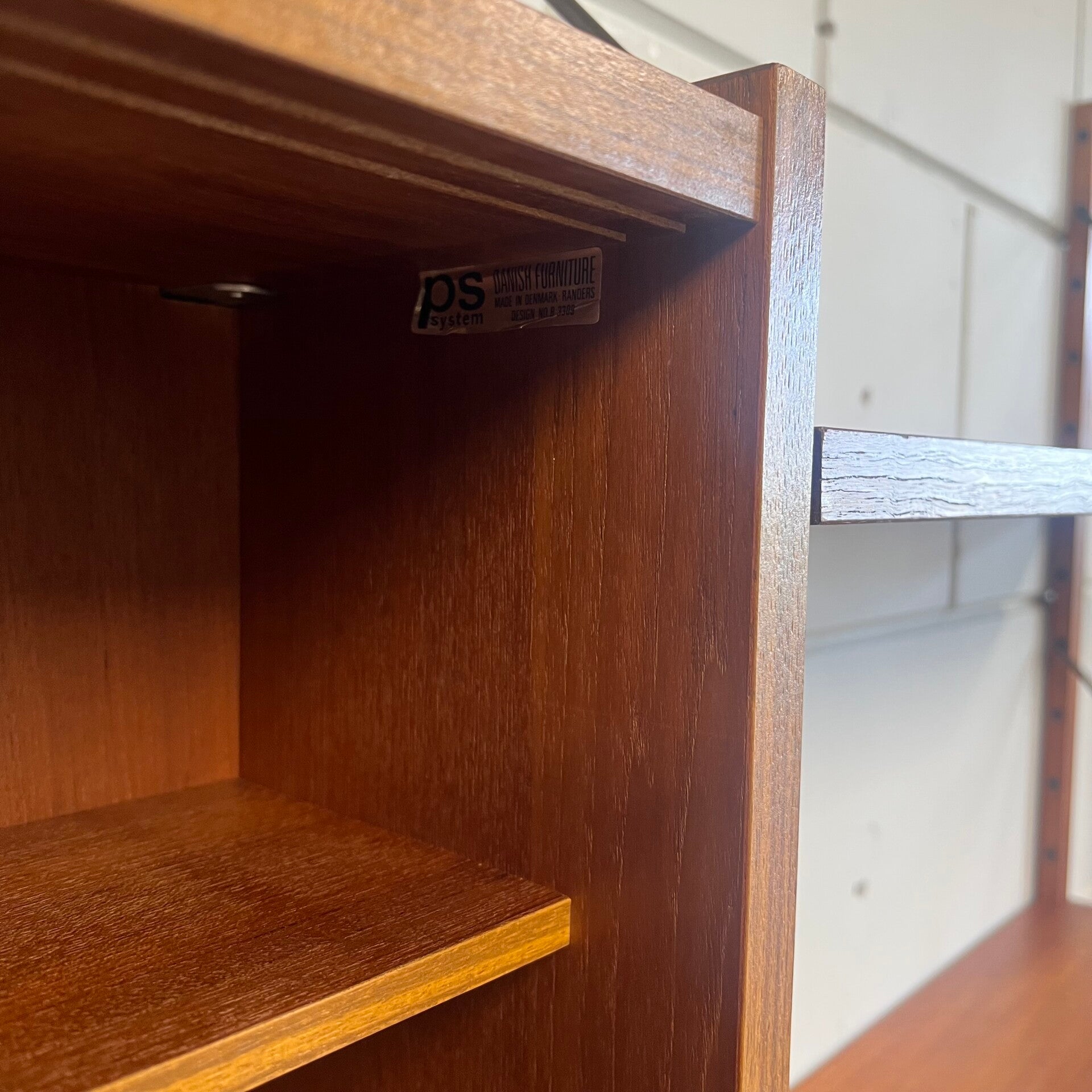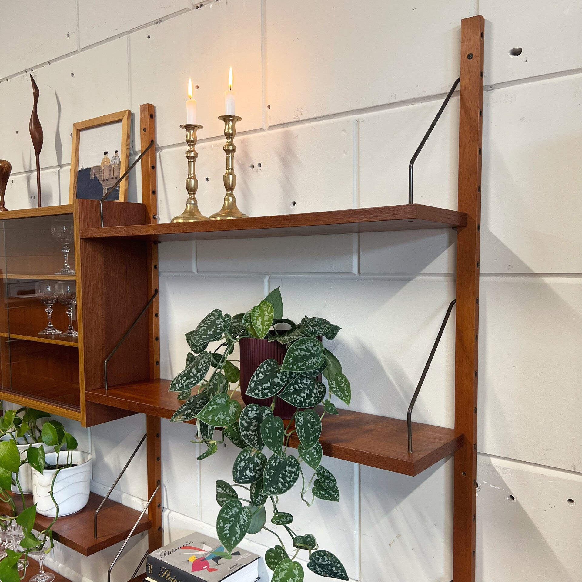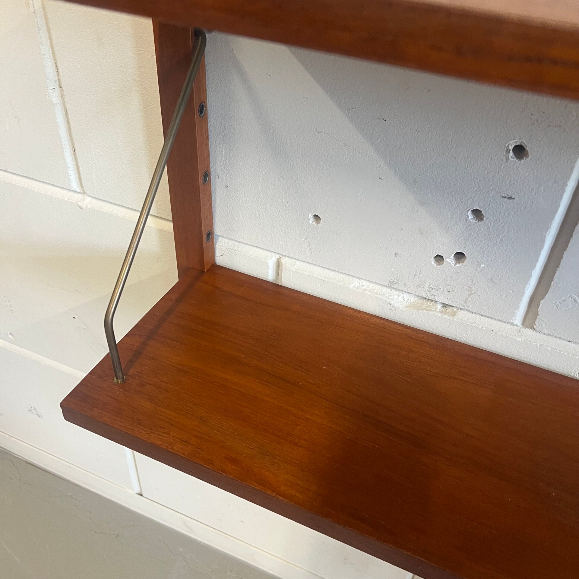 Prachtig vintage teakhouten wandsysteem, PS system, met messing beugels (patina).