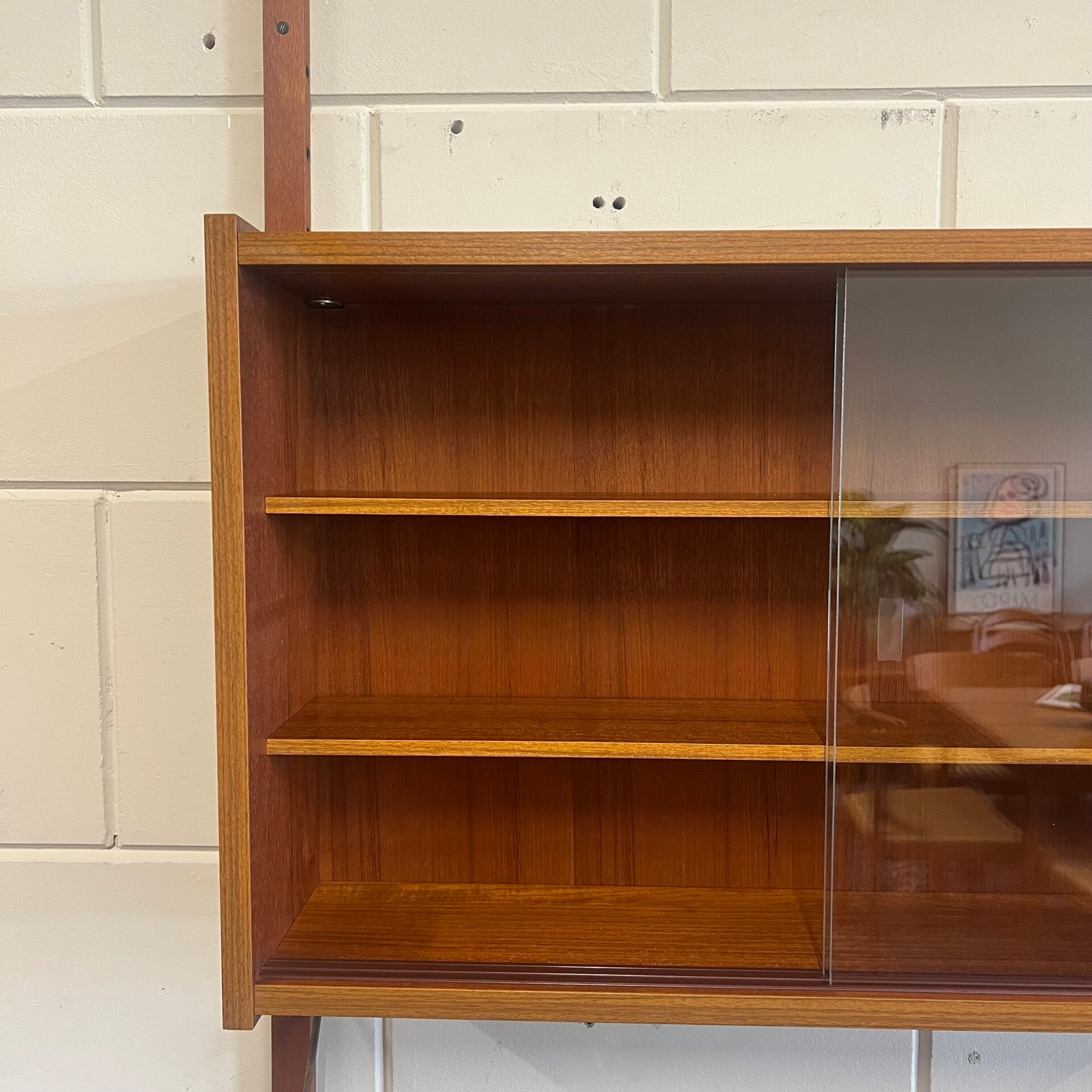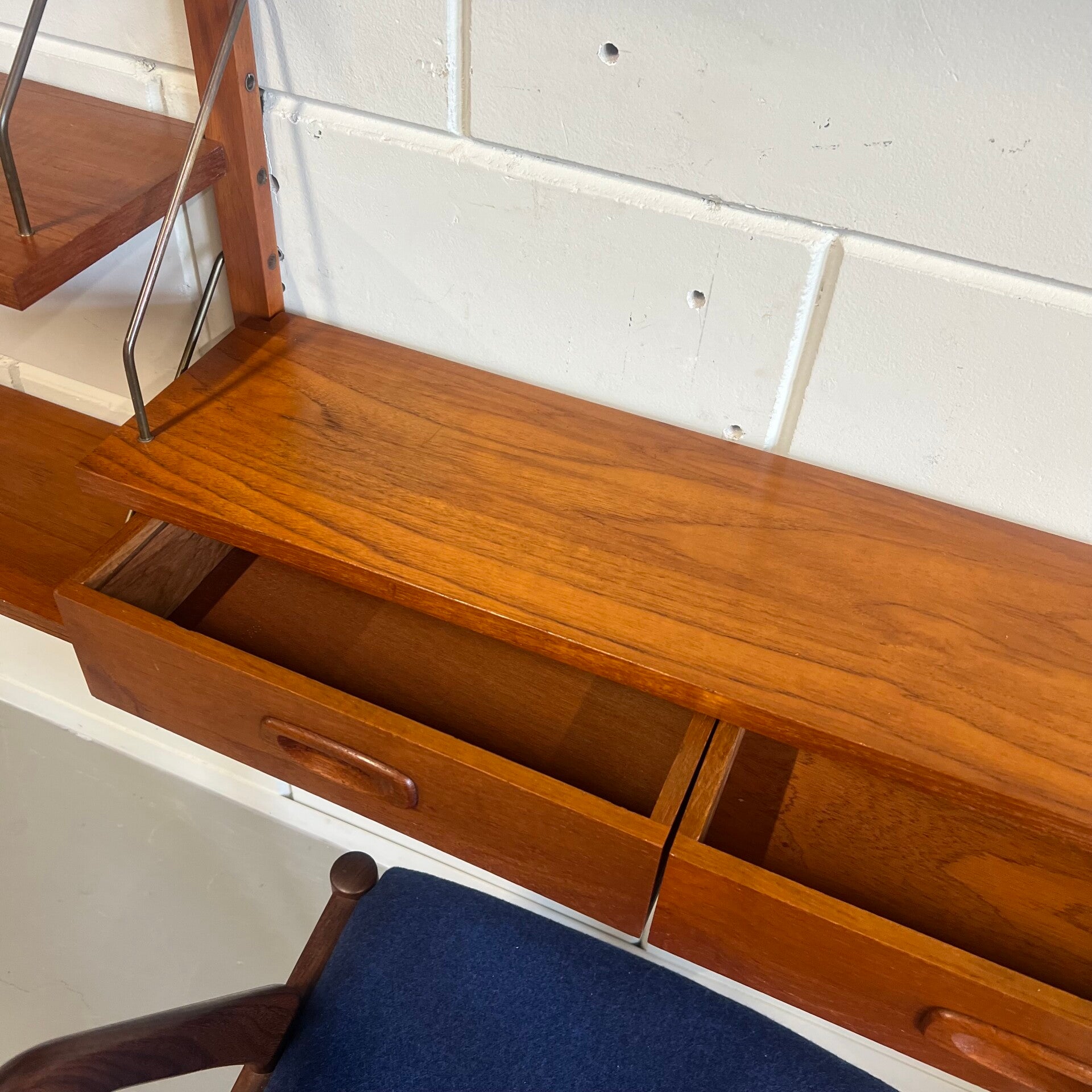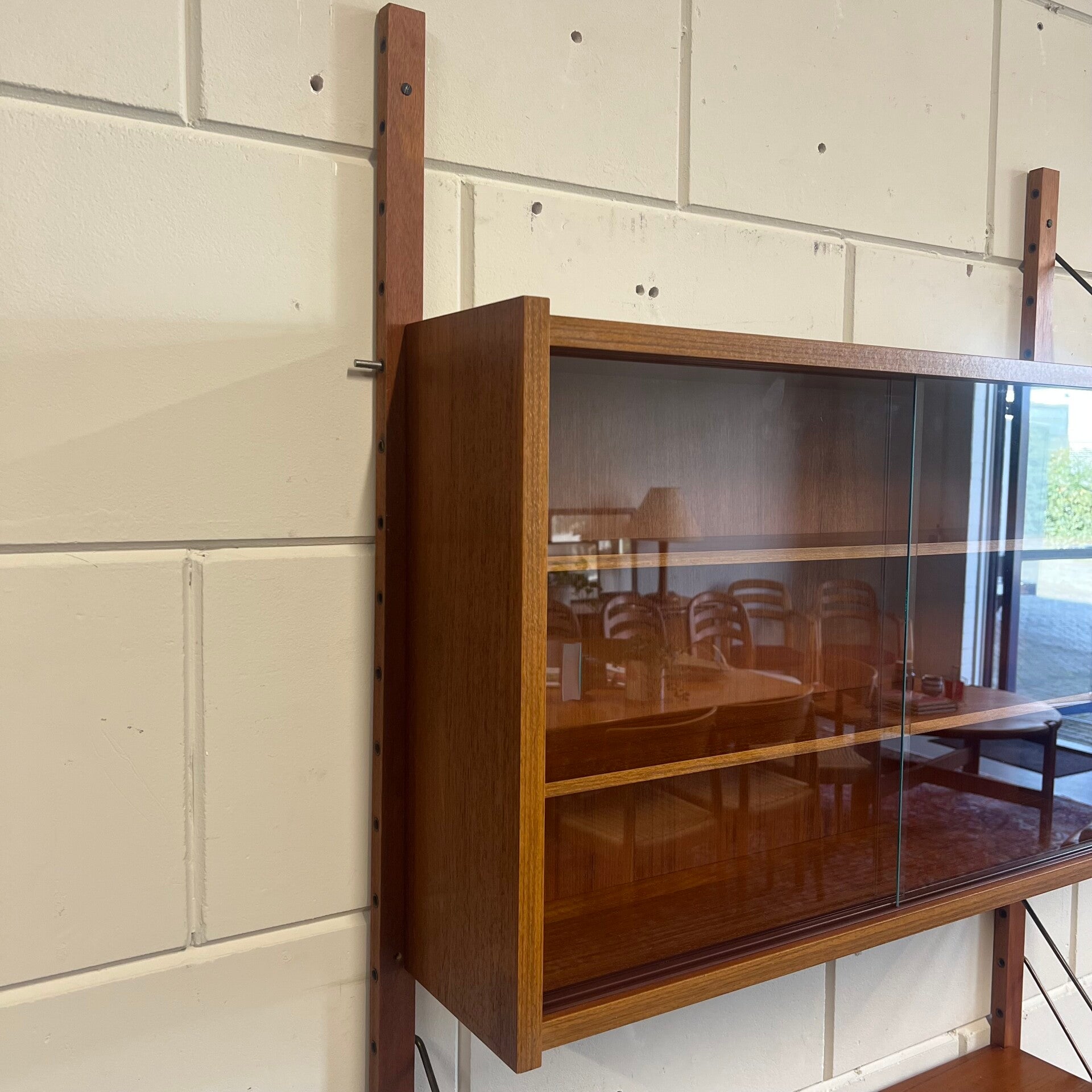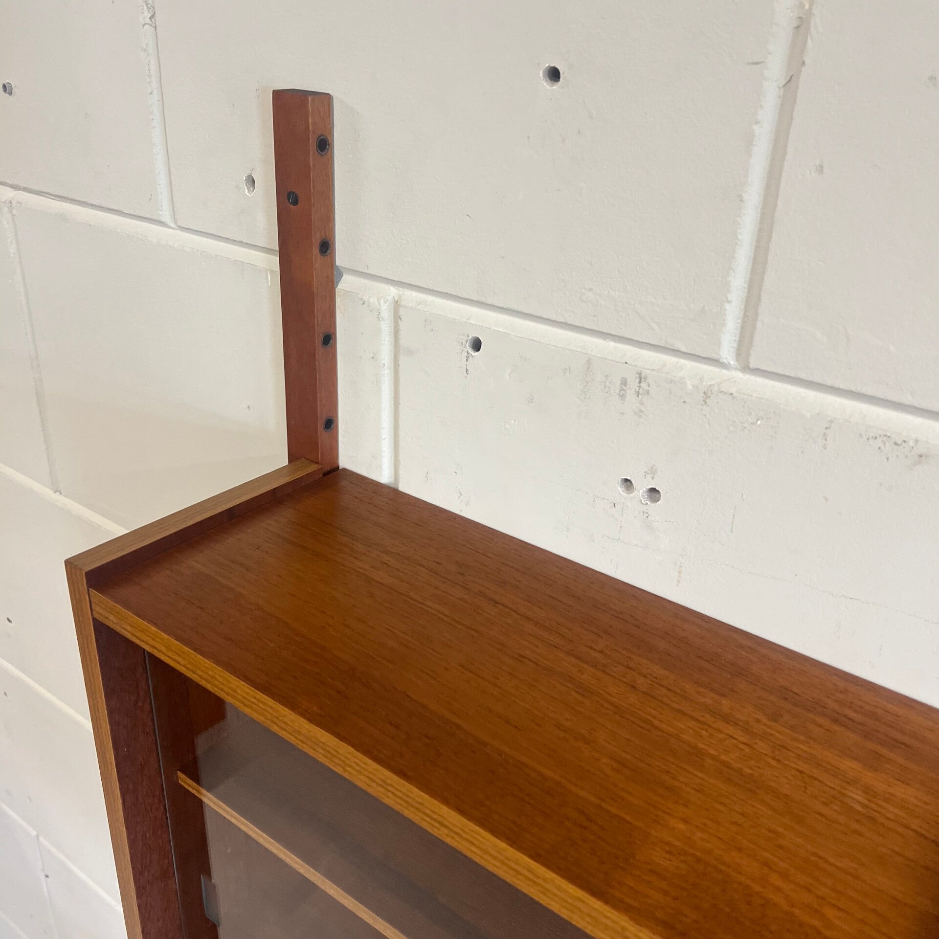 Prachtig vintage teakhouten wandsysteem, PS system, met messing beugels (patina).