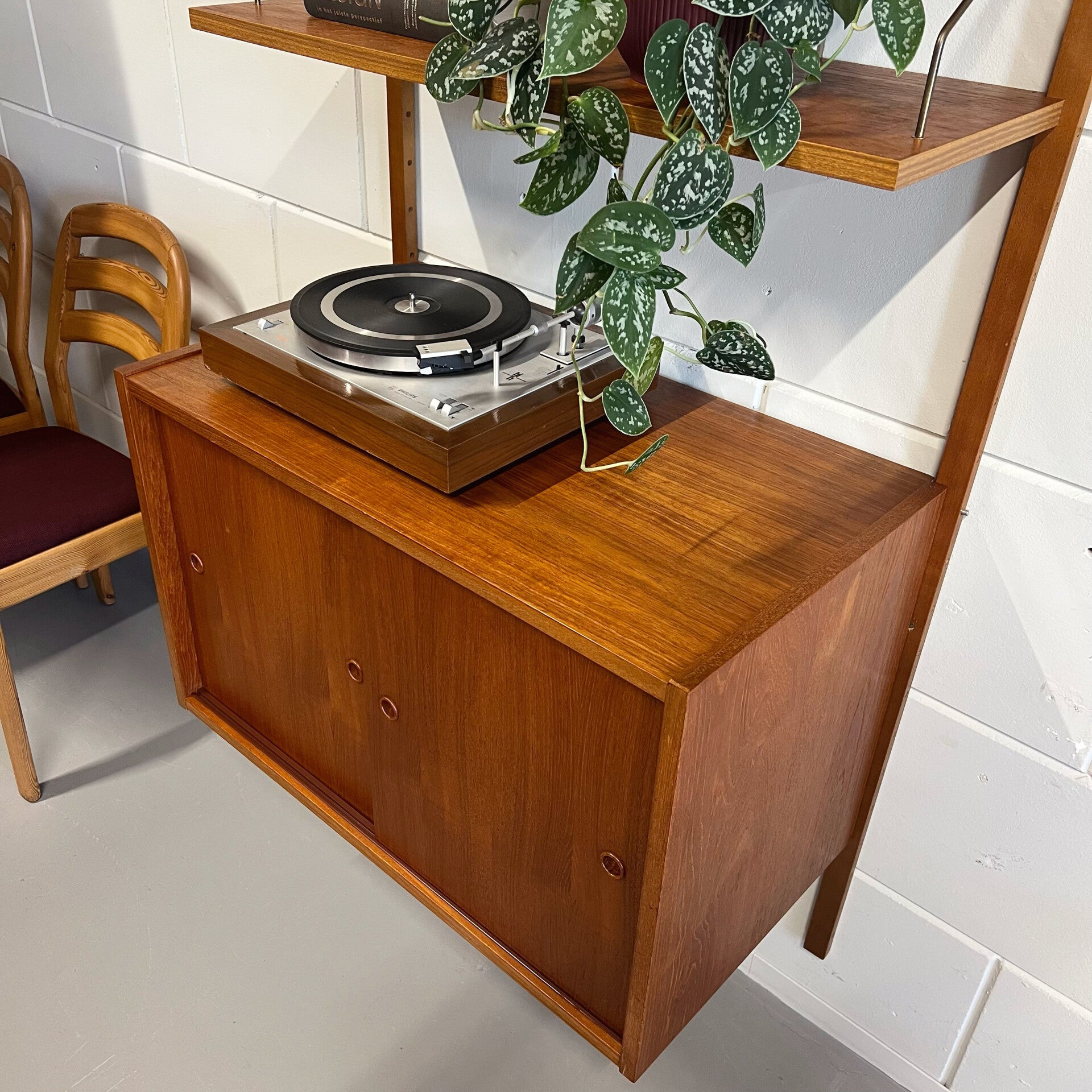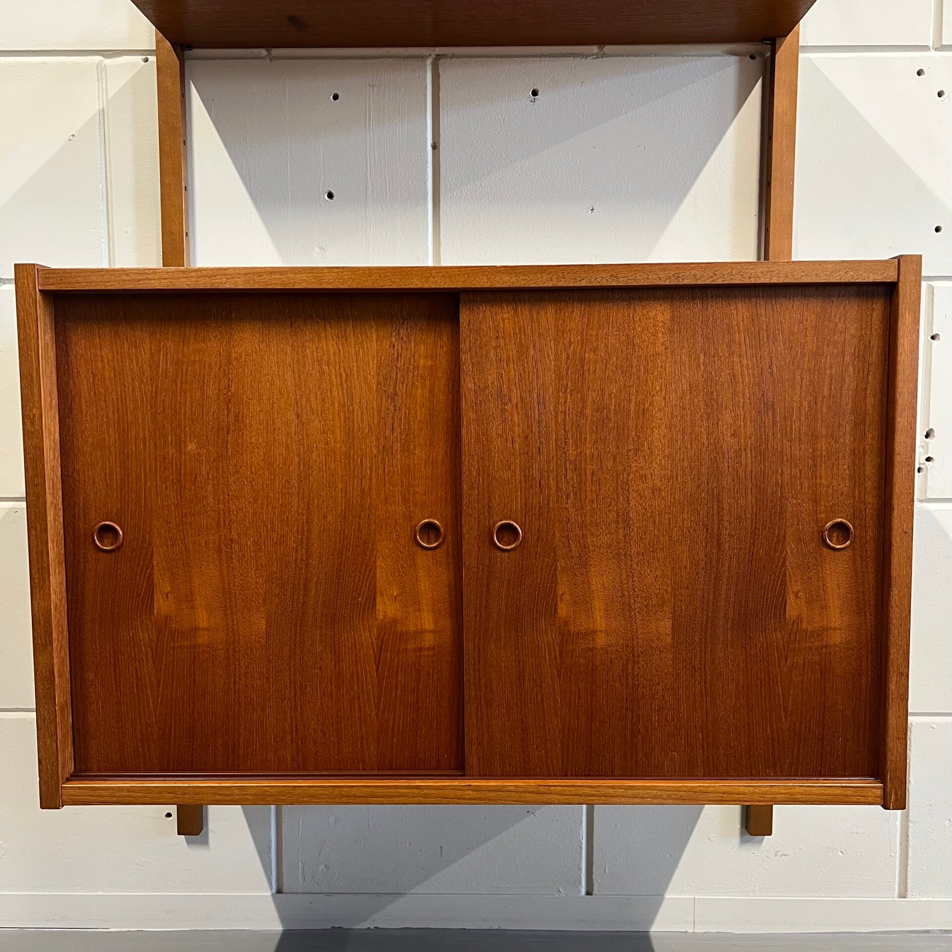 Prachtig vintage teakhouten wandsysteem, PS system, met messing beugels (patina).