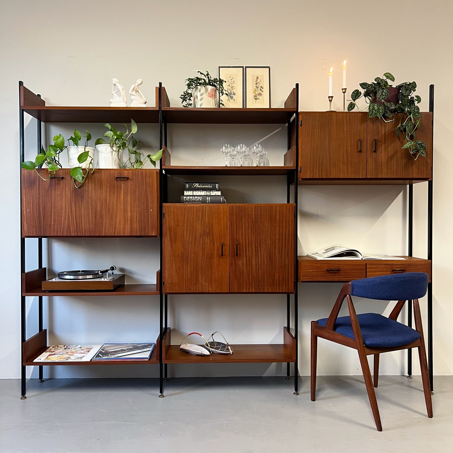 Prachtig karakteristiek vintage wandmeubel in teak (fineer) met zwart beslag en zwart metalen staanders met stelpoten.