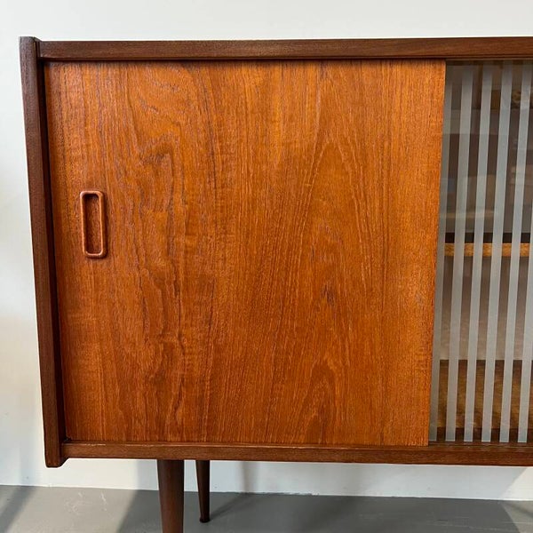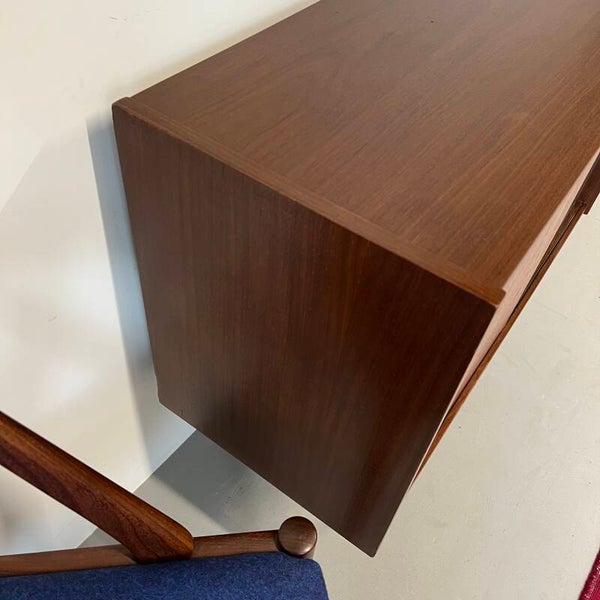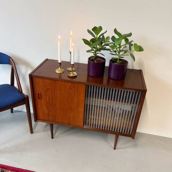 Ontzettend leuk vintage kastje, uitgevoerd in teak (fineer) en op slanke conische pootjes.