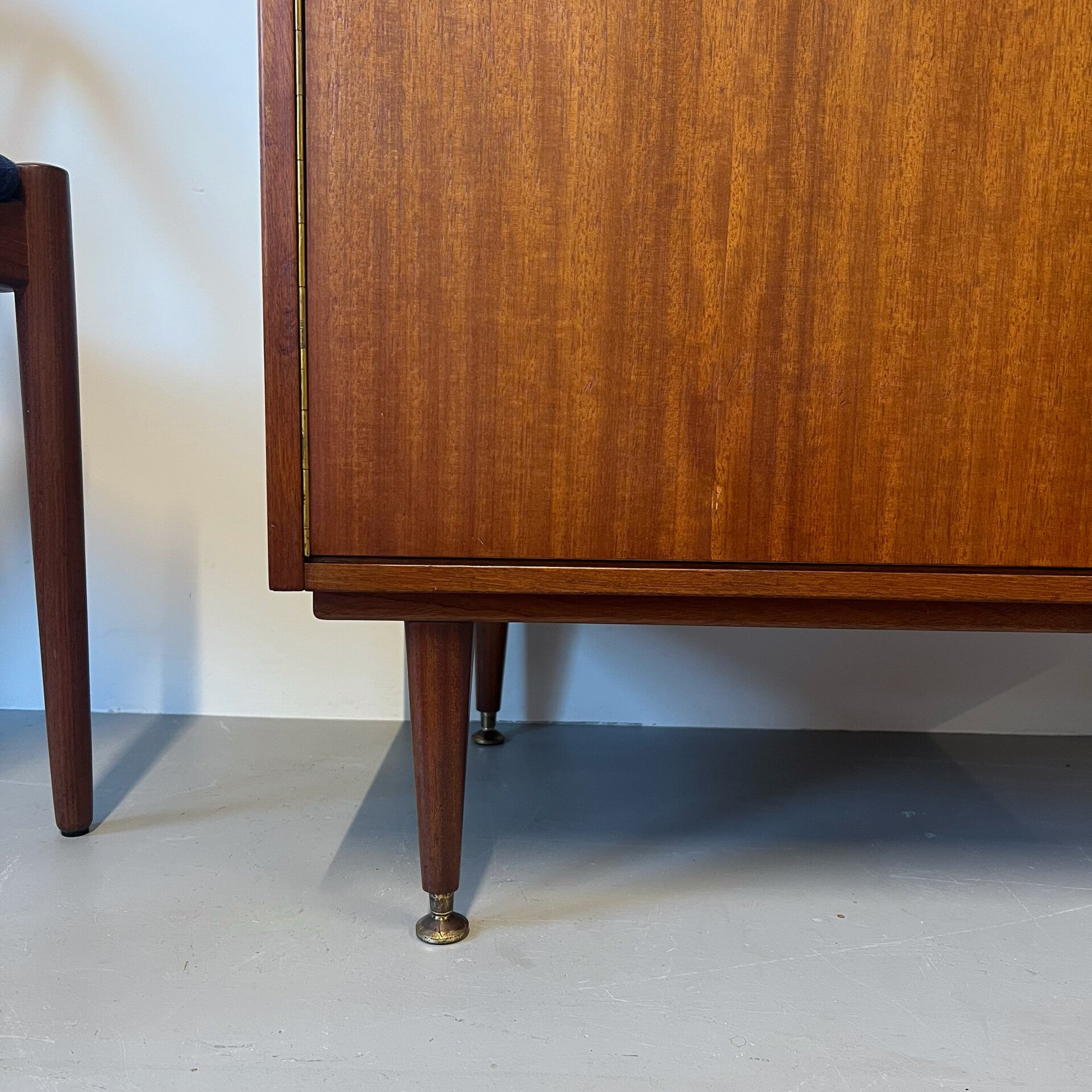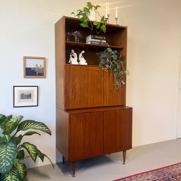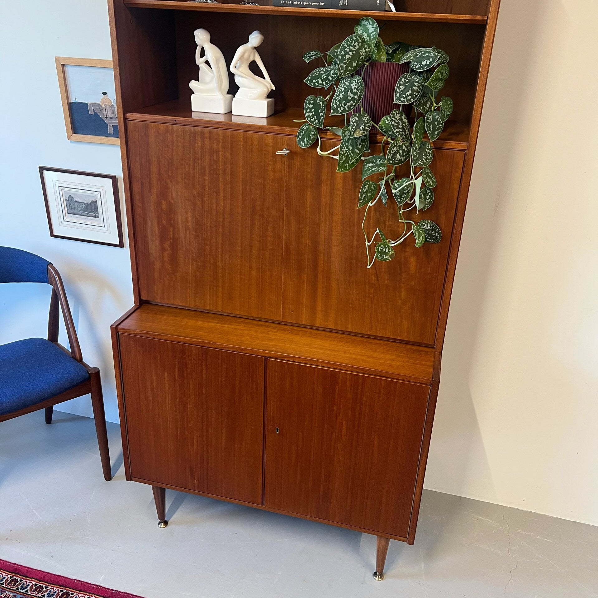 Mooie vintage boekenkast met bureau, uitgevoerd in teak fineer met authentieke conische pootjes en messing stelschroef.