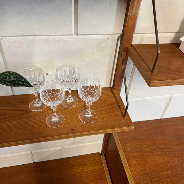 Prachtig vintage teakhouten wandsysteem, PS system, met messing beugels (patina) en houten wandlatten.