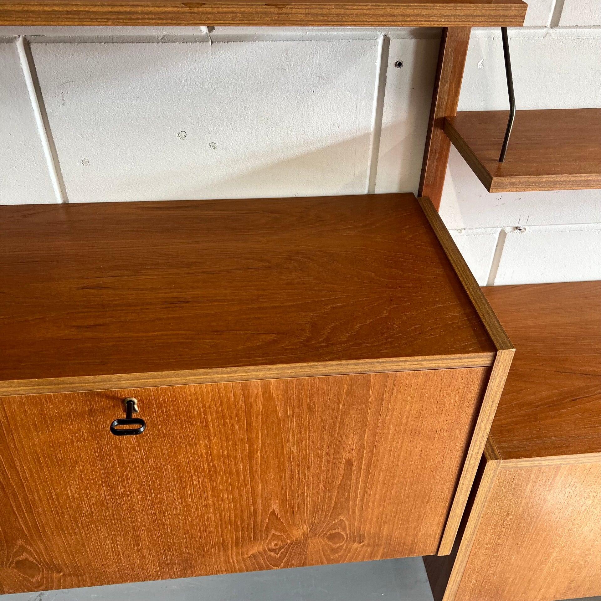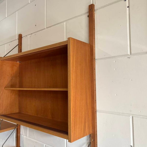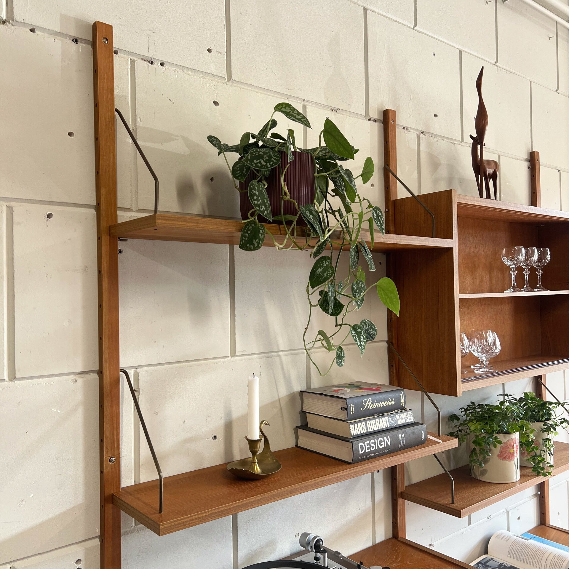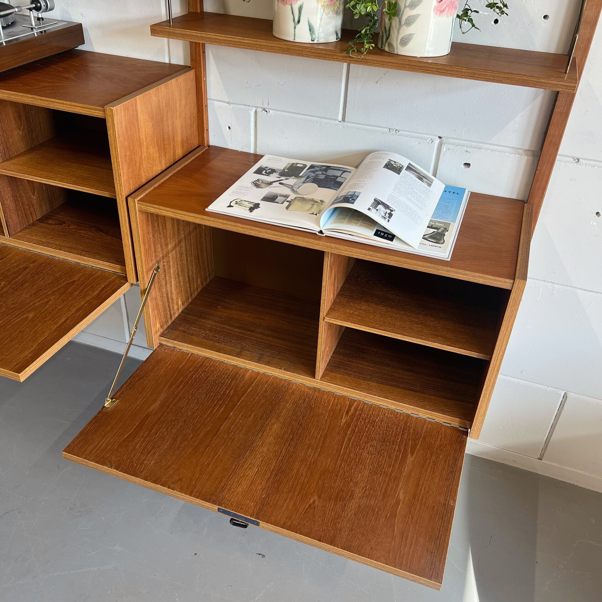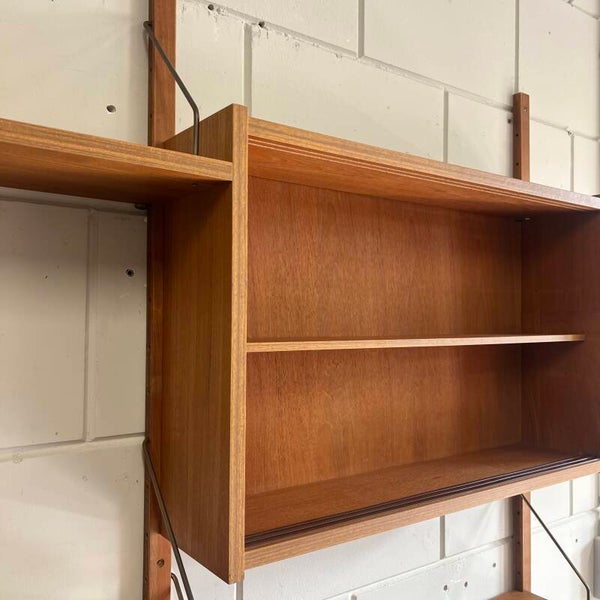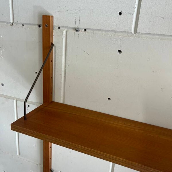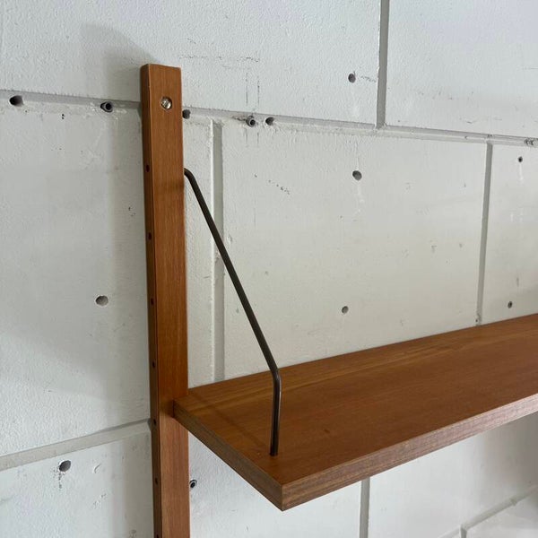 De kleinere variant van het eerder getoonde XL meubel; dit teakhouten wandsysteem, PS system, met messing beugels (patina) en houten wandlatten.