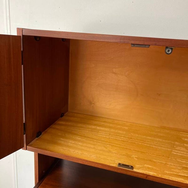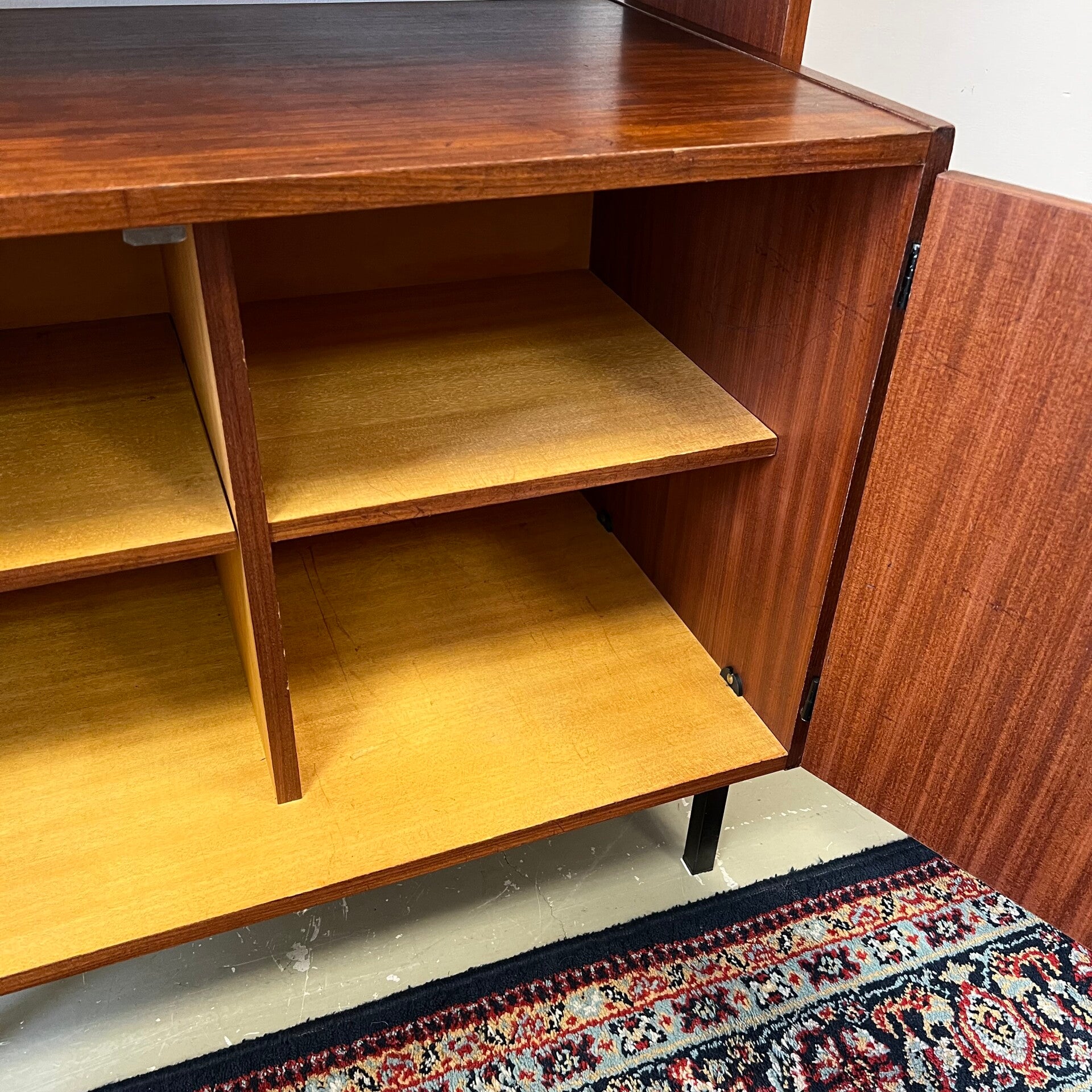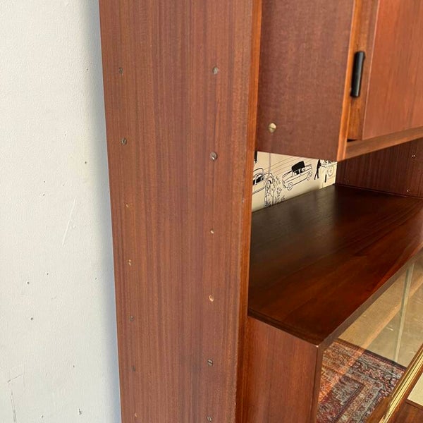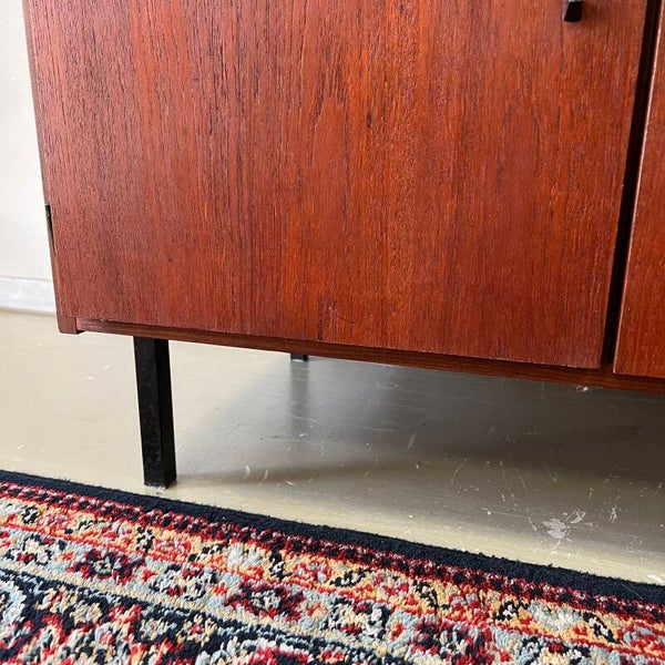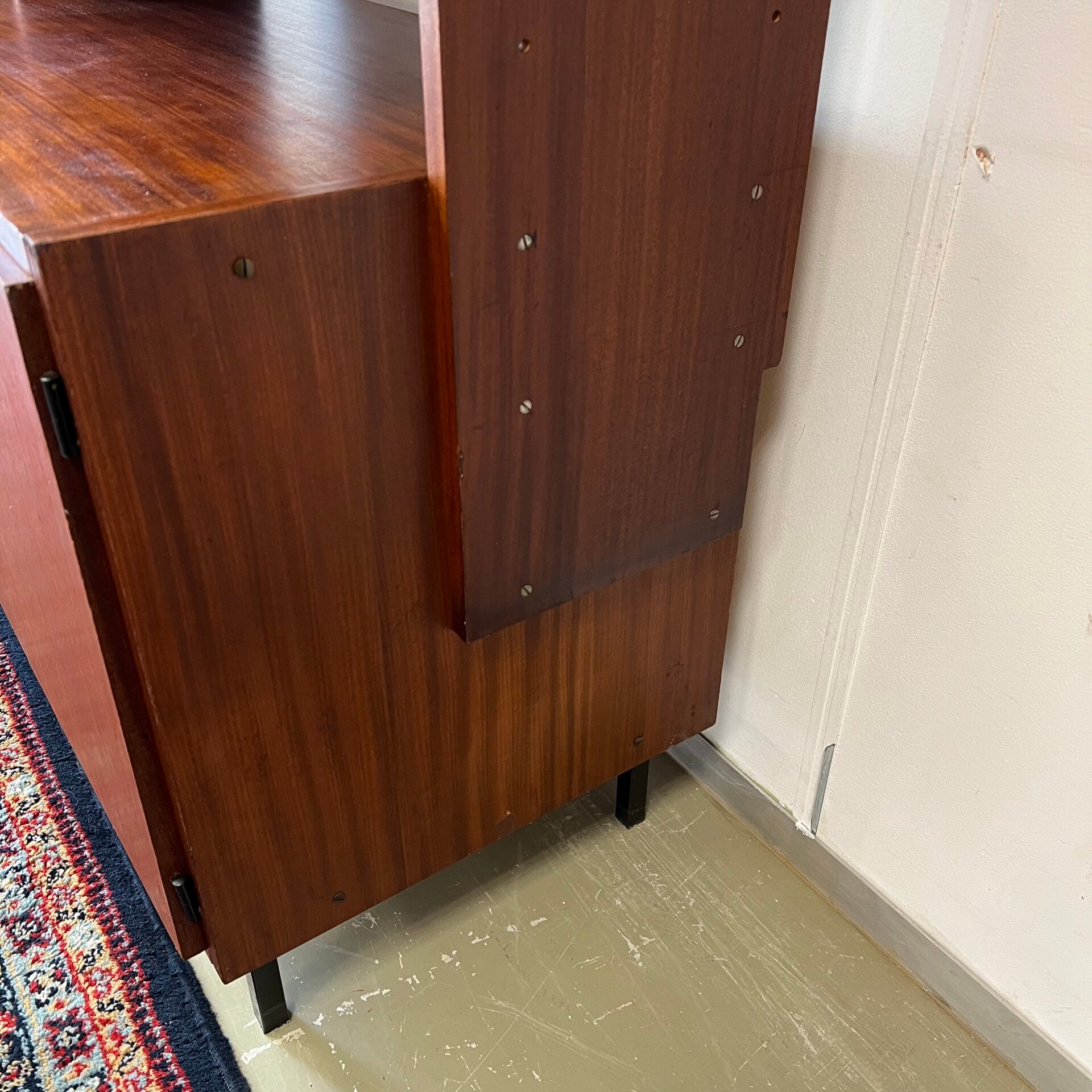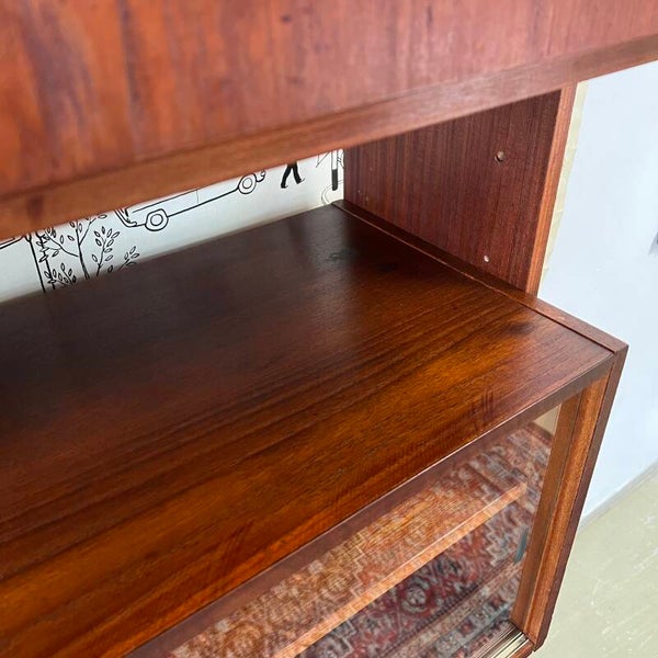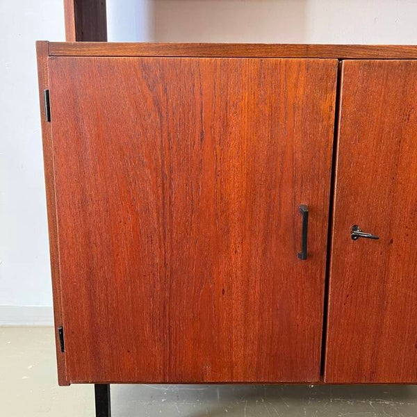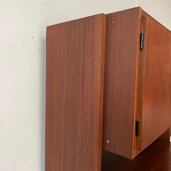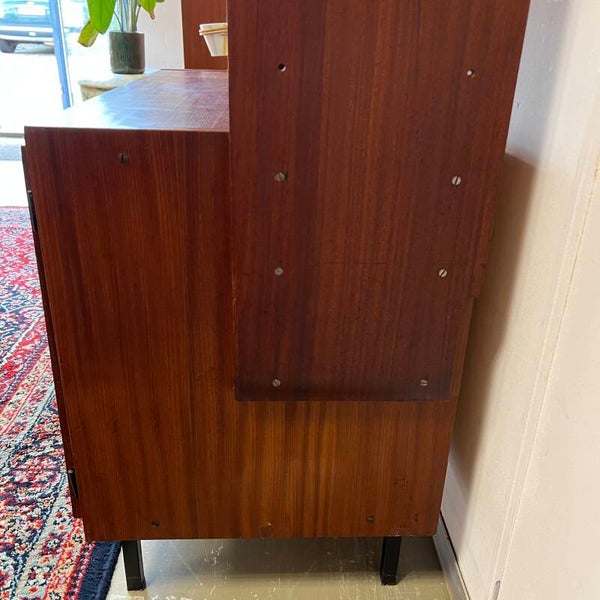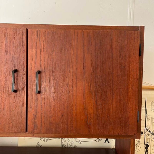 Prachtig karakteristiek wandmeubel in teak (fineer) met zwart beslag en poten.