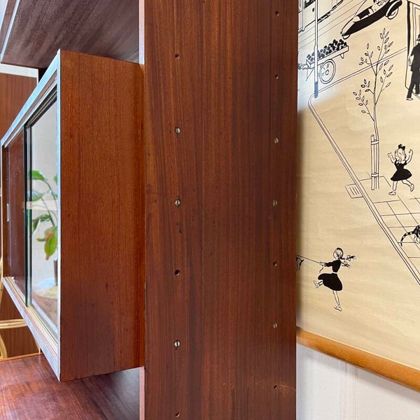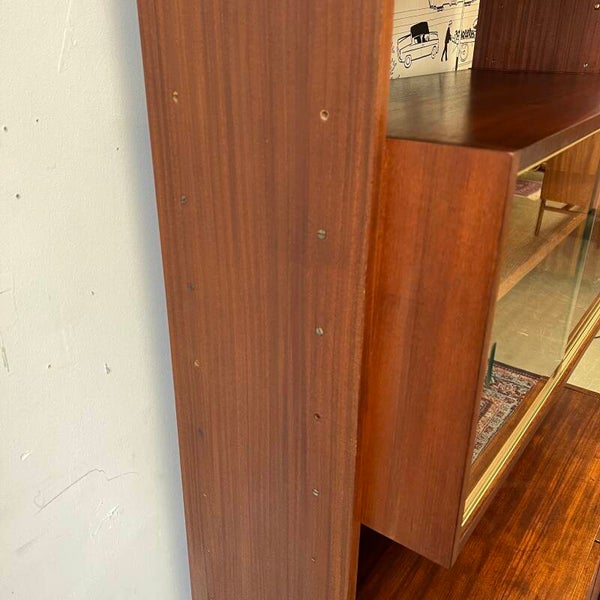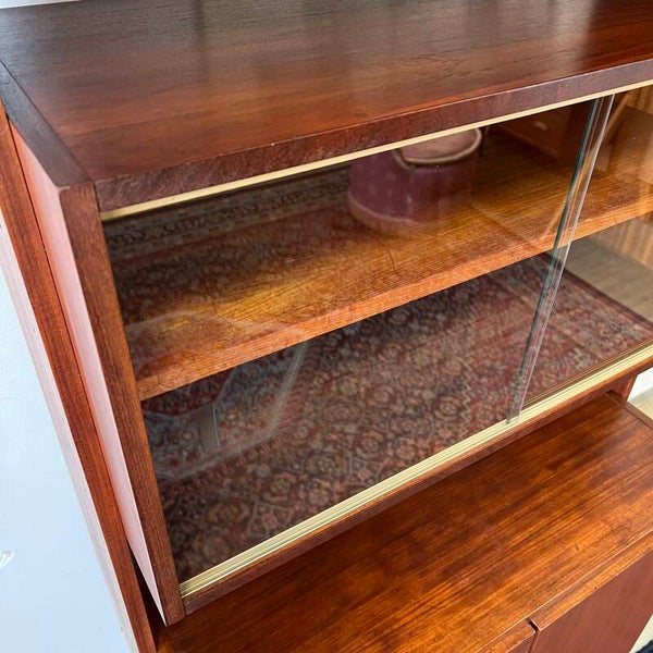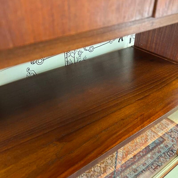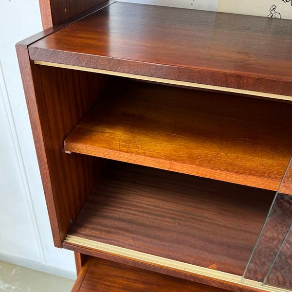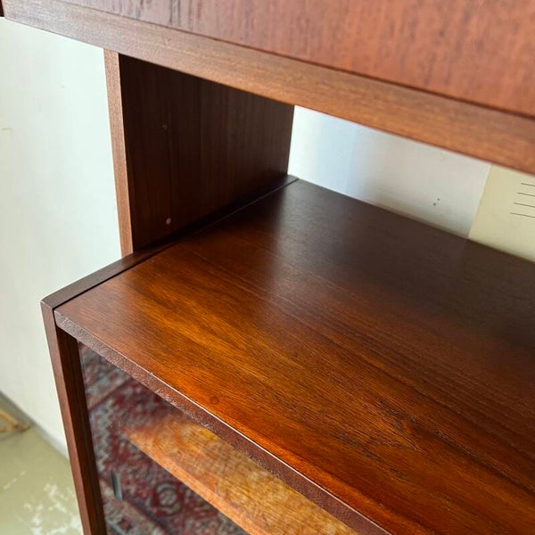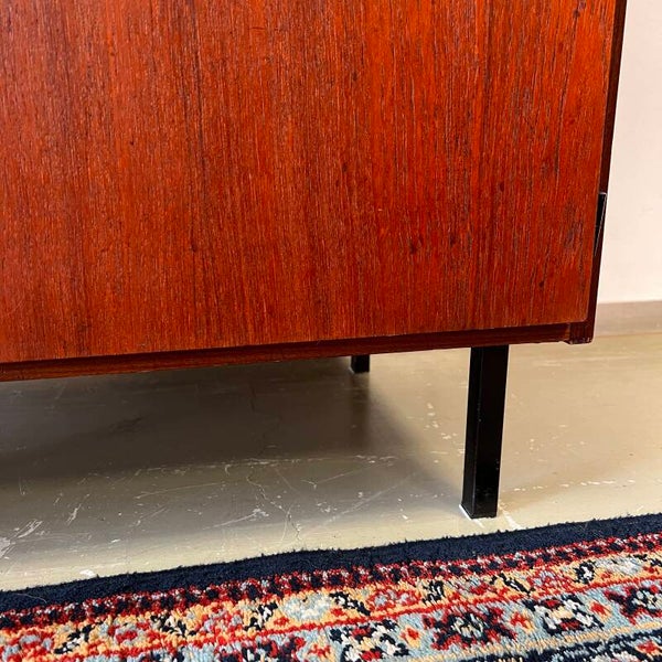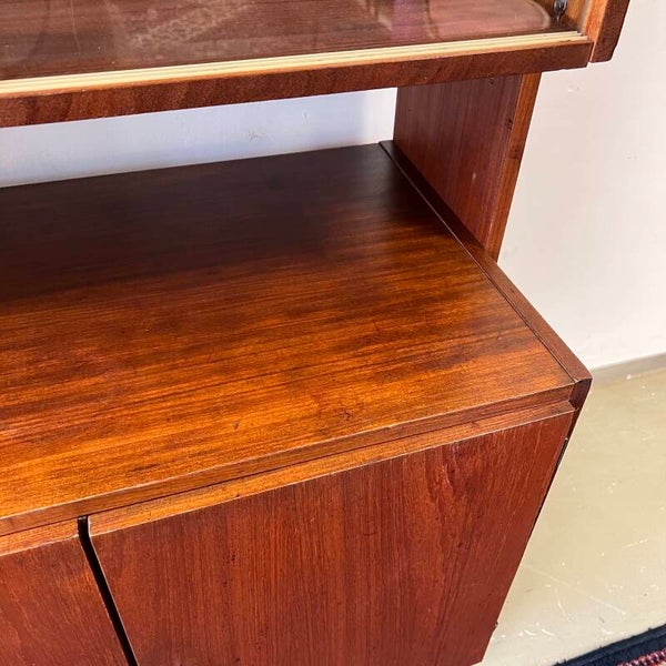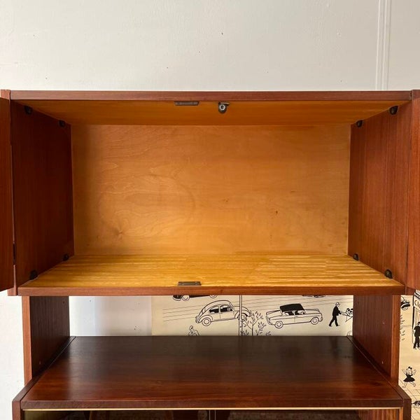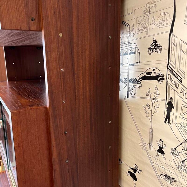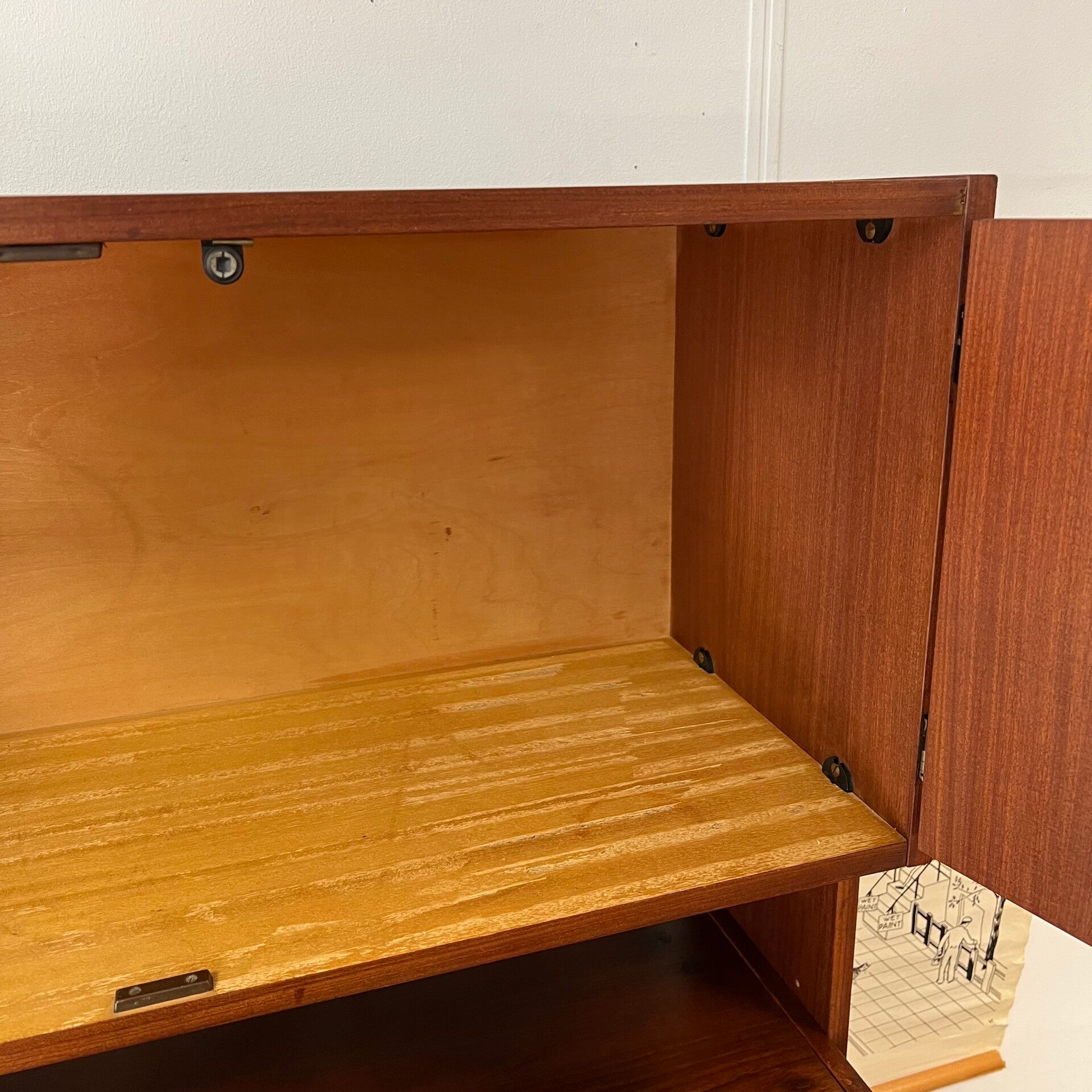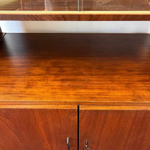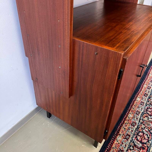 Prachtig karakteristiek wandmeubel in teak (fineer) met zwart beslag en poten.