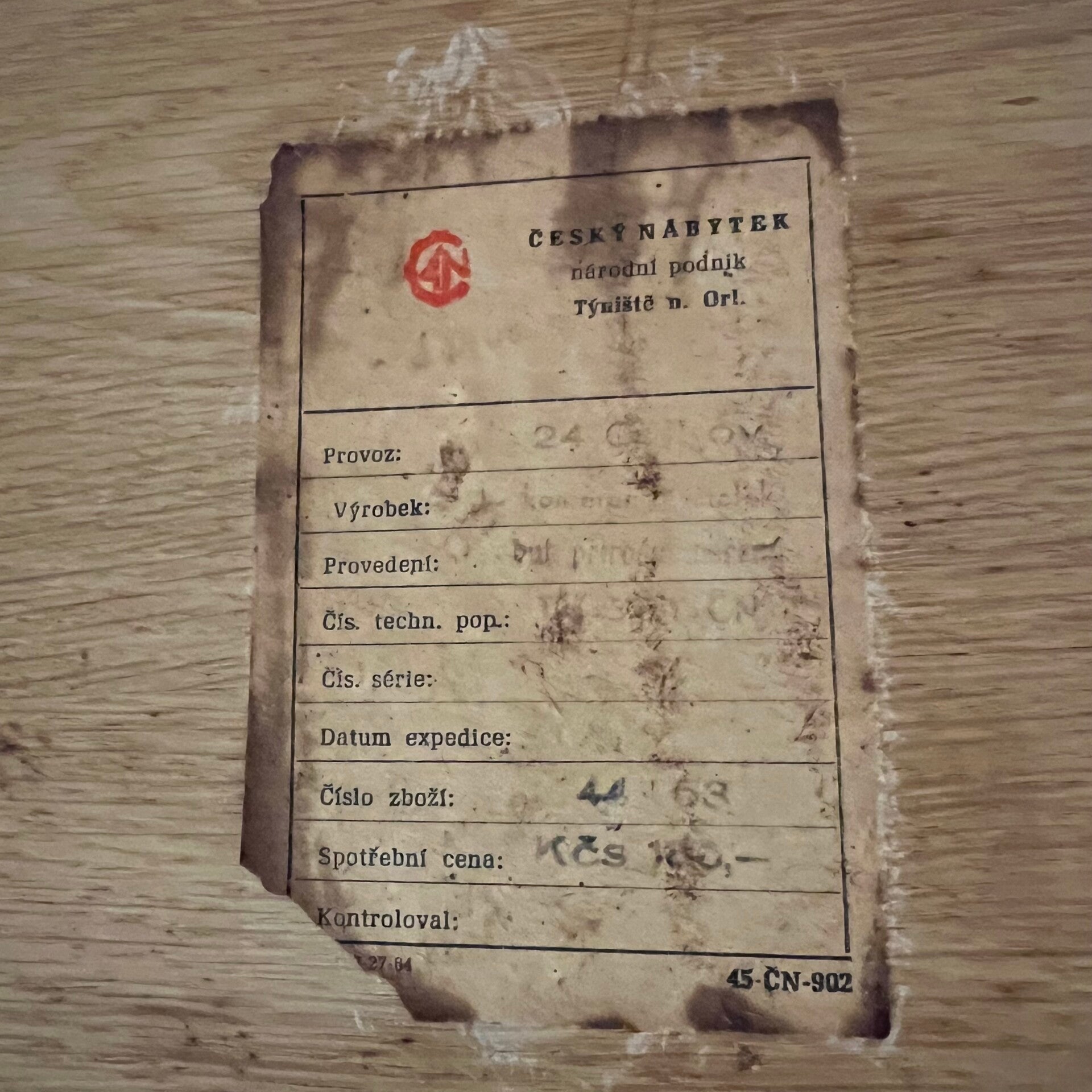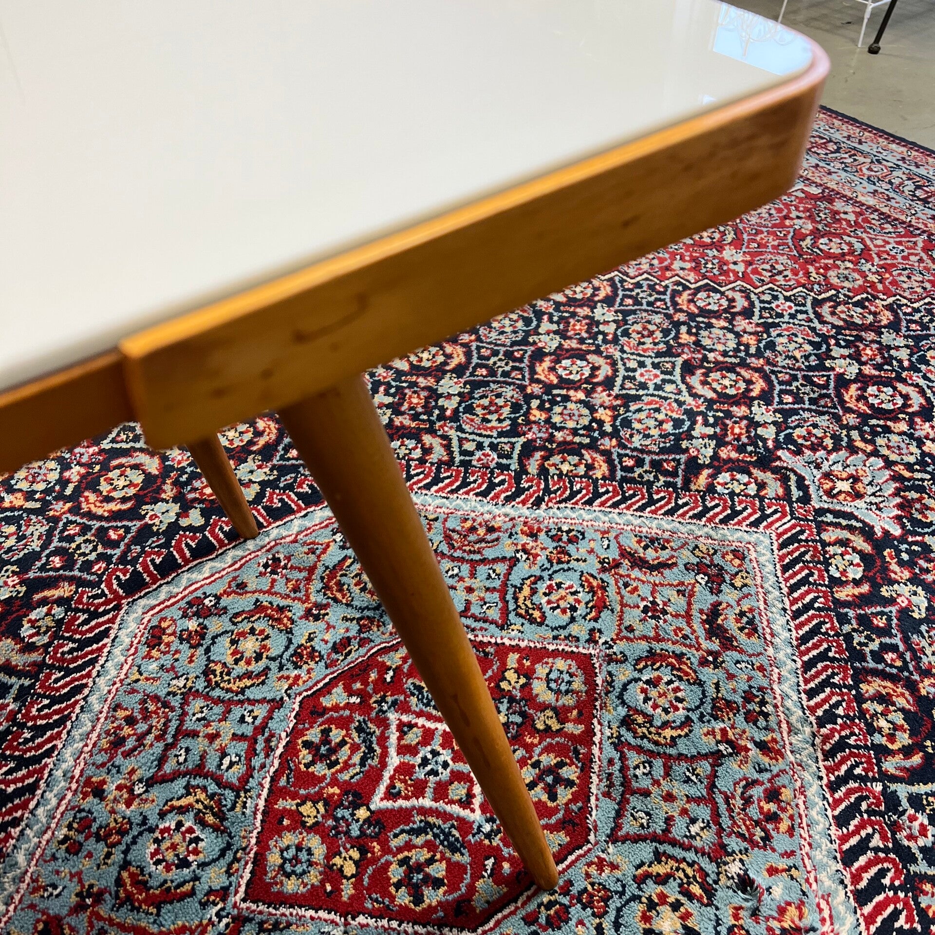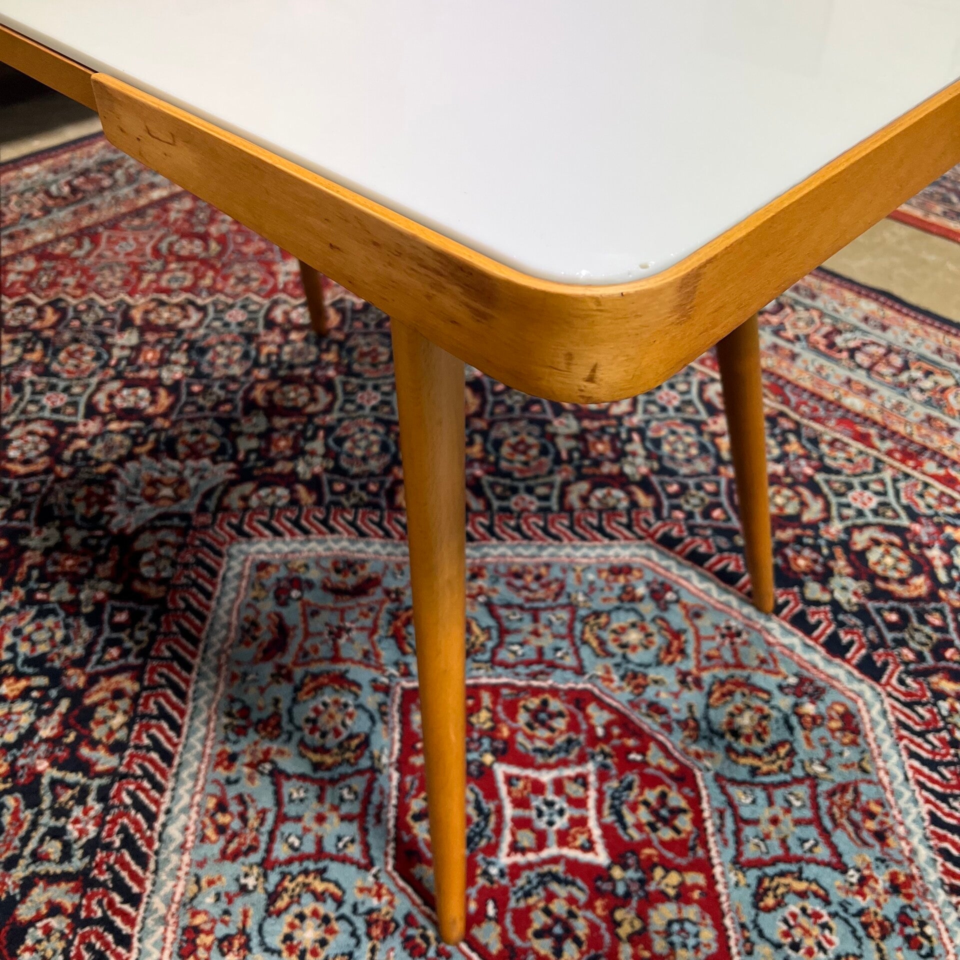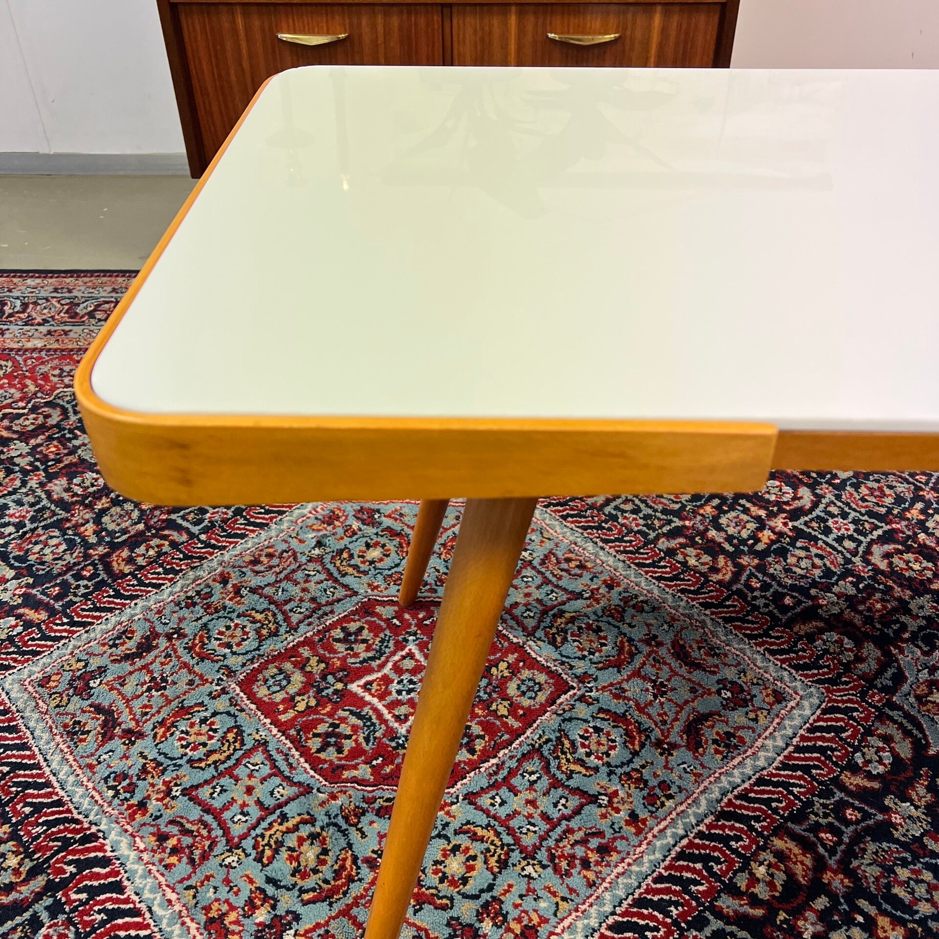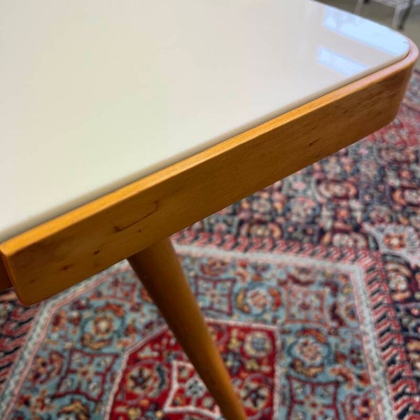 Houten (plywood) frame met demontabele conische poten en wit opaline glazen plaat.