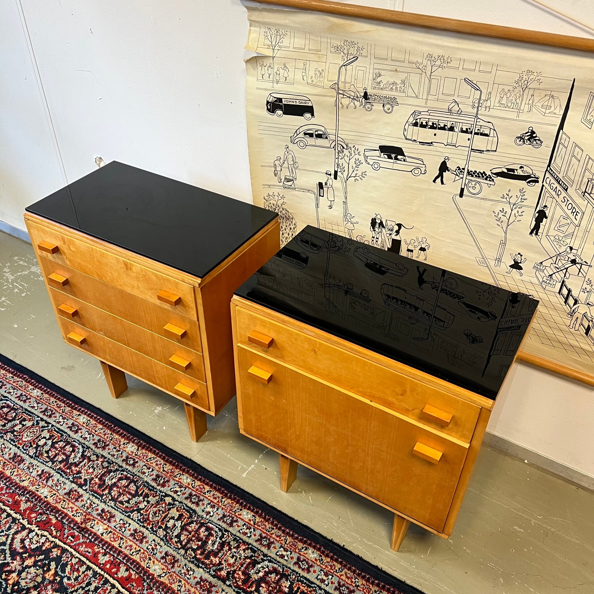 Set van 2 leuke vintage (nacht) kastjes, uitgevoerd in eiken/essenhout (fineer) met zwart glazen plaat.