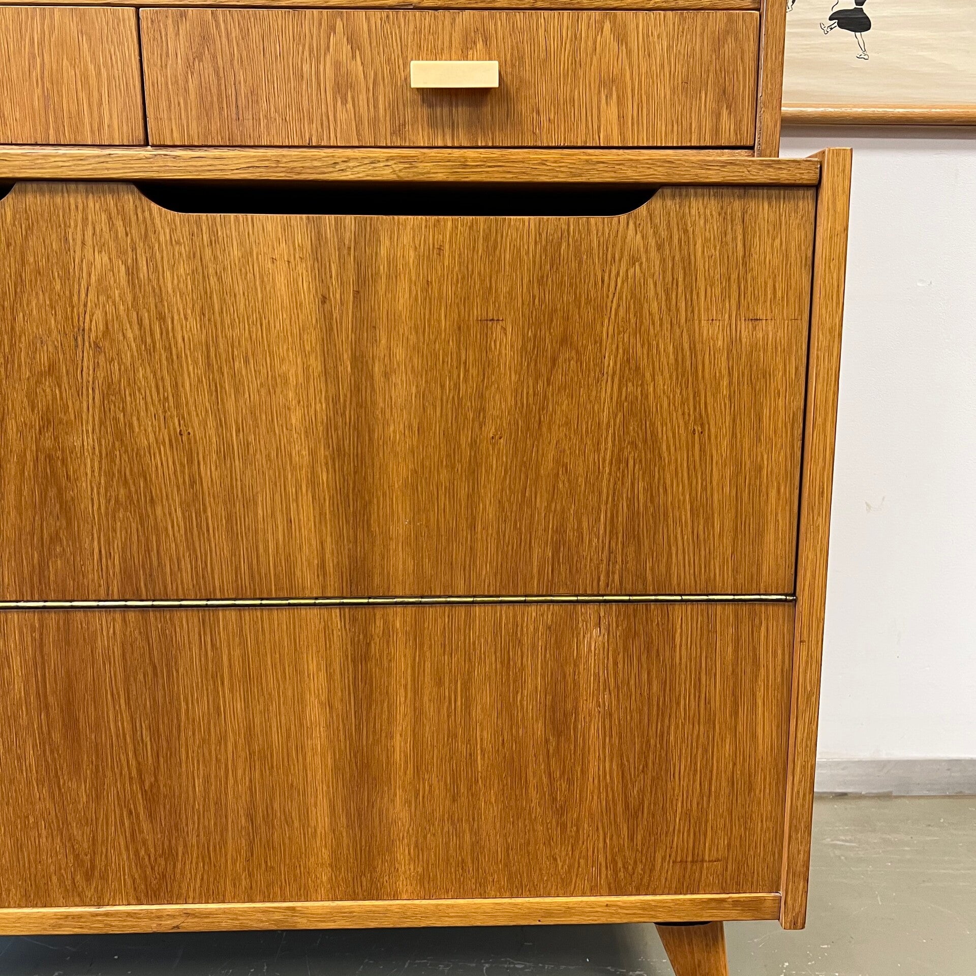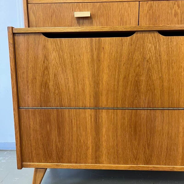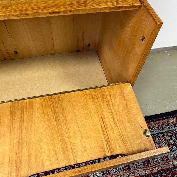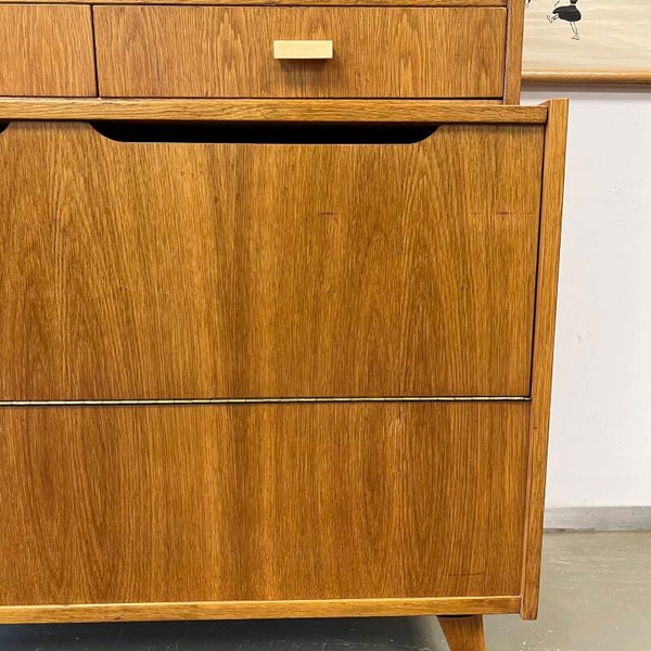 Uitgevoerd in eiken-, essen- en iepenhout met originele crèmekleurige kunststof handgrepen.