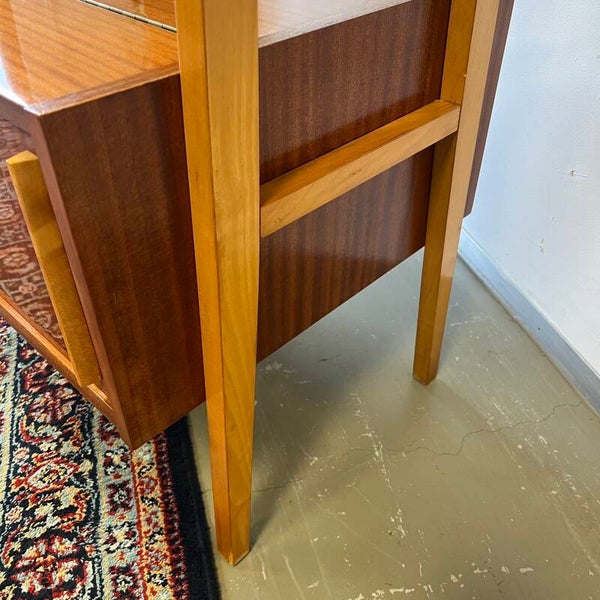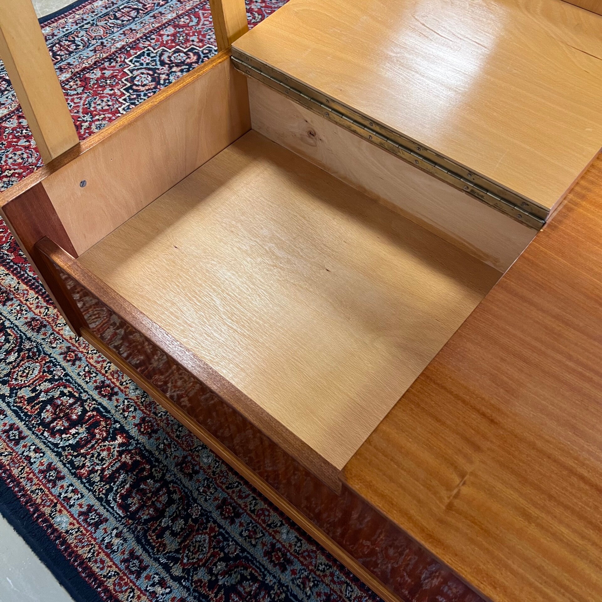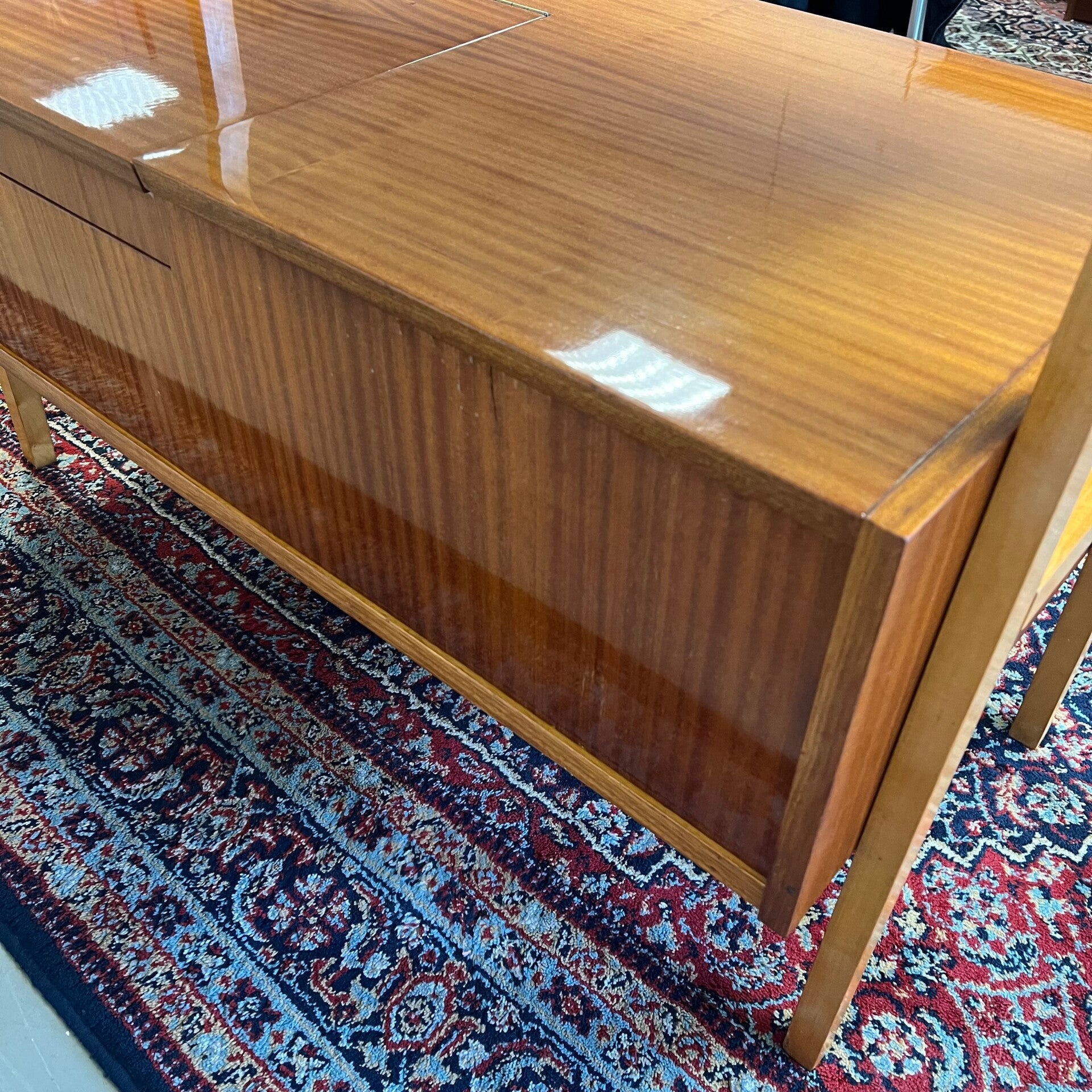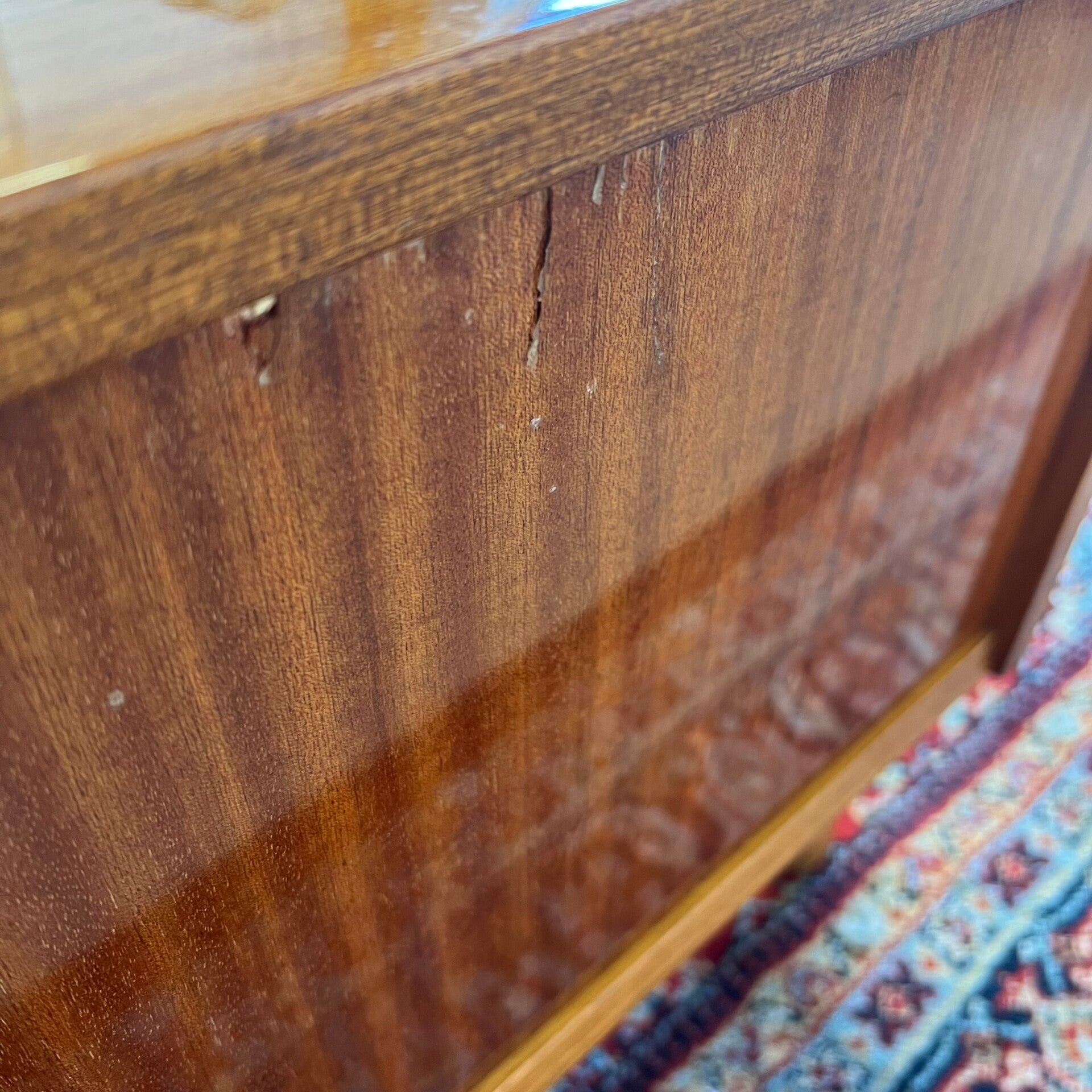 Uitgevoerd in hoogglans mahonie-, en essenhout (fineer).