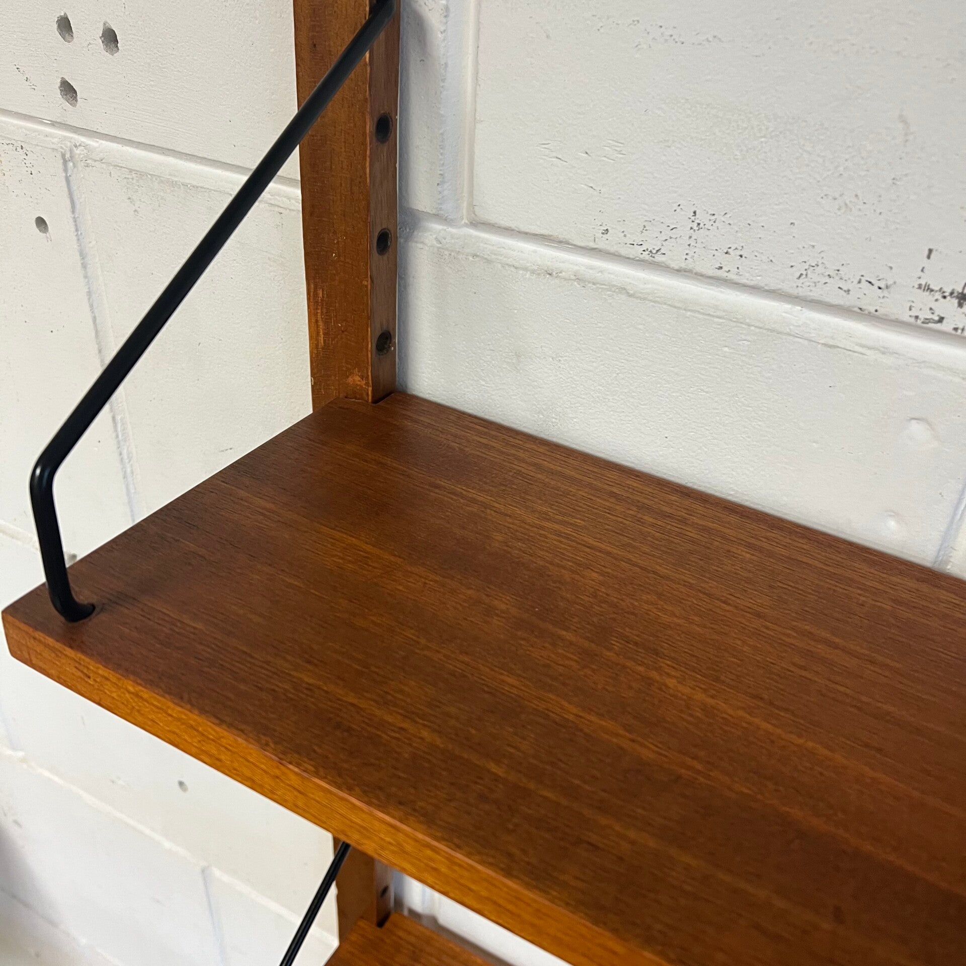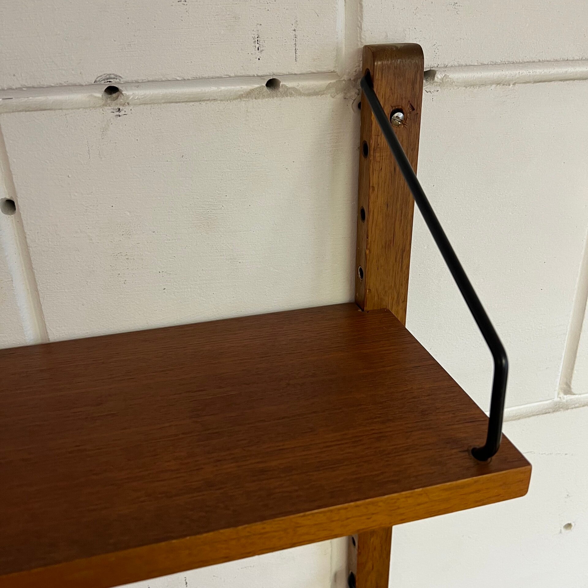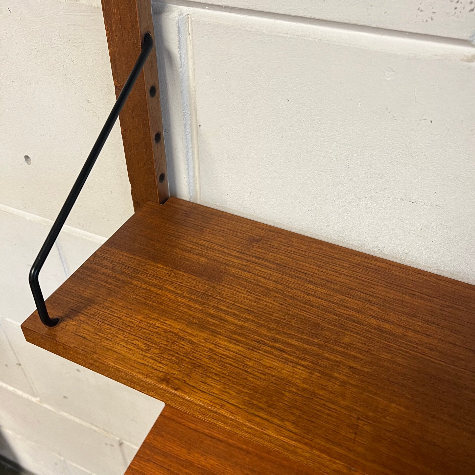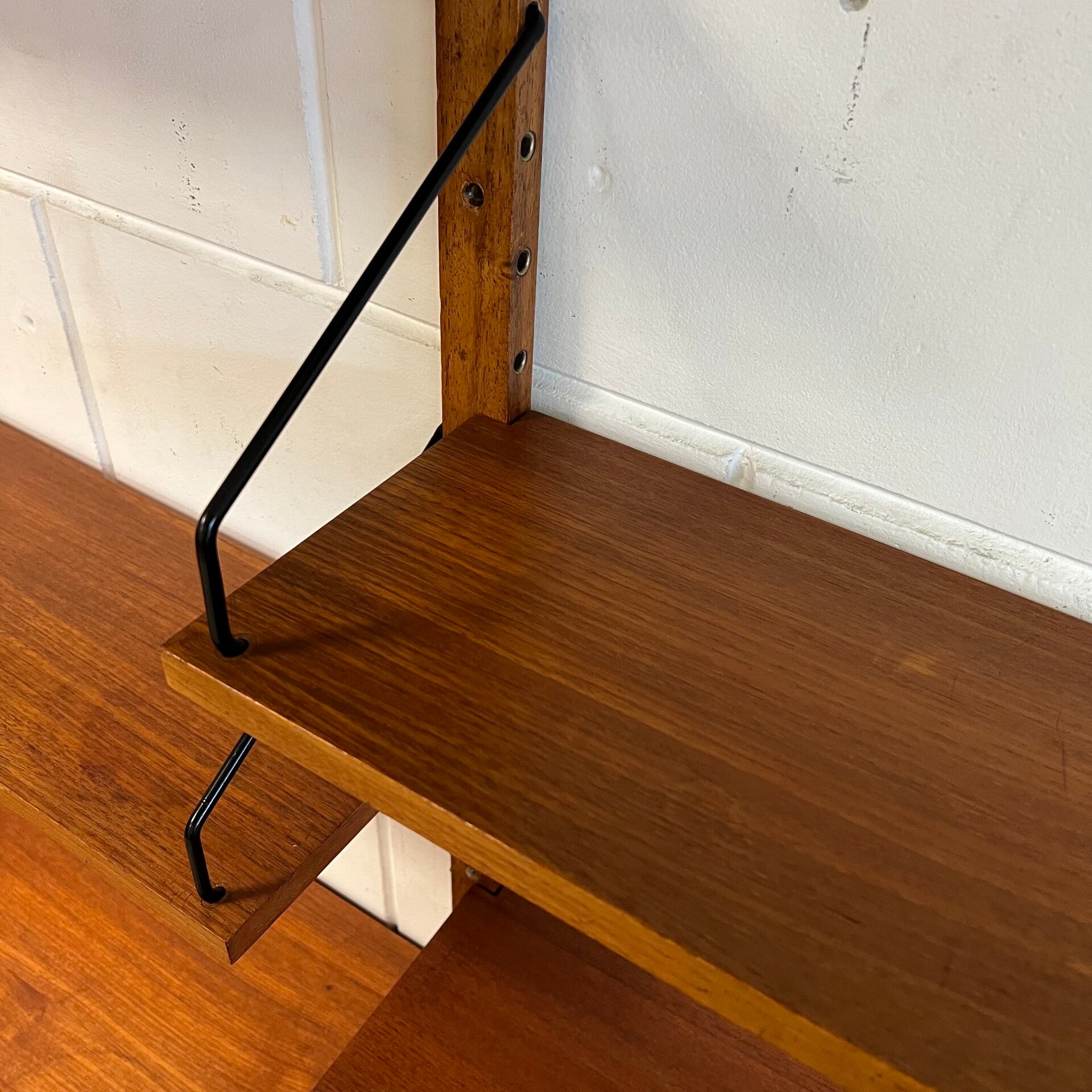 Prachtig vintage wandmeubel, wall unit uitgevoerd in teak (fineer) met zwarte wandlatten en beugels.