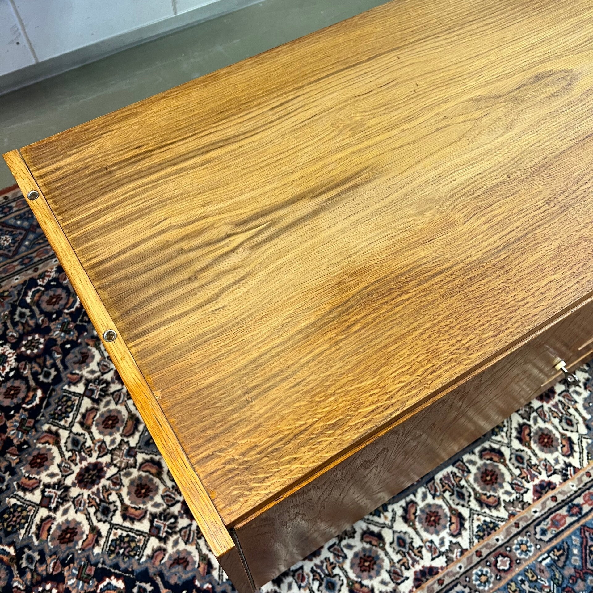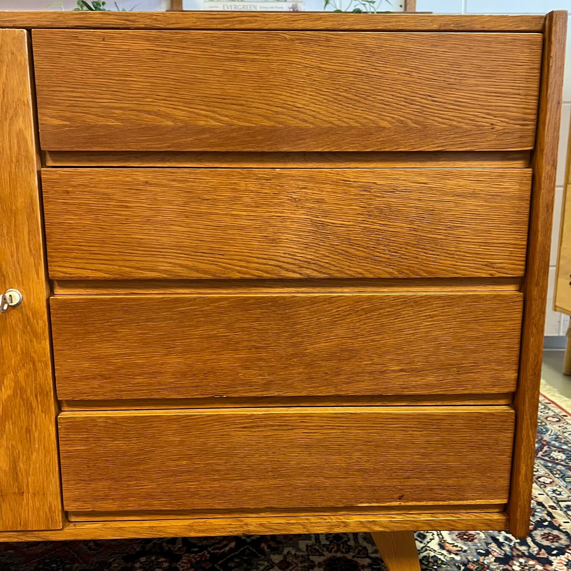 Het meubel heeft een openslaande deur met slot (sleutel aanwezig) en uitneembare plank. Rechts 4 ruime lades met originele kunststof binnenzijde.