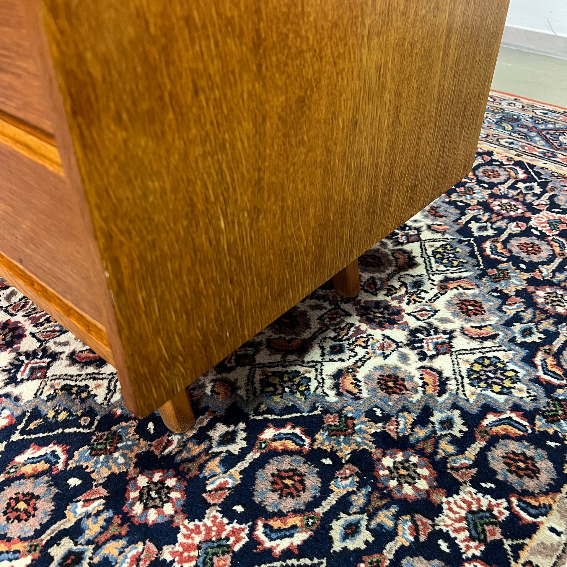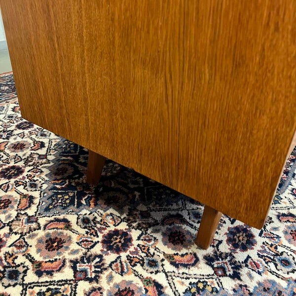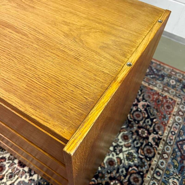 Leuk vintage design dressoir, commode of TV-, audiomeubel in eiken fineer met schuine pootjes.