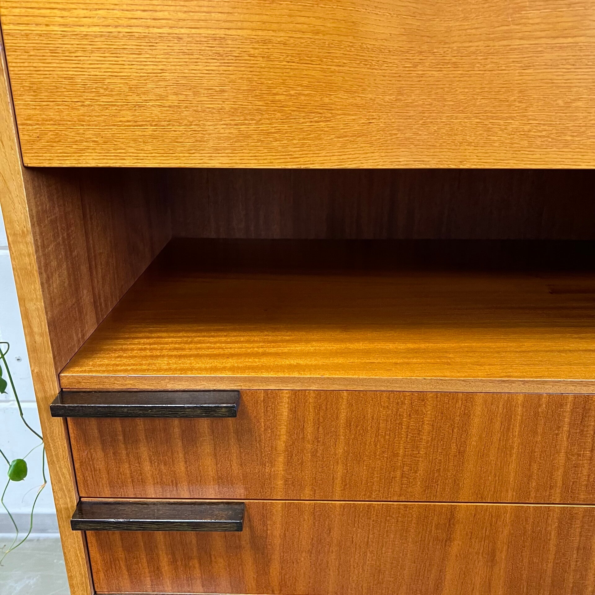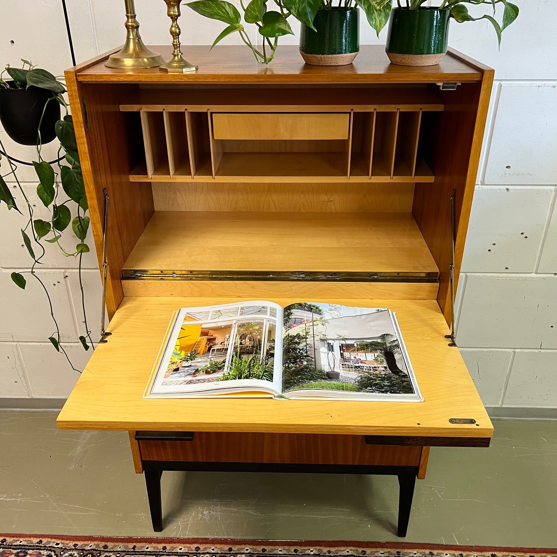 Het meubel heeft bovenin een klep met slot (sleutel aanwezig). Erachter een bureau gedeelte met vakkenplank.